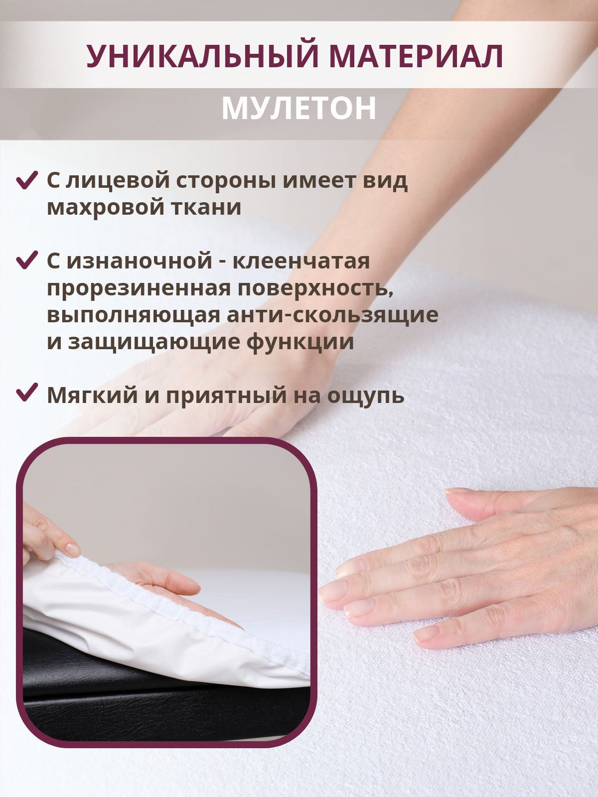 Уникальный материал Мулетон с лицевой стороны имеет вид махровой ткани, а с изнаночной - клеенчатая прорезиненная поверхность, выполняющая анти-скользящие и защищающие функции. Не скользит по кушетке. Непроницаема для жидкостей, кремов. Легко стирается в машинке. Подходит для многоразового использования. Защищает покрытие массажного стола или косметологической кушетки.