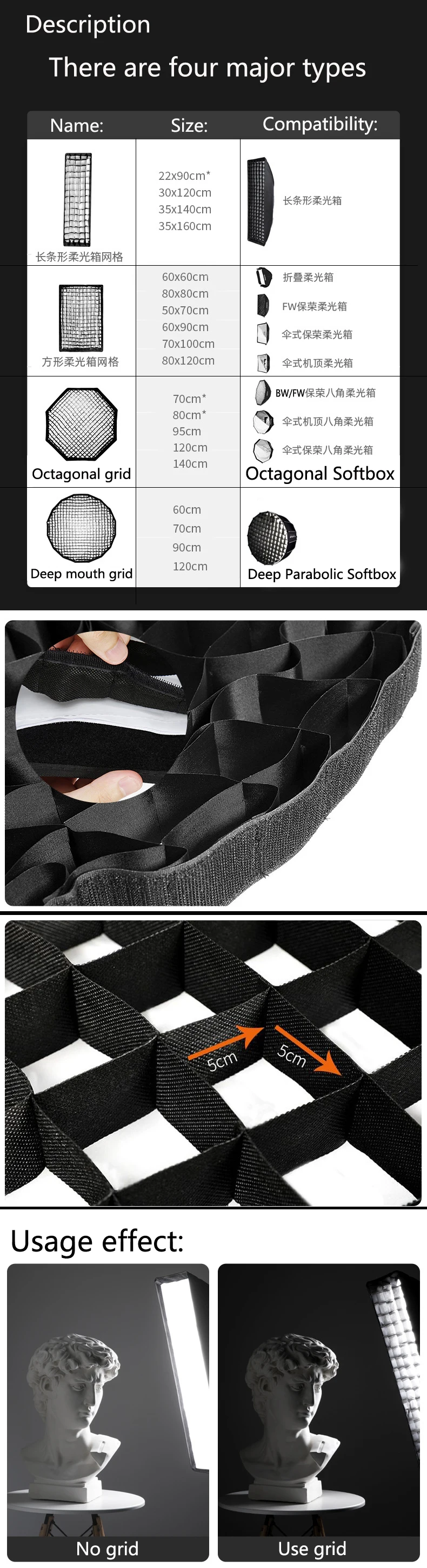 С сотовым дизайном и застежкой-лентой, сшитой по бокам, можно соответственно прикрепить к внутренней стороне софтбокса.