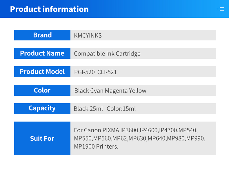 Если ваш оригинальный чернильный картридж PGI 520 CLI 521 XL, вы можете купитьPGI 520 CLI 521 XLИз нашего магазина;Если нет, не покупайте.