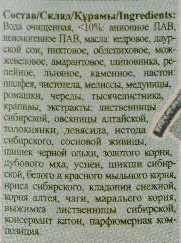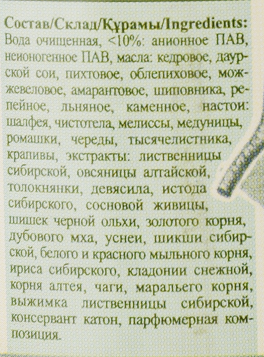 Состав: Вода очищенная, <10%: анионное ПАВ, неионогенное ПАВ, масла: кедровое, даурской сои, пихтовое, облепиховое, можжевеловое, амарантовое, шиповника, репейное, льняное, каменное, настои: шалфея, чистотела, мелиссы, медуницы, ромашки, череды, тысячелистника, крапивы, экстракты: лиственницы сибирской, овсяницы алтайской, толокнянки, девясила, истода сибирского, сосновой живицы, шишек черной ольхи, золотого корня, дубового мха, уснеи, шикши сибирской, белого и красного мыльного корня, ириса сибирского, кладонии снежной, корня алтея, чаги, маральего корня, выжимка лиственницы сибирской, консервант катон, парфюмерная композиция.