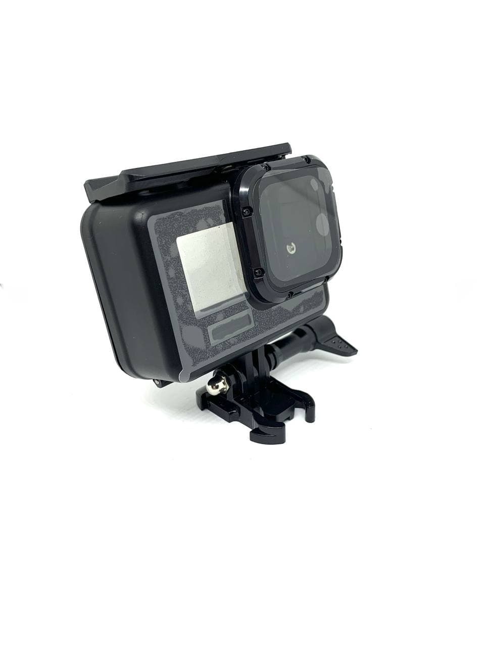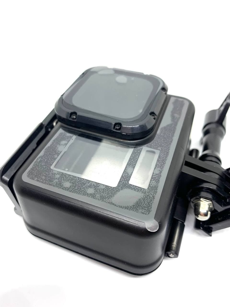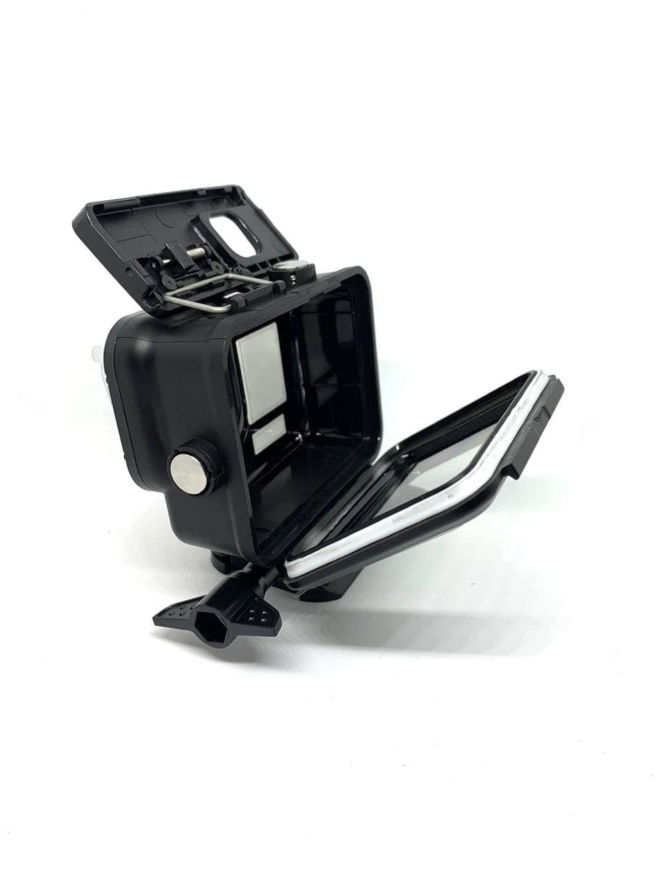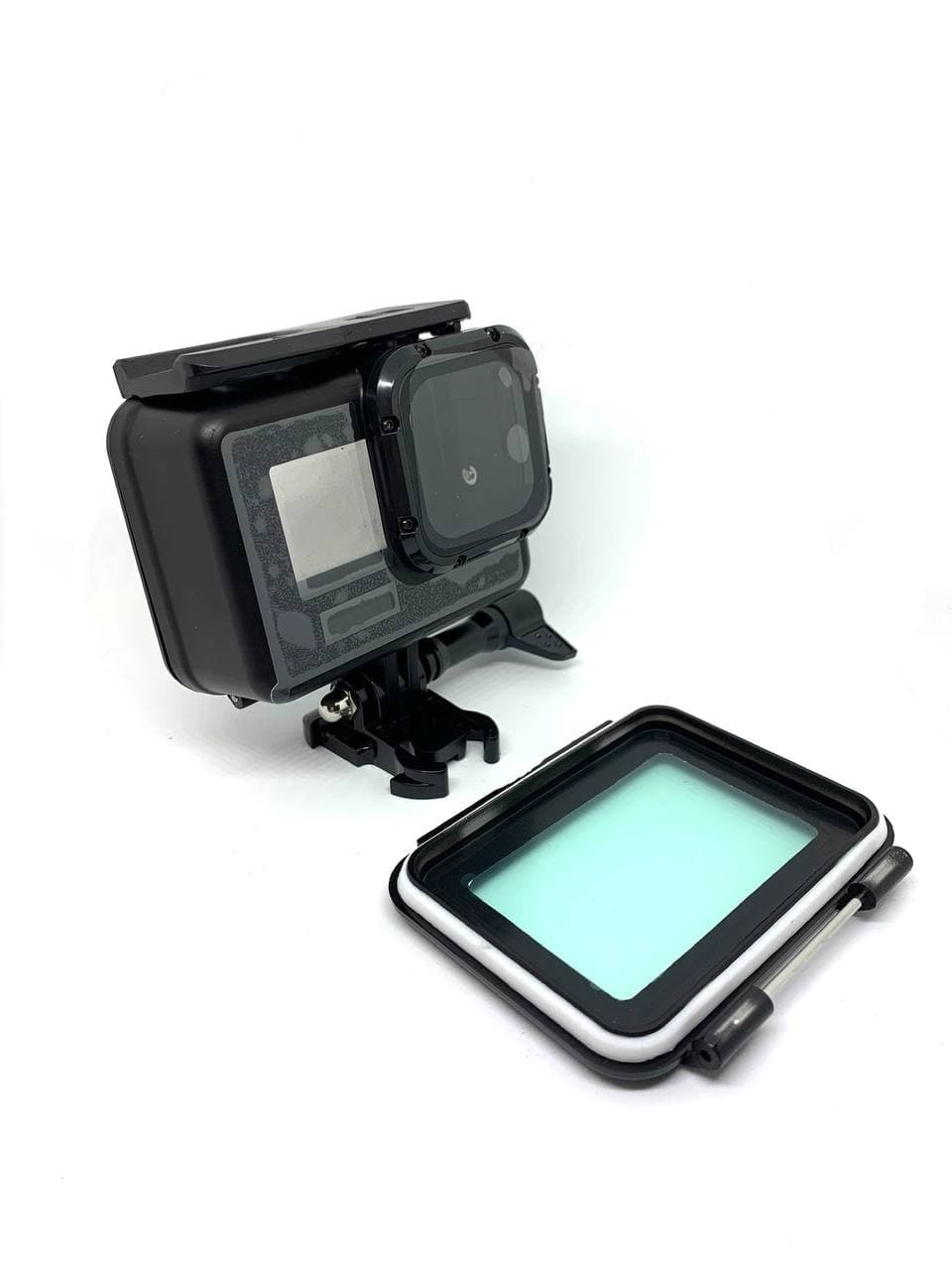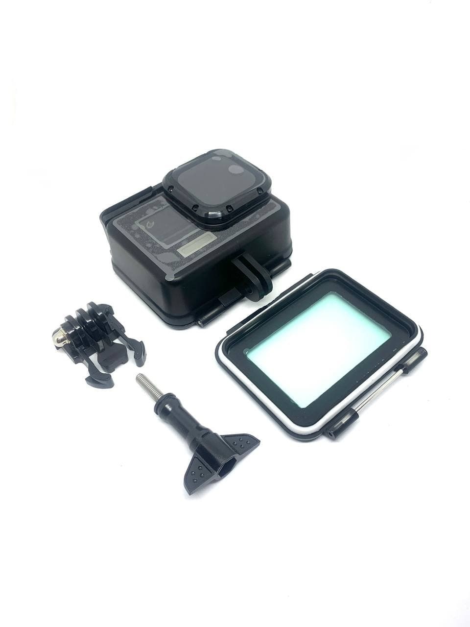 Черный антибликовый аквабокс, крепежный винт, защелка под крепления GoPro, запасная задняя крышка аквабокса для сенсорного управления камерой.
