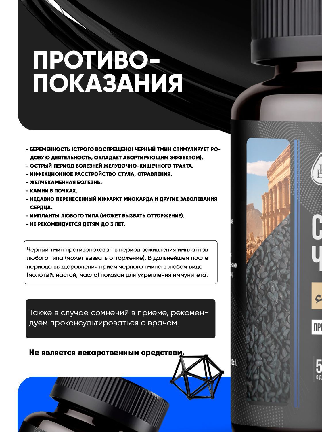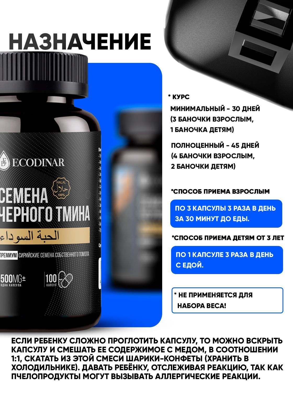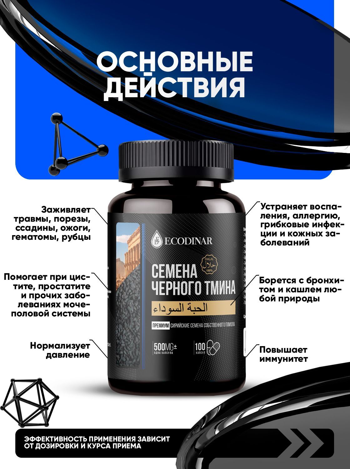Описание: Семена черного тмина используются с древних времен. Этот продукт имеет приятный аромат и богатый химический состав, применяется в лечебных целях. Продукция Экодинар создана из семян высшего сорта с соблюдением всех мировых стандартов. Показания к применению: слабый иммунитет, аллергия, профилактика онкологических состояний, ОРВИ, сахарный диабет, бактериальные и вирусные инфекции, заболевания сердечно-сосудистой системы. Тмин обладает общеукрепляющим, тонизирующим, обезболивающим, противовоспалительным свойствами, снимает спазмы, обладает противогрибковым действием, способствует оттоку слизи из дыхательных путей, разжижает мокроту и расширяет бронхи, стимулирует регенерацию тканей и заживление ран, , расширяет сосуды, понижает кровяное давление, способствует избавлению от лишнего веса. У мужчин при стабильном приеме улучшается состояние простаты, качество семенной жидкости. Для женщин нормализует гормональный фон и активизирует лимфатическую систему, ускоряет родовую деятельность. Противопоказания: индивидуальная непереносимость, беременность,  инфекционное расстройство стула, отравление,  желчно-каменная болезнь, камни в почках, детям до 3 лет. Дозировка: принимать по 3 капсулы 3 раза в день за 30 минут до еды.