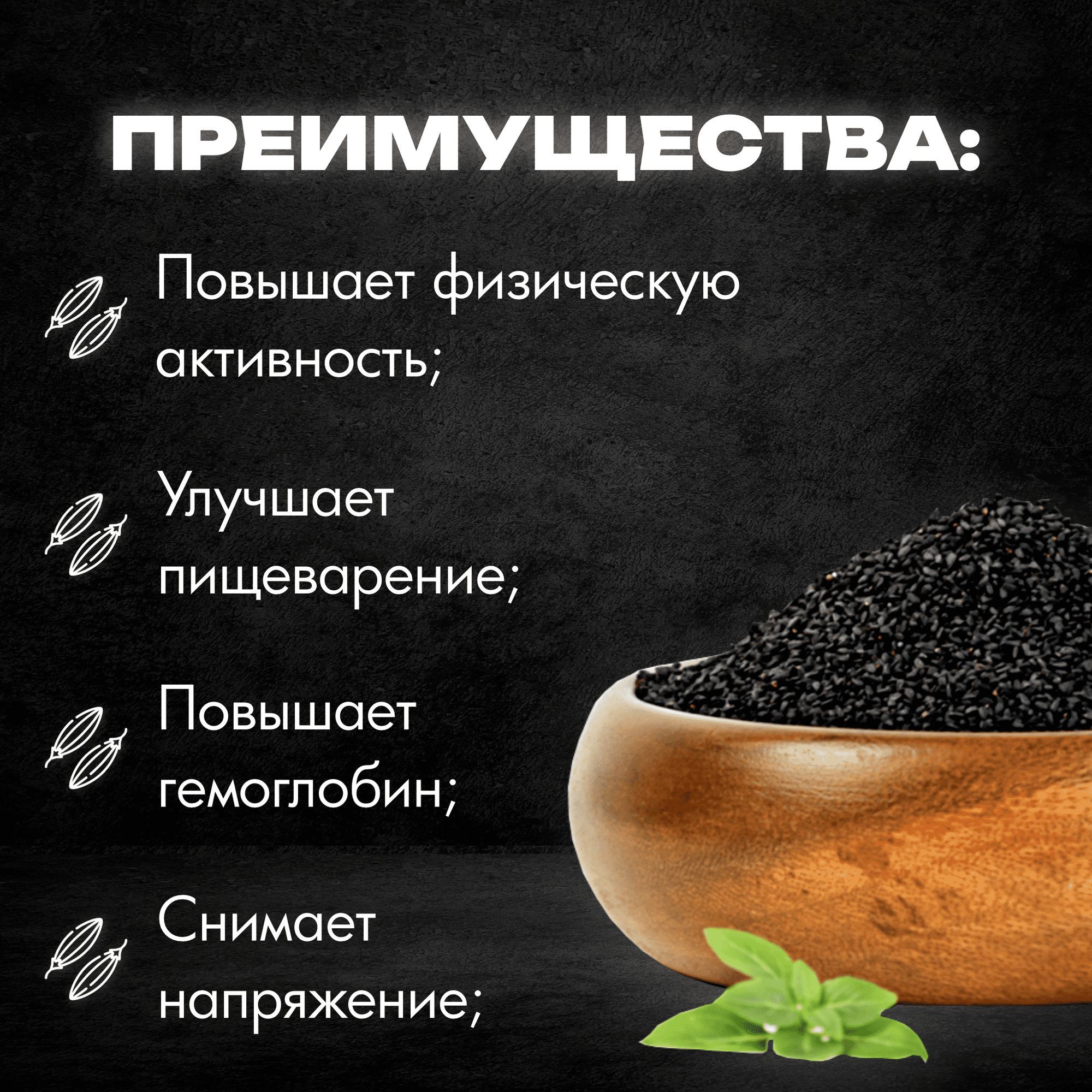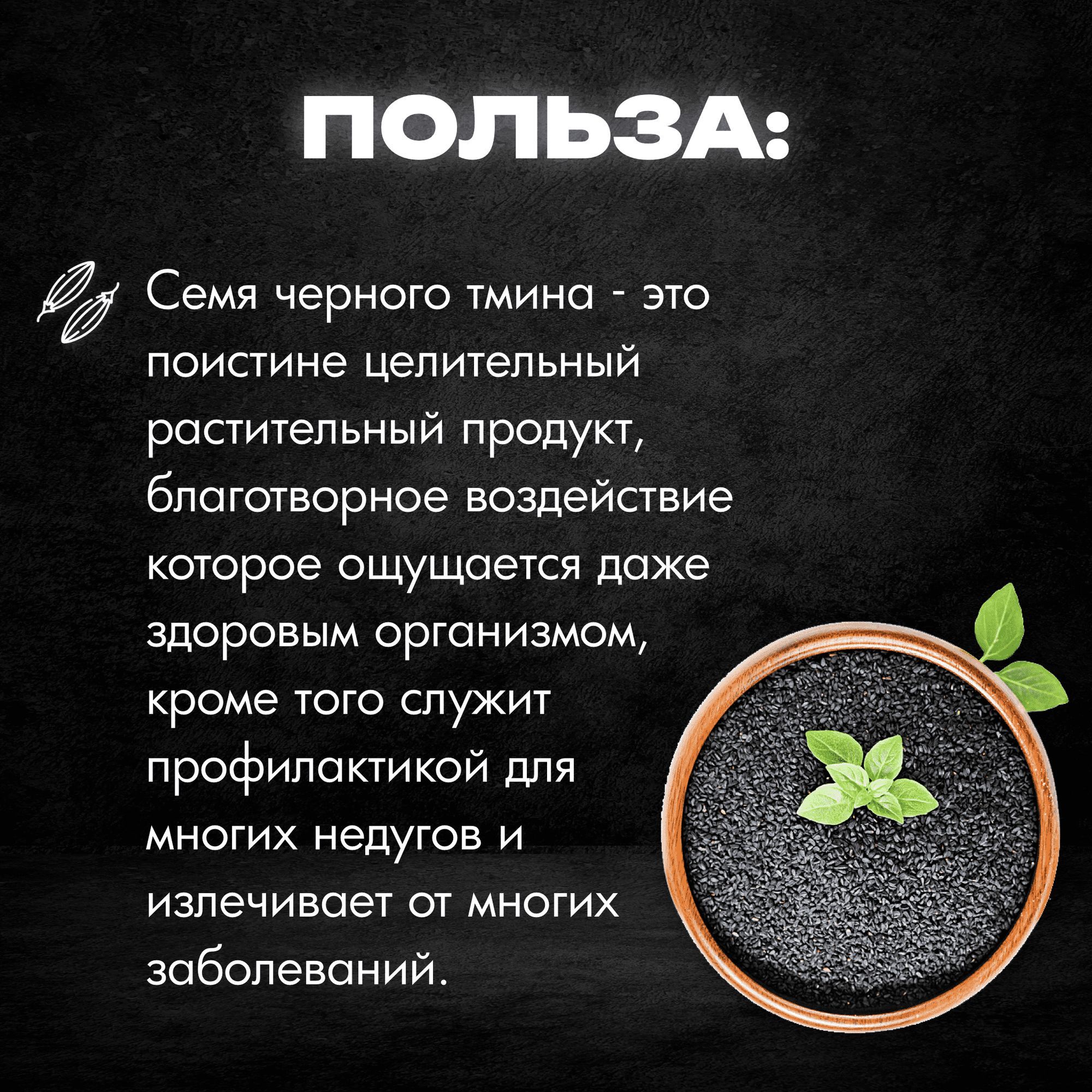 Описание: Текстовое описание изображенияЧерный тмин семена - это нигелла или семена калинджи, седана, которые используются в качестве специи и приправы в различных блюдах. Они обладают ярко выраженным ароматом и вкусом, который может напоминать анис. Они используются в кулинарии сотни лет и широко применяются в блюдах средневосточной, индийской и североафриканской кухни. Черный тмин семена содержат множество полезных веществ, таких как витамины, минералы и антиоксиданты, которые делают эту специю не только вкусной, но и полезной для здоровья. Текст при отключенной в браузере загрузке изображенийСемя и масло черного тмина – это поистине целительный растительный продукт, благотворное воздействие которое ощущается даже здоровым организмом, кроме того служит профилактикой для многих недугов и излечивает от многих заболеваний. Уникальные свойства черного тмина и его целительное действие в своих трудах описывал даже Гиппократ и Диоскорид. В арабских странах семя черного тмина на протяжении многих столетий и до настоящего времени употребляют в пищу два раза в день на постоянной основе.Текст при отключенной в браузере загрузке изображенийПолезные свойства✔ активно стимулирует работу иммунитета