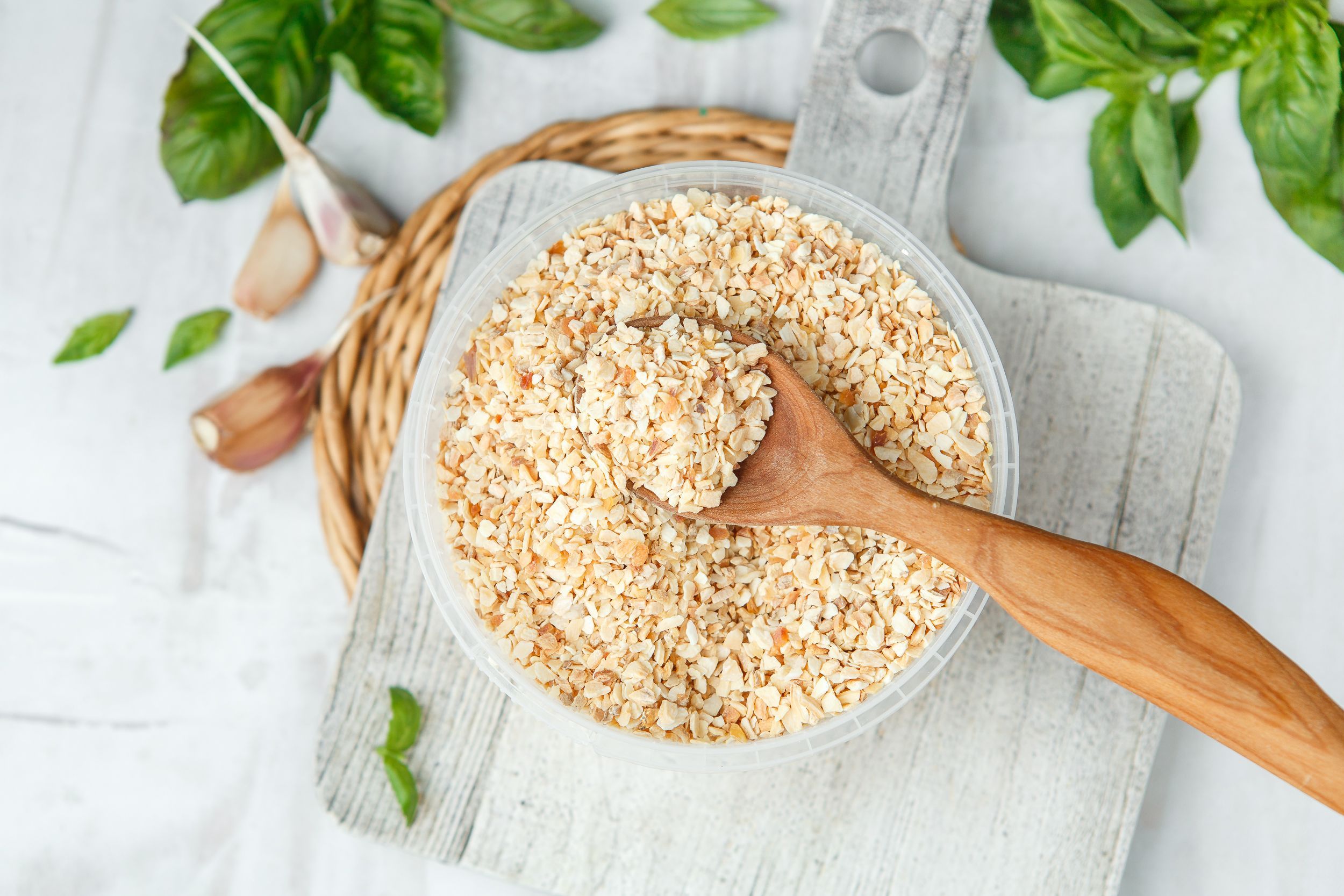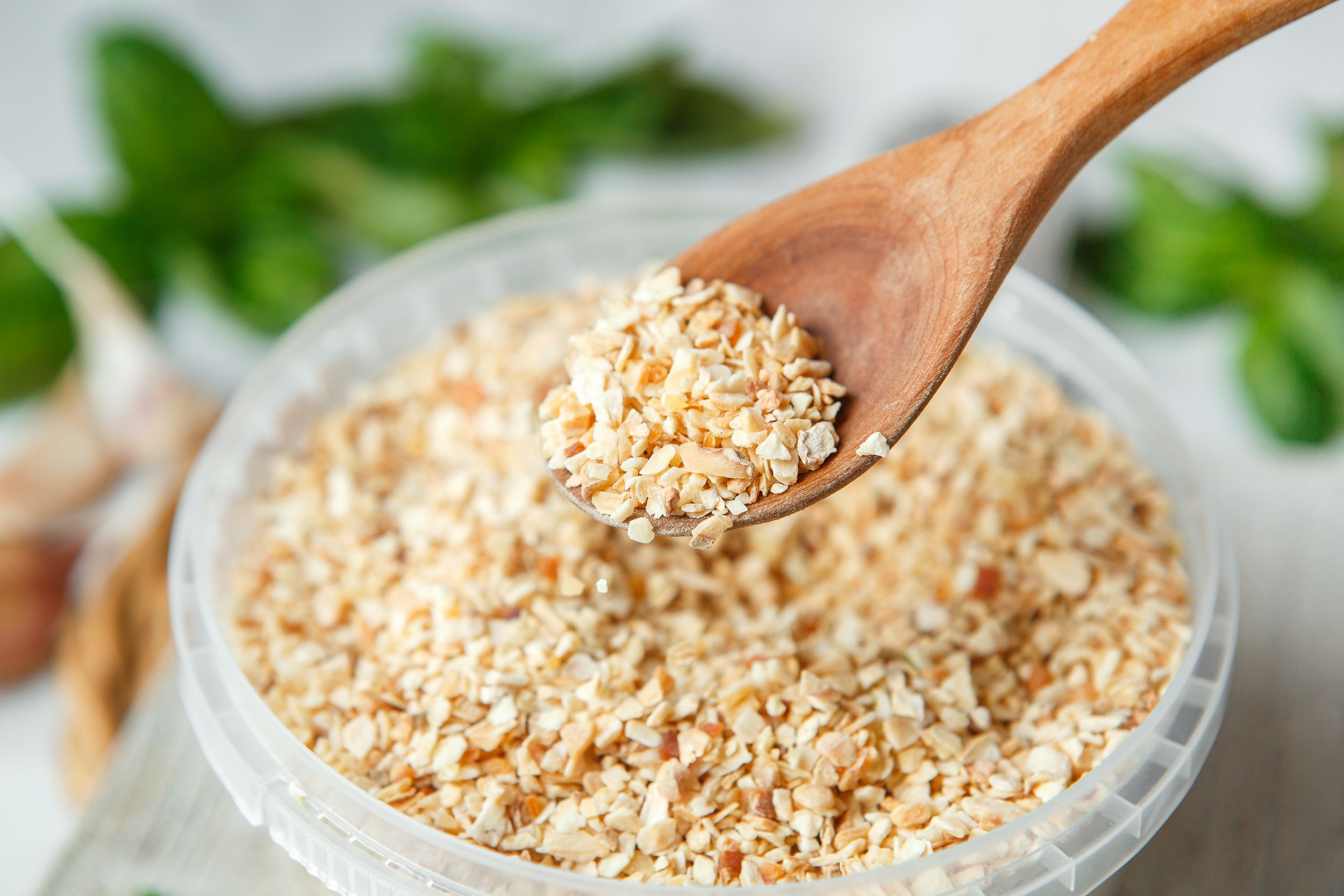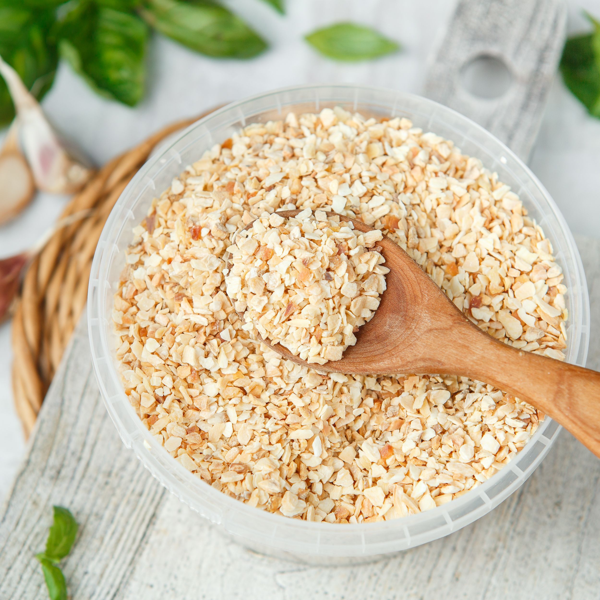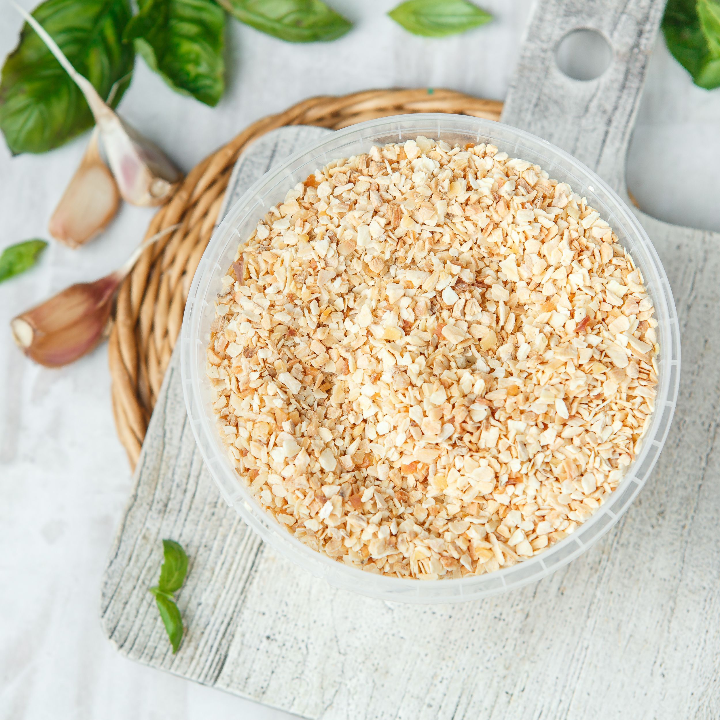 Гранулированный сушеный чеснок - универсальная пряность для любых блюд! Гранулы сушеного чеснока - продукт, полученный путём дробления высушенных очищенных долек чеснока. Такой чеснок очень удобно добавлять в консервированные овощи, соусы, кетчупы, колбасные изделия и мясопродукты, во многие пряные смеси. В кулинарии чеснок применяют в салатах, супах, соусах, мясных, крупяных, овощных, грибных, рыбных, мучных, яичных блюдах, а также в солениях, квашениях, маринадах, которые чеснок ароматизирует и предохраняет от порчи.
