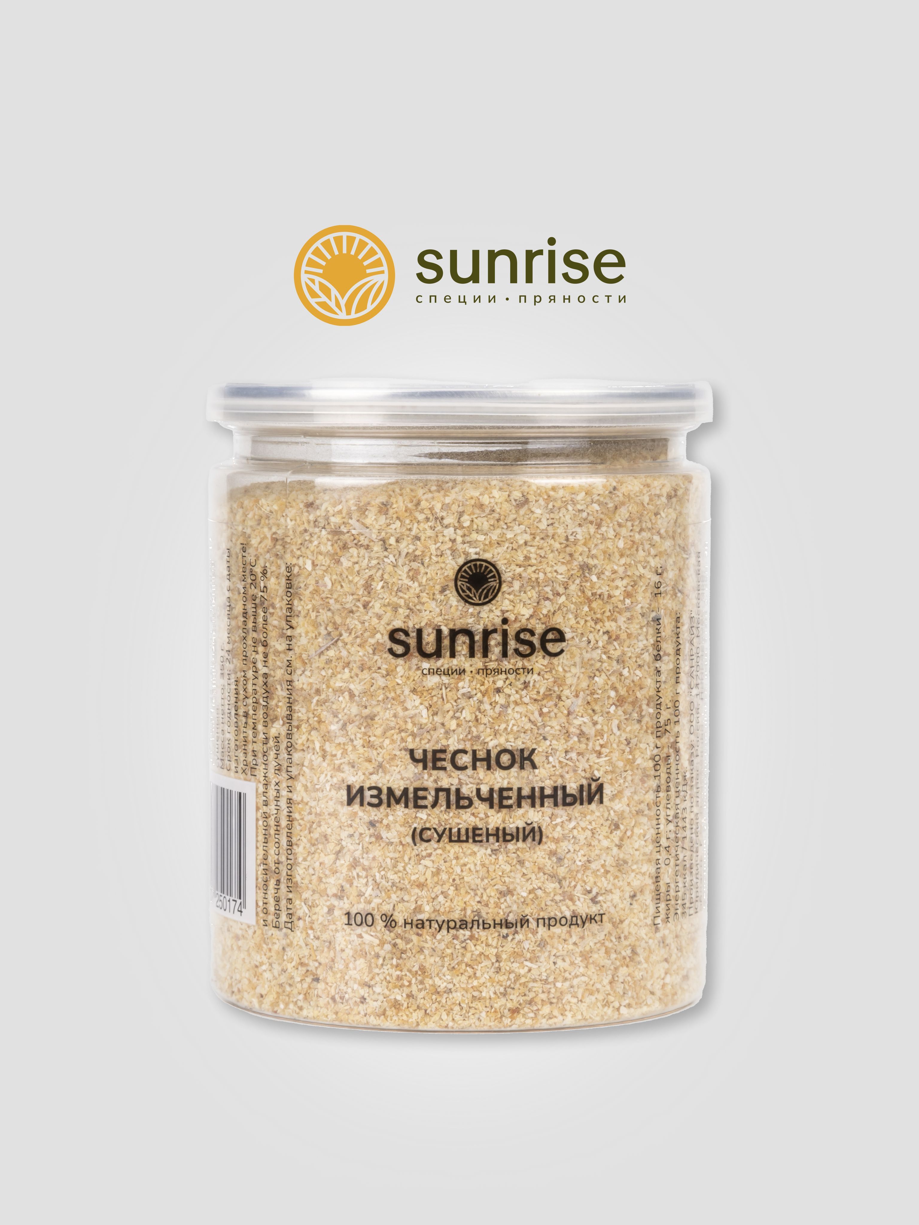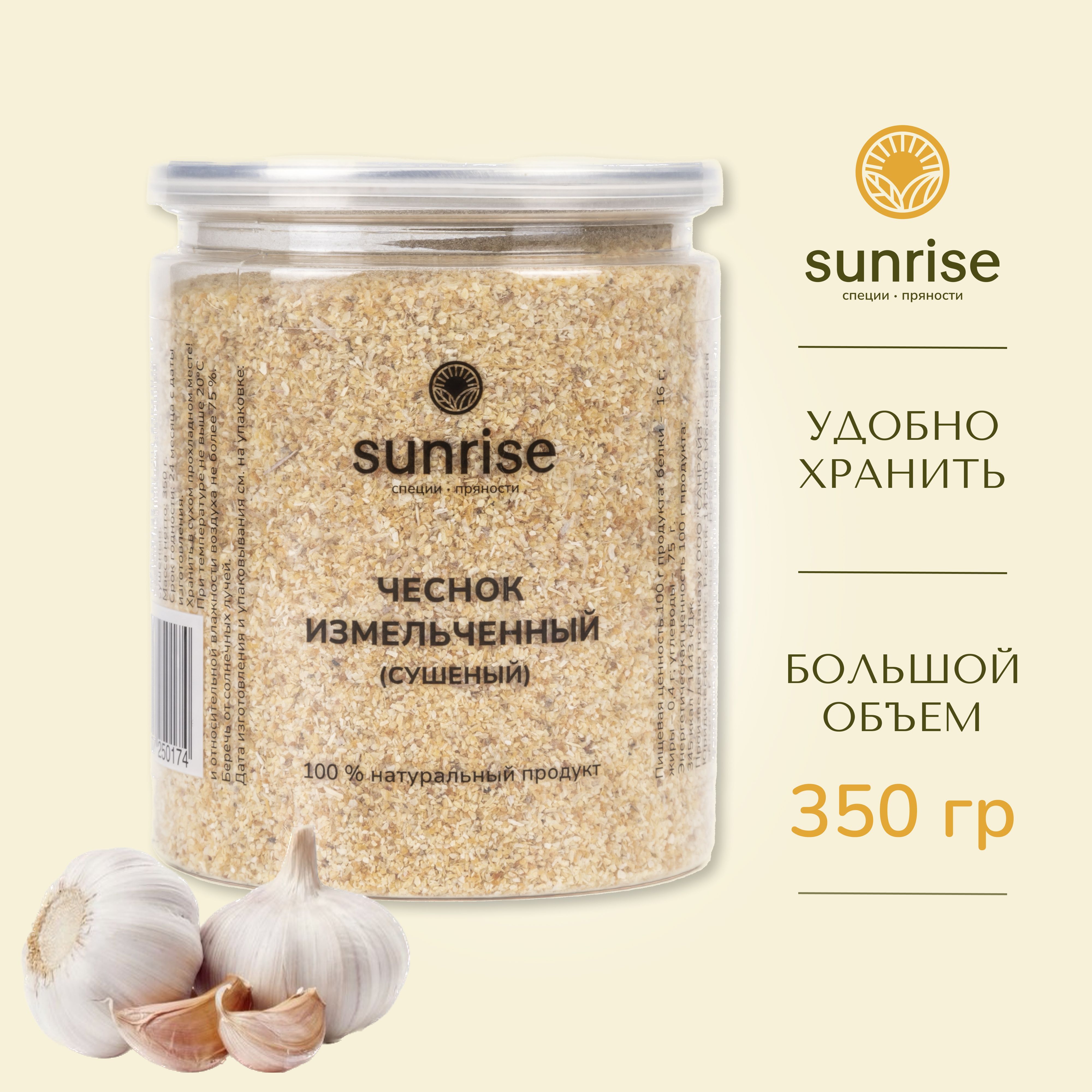 Чеснок Sunrise spices изготовлен из отборных зубчиков чеснока, которые были высушены и измельчены до состояния порошка. Это позволяет сохранить все полезные свойства чеснока и использовать его в различных рецептах.