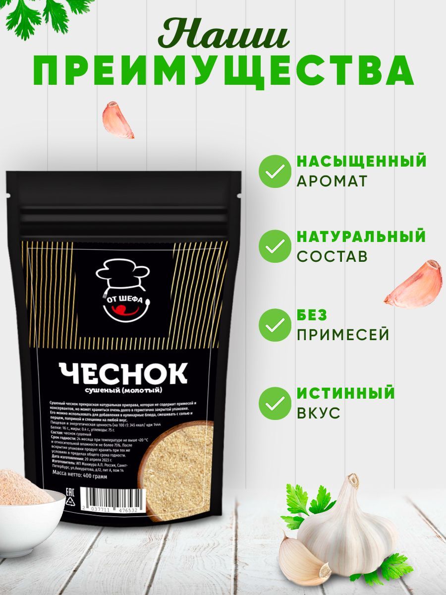 Описание: Чеснок сушеный гранулированный - это продукт, полученный путем дробления высушенных очищенных долек чеснока высочайшего качества. Среди всех сушёных овощей гранулы чеснока - самая востребованная позиция. Продукт подходит для мясных и рыбных блюд, соусов и маринадов, супов и салатов, овощной консервации. Восхитительная пикантность без границ! Вкус и запах абсолютно идентичны свежему чесноку. Регулярное употребление сушеного чеснока снижает артериальное давление и уровень холестерина.