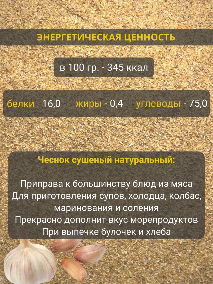 Описание: Чеснок сушеный молотый натуральный- получен путем измельчения зубчиков свежего чеснока до гранул;