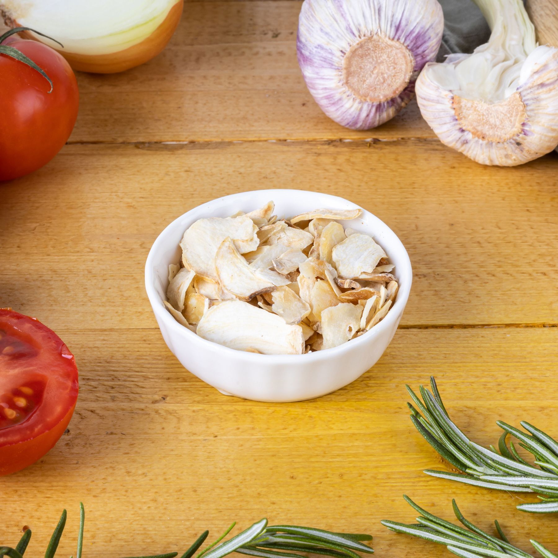 Описание: Сушеный чеснок - это незаменимый ингредиент для любого повара, который ценит насыщенный аромат и острый вкус. Он обладает множеством полезных свойств, таких как улучшение пищеварения, повышение иммунитета и снижение уровня холестерина в крови. Богатый аромат и вкус чеснока подчеркивает главный вкус блюда, и добавляет ему неповторимую нотку свежести.