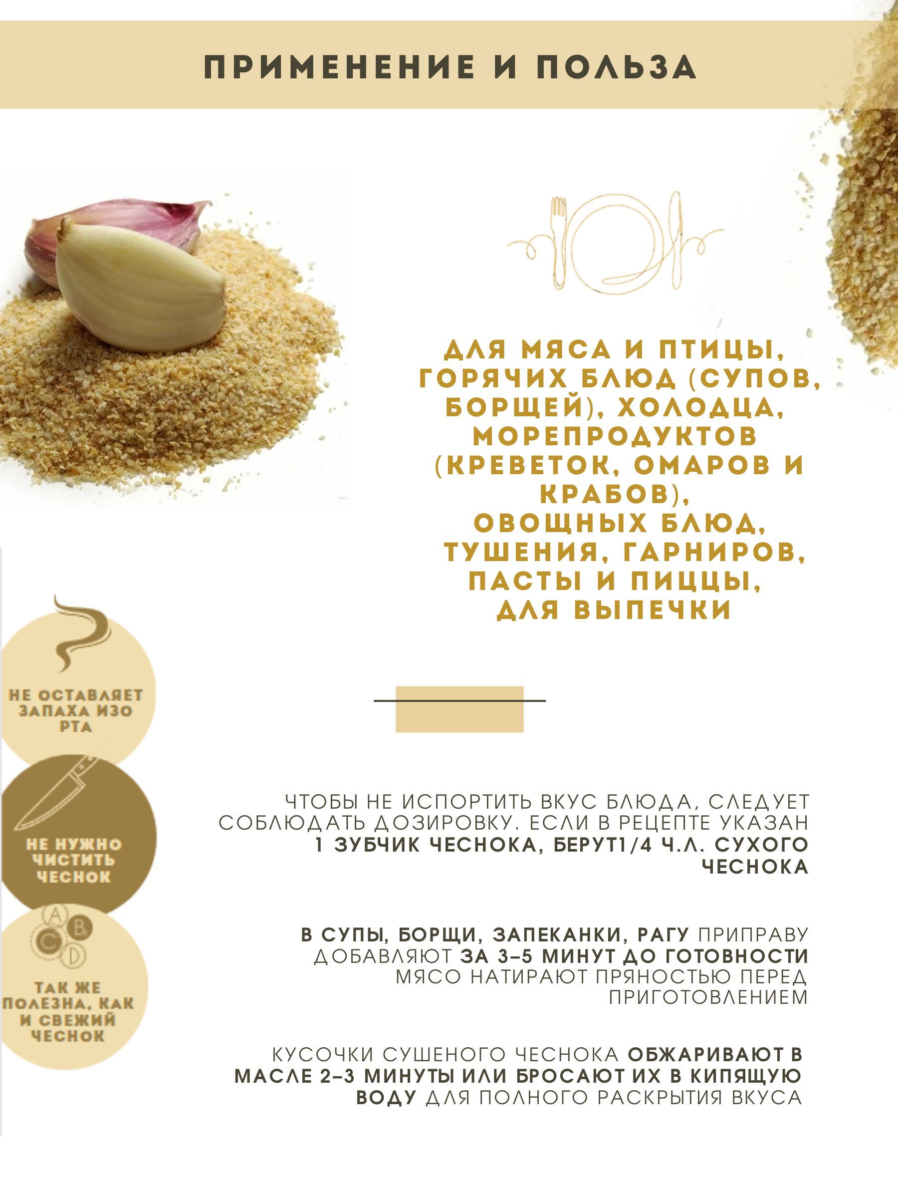Описание: Чеснок сушеный молотый - это одна из самых универсальных приправ. Чеснок гранулированный используется как приправы и специи для мяса, для птицы, для холодца, для различных соусов, супов, маринадов, консервирования овощей. Он не карамелизуется и не сгорает при обжаривании на сильном огне, как это происходит с чесноком в свежем виде. Один из самых популярных маринадов для курицы или мяса — сушеный чеснок с йогуртом и соевым соусом. Чеснок гранулированный сушеный имеет вкус и запах абсолютно идентичный свежему чесноку, но он обладает более тонким и «спокойным» вкусом и не вызывает жжения во рту. Сухой чеснок молотый сохраняет практически все полезные свойства свежего растения: витамины группы В, С, Е, К и микроэлементы — цинк, железо, марганец, калий, кальций. Сухой чеснок благодаря наличию фитонцидов быстро и эффективно избавляет человека от множества болезнетворных микробов, регулярное добавление в блюда приправы чеснок сушеный молотый натуральный оказывает профилактику гриппа и ОРВИ в сезон простуд.