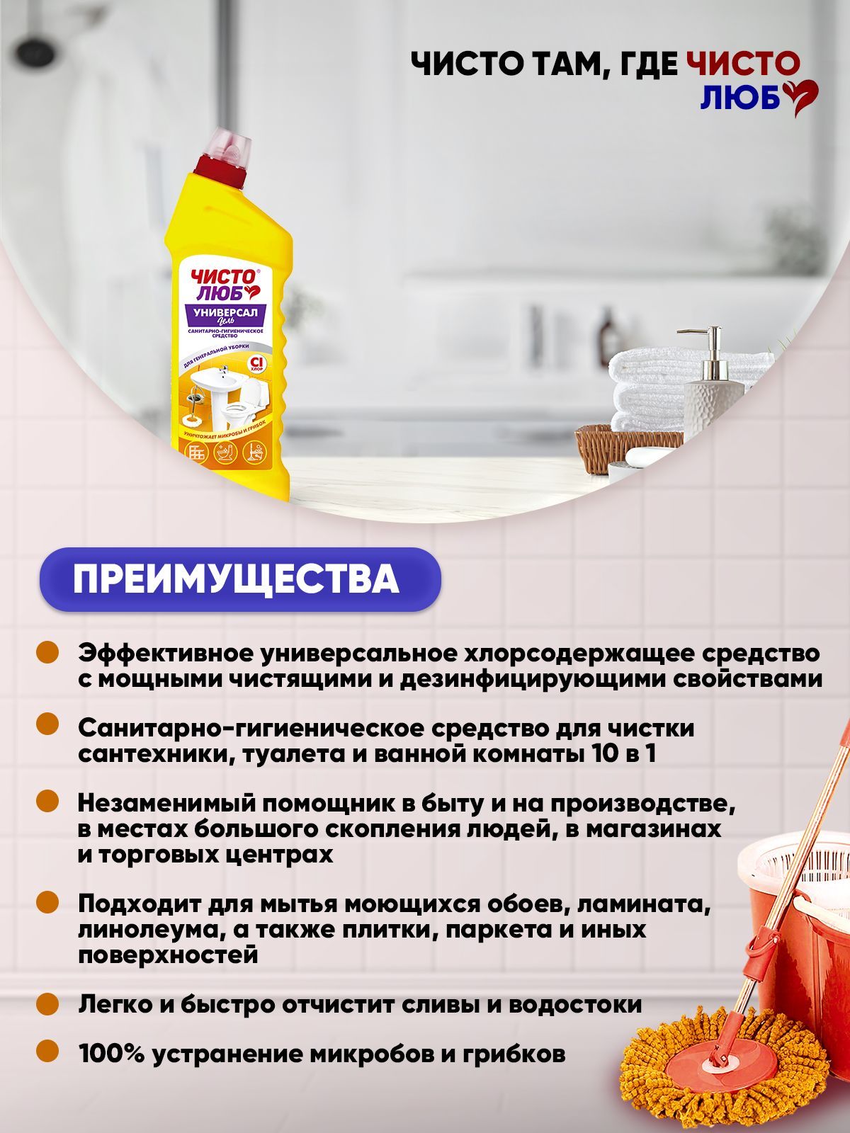 Описание: Санитарно-гигиеническое средство для чистки сантехники, туалета и ванной комнаты 10 в 1. Одно средство Универсал заменит 10 специальных чистящих средств для разных поверхностей и областей применения: легко и быстро отчистит раковины, ванны и душевые кабины, унитазы, сливы и водостоки, керамическую плитку, любые твердые моющиеся напольные покрытия, настенные панели, моющиеся обои, бытовую технику. Средство универсальное для чистки уничтожает микробы, грибок, неприятные запахи. Средство для сантехники универсально и подойдет для уборки всего дома. Универсальное чистящее средство для уборки дома- ваш личный помощник при проведении генеральной уборки. Гель для уборки «Чистолюб» - эффективное универсальное хлорсодержащее средство с мощными чистящими и дезинфицирующими свойствами. Способ применения: Применение неразбавленным: унитаз – нанести средство под ободок унитаза и оставить на ночь; Раковины и ванны – обработать с помощью средства и щетки, через 2-3 минуты тщательно смыть водой; кафель – нанести средство с помощью губки на поверхность и смыть через 2-3 минуты, для снятия устойчивых загрязнений операцию повторить; сливы и водостоки - налить 50мл средства в сливное отверстие для дезинфекции и устранения запахов. Применение разбавленным: полы и рабочие поверхности – 50мл средства на 5 л воды.