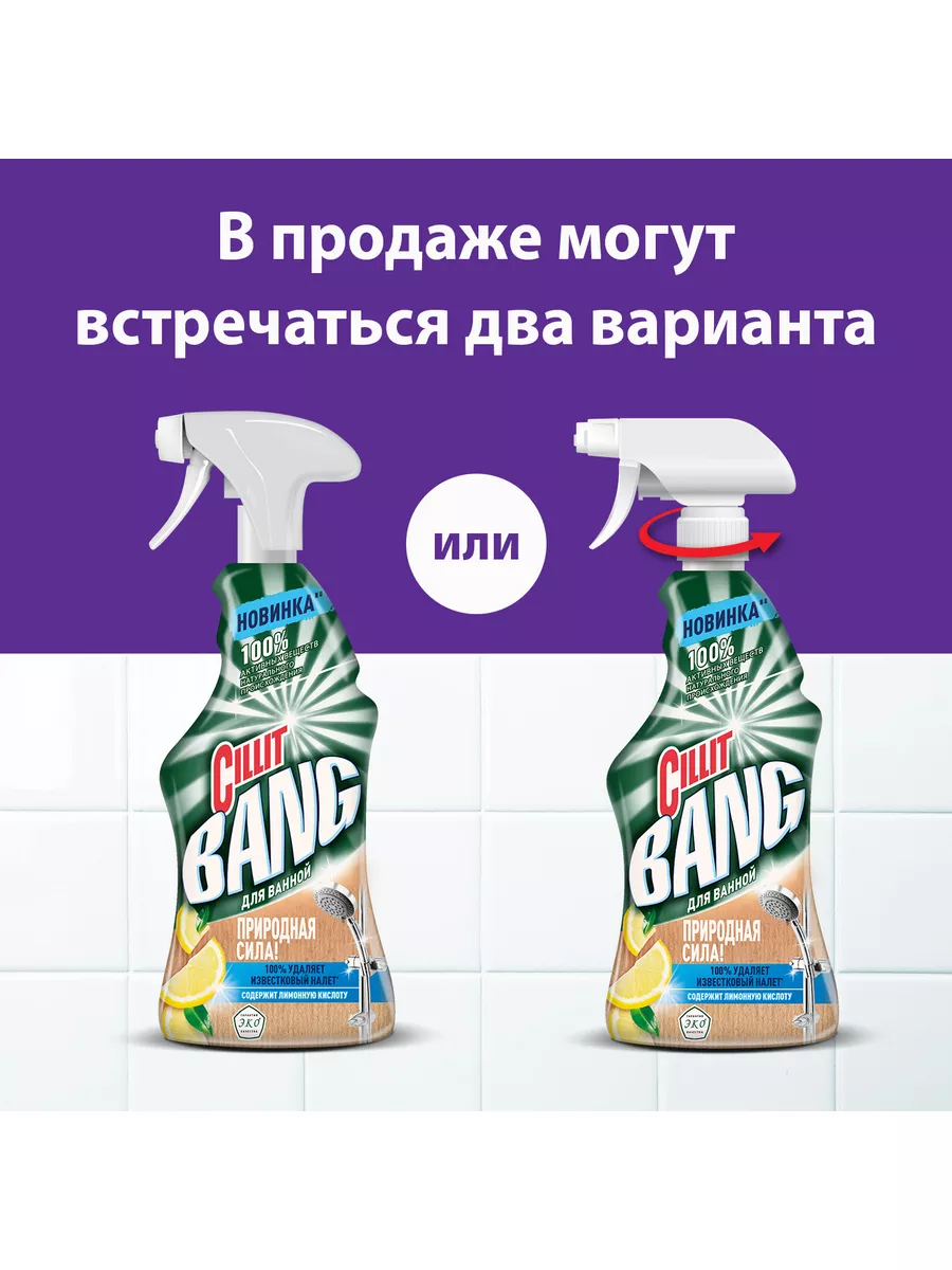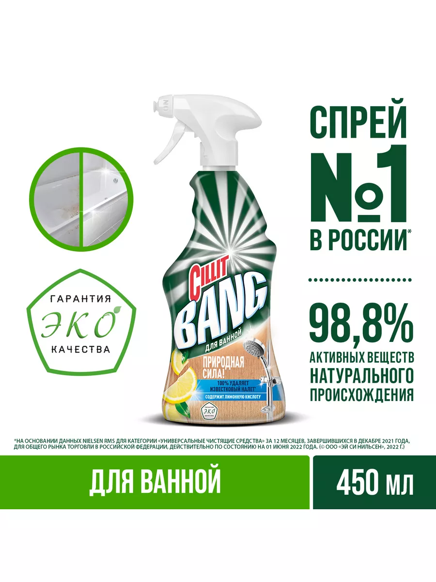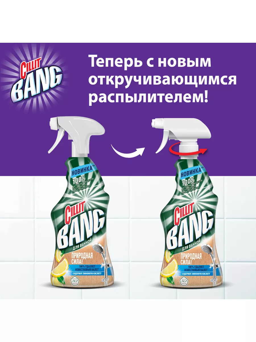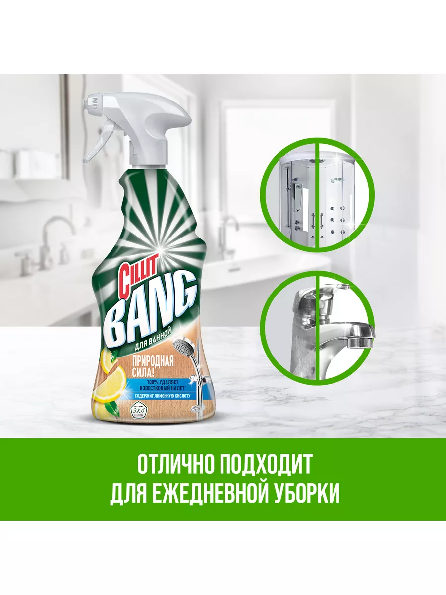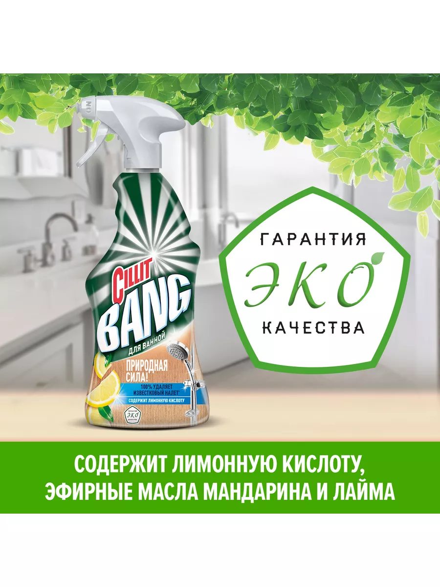 Описание: Чистящее средство для ванной «CIllit Bang Природная Сила» с лимонной кислотой, 450 мл. Эффективное моющее Эко средство против ежедневных и стойких загрязнений. Отлично подходит для уборки различных материалов (в том числе керамики, акрила) и поверхностей, таких как ванная душевая кабина, кафельная плитка и др. Удаляет известковый и мыльный налет, возвращая блеск вашим поверхностям. Идеально подходит для чистки хромированных, керамических, пластиковых, стеклянных поверхностей, а также поверхностей из нержавеющей стали и акриловых ванн. Эргономичный флакон оснащен высоконадежным курковым распылителем, позволяющим легко наносить раствор на загрязненную поверхность.Преимущества Cillit BangСилит Бенг: 1. №1 чистящий спрей в России 2. Имеет сертификат «Гарантия ЭКО качества»; 3. Содержит 98,8% активных веществ натурального происхождения; 4. Натуральные ароматизаторы: эфирные масла мандарина и лайма; 5. Эффективно удаляет известковый налет 6. Легкое использование благодаря удобному распылителю; 7. Подходит для поверхностей в ванной, в том числе акрила и керамики; 8. Удаляет ежедневные и стойкие загрязнения.Способ применения: 1. Держа флакон на безопасном от лица расстоянии так, чтобы распылитель не был направлен на лицо, поверните наконечник в положение «ON»; 2. Нанесите средство на смоченную загрязненную поверхность; 3. Оставьте средство на поверхности на 5 минут, затем вытрите салфеткой и промойте поверхность водой. Повторите процедуру при необходимости. Для сильных загрязнений оставьте средство на поверхности максимум на 20 минут; 4. Для придания блеска протрите обработанную поверхность сухой салфеткой. !Перед использованием всегда пробуйте средство на менее заметном участке поверхности. При обнаружении нежелательного воздействия на поверхность немедленно промойте ее водой и прекратите использование продукта. Не подходит для обработки меди, латуни, полированного мрамора.