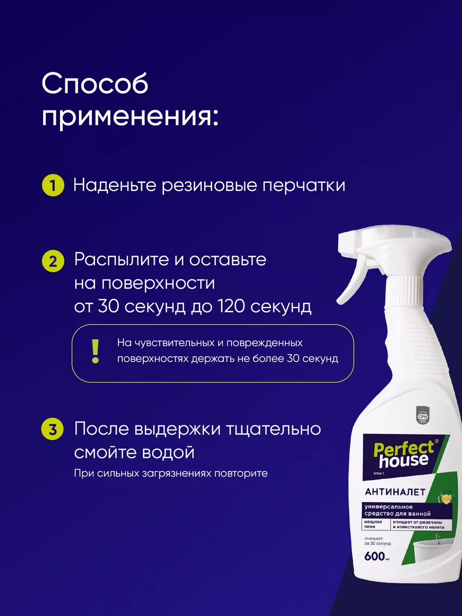 Описание: Моющее средство для ванны от Perfect House - это незаменимый помощник в борьбе с загрязнениями в ванной комнате. Благодаря своей мощной формуле, оно эффективно удаляет налет, ржавчину, плесень и мыльные разводы с любых поверхностей. Это универсальное чистящее средство подходит для очищения всех видов ванн, душевых кабин, пластиковых шторок, керамики, плитки, унитаза, а также сантехники, латуни и хромированных покрытий. Оно безопасно для акриловых, стеклокерамических, металлических поверхностей и нержавеющей стали. Более того, средство для уборки освежает и восстанавливает поверхности, удаляя даже самые стойкие пятна. Спрей, содержащийся в удобной бутылке объемом 600 мл, легко наносится на поверхность с помощью специального распылителя. Это позволяет равномерно распределить продукт и уменьшить количество потраченного времени и усилий при чистке. Лимонная кислота, входящая в состав, придает свежий аромат, а также имеет антибактериальные и отбеливающие свойства. Регулярное использование средства для мытья ванной может помочь предотвратить повторное образование известкового налета и других отложений. Он образует защитный слой на поверхности, который затрудняет образование и проникновение загрязнений в будущем. Спрей антиналет придает поверхностям чистоту, блеск и свежесть, делая их более привлекательными и приятными на ощупь. Применение такого средства очень просто: надев резиновые перчатки, распылите его на поверхность и оставьте до 2 мин. Для чувствительных и поврежденных поверхностей рекомендуется выдерживать не более 30 секунд. После этого тщательно смойте средство водой, и ваша ванная станет идеально чистой и блестящей. Универсальное средство для ванн Perfect House может значительно улучшить внешний вид ванной комнаты и помочь вам поддерживать чистоту, сэкономив ваше время и усилия.