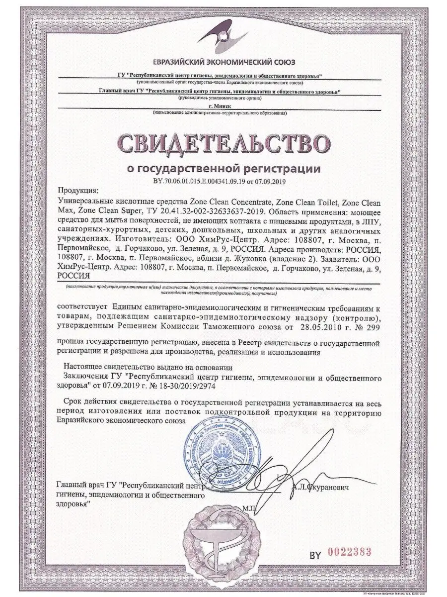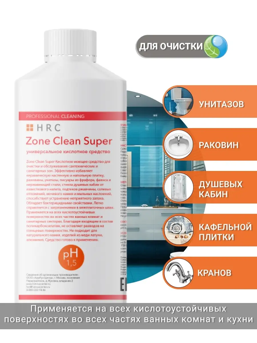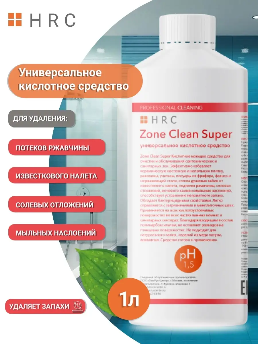 Описание: Универсальное чистящее кислотное средство для уборки ванной комнаты Zone clean super 500 мл и 1000 мл избавляет от известкового налёта и ржавчины в ванной и туалете, в том числе для очистки и обслуживания сантехнических и санитарных зон. Спрей для уборки эффективно избавляет керамическую настенную и напольную плитку, раковины, унитазы, писуары из фарфора, фаянса и нержавеющей стали, стекла душевых кабин от известкового налета, подтеков ржавчины, солевых отложений, мочевого камня и мыльных наслоений, способствует устранению неприятного запаха. Обладает бактерицидными свойствами. Очиститель легко справляется с загрязнениями в межплиточных швах. Бытовая химия Zone clean super используется для очистки и отбеливания, устранения налета в душевых кабинах, подходит для кухни, для пола, сантехники, фаянсовых изделий и кафеля. Эффективная формула состава универсального чистящего средства для унитаза быстро удаляет застарелые загрязнения. Применяется на всех кислотоустойчивых поверхностях во всех частях ванных комнат и санитарных секторах. Благодаря входящим в состав поликарбоксилатам, не оставляет разводов на глянцевых поверхностях. Не подходит для натурального камня, изделий из меди латуни, алюминия. Жидкость для уборки безопасно для акриловых ванн и поверхностей из цветных металлов. Универсальное моющее средство разработано на основе поликарбоксилата, специальные компоненты создают защитную пленку на поверхности, создавая чистоту и блеск, сохраняя эффект на несколько дней. Равномерно нанести на очищаемую поверхность, оставить на несколько минут. Средство для уборки потереть губкой, смыть водой. На поверхностях, чувствительных к кислоте, держать не более 30 секунд. Средство готово к применению. Наслаждайтесь уборкой вместе с Zone clean super и обратите ваше внимание на линейку других наших товаров для дома и товаров для уборки. Продукция сертифицирована, изготовлена в России.