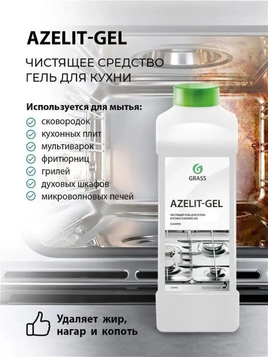 Описание: Гель для кухни антижир Азелит эффективно удаляет жир, нагар, копоть и пригоревшие продукты с эмалированных и хромированных поверхностей, изделий из стекла, нержавеющей стали, фаянса, фарфора. Используется для мытья сковородок, кухонных плит, мультиварок, фритюрниц, грилей, духовых шкафов, микроволновых печей. Средство для удаления копоти жира Азелит Azelit анти-жир антинагар чистящий гель Грасс 1л.