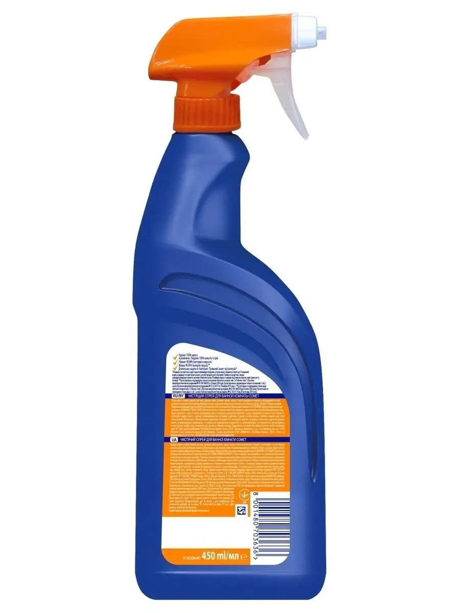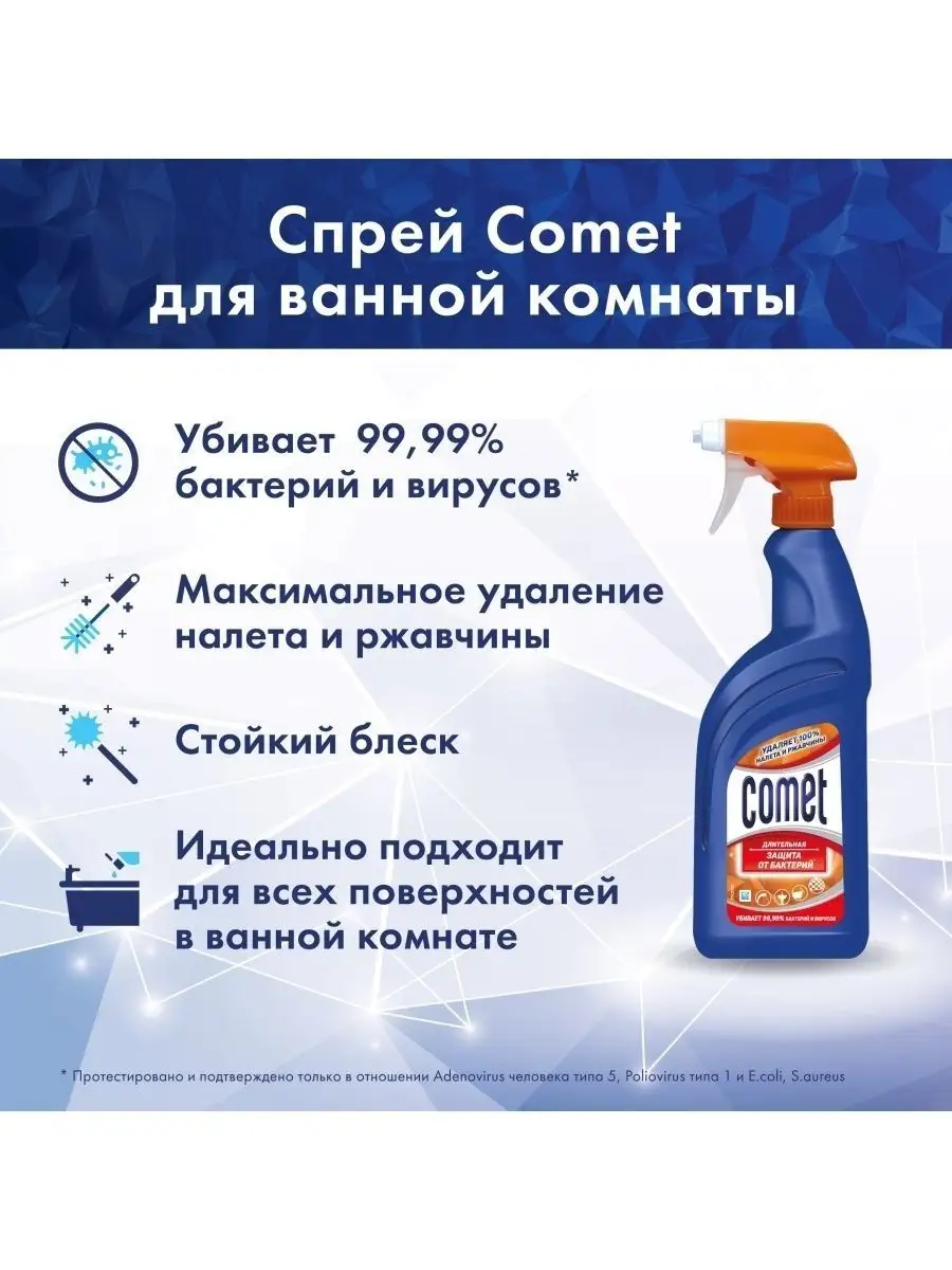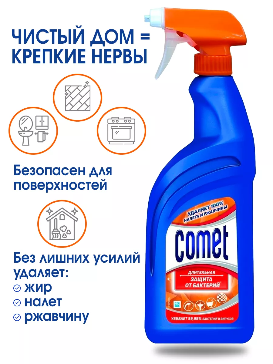 Описание: Спрей Comet 450 мл является чистящим средством для уборки ванны и кухни от известкового налета и ржавчины. Спрей COMET для ванной - идеальный выбор для получения непревзойденного результата! Комет не только убирает 100% известкового налета и ржавчины, но и дезинфицирует поверхность, убивая 99,99% бактерий и вирусов. Лёгкое и равномерное распыление спрея для уборки Комэт позволяет максимально быстро обработать поверхности в ванной комнате, в том числе вертикальные и труднодоступные. Благодаря входящему в состав полимеру использование спрея обеспечивает стойкий блеск и длительное сияние в ванной комнате. Бытовая химия для дома Комэт - идеальный выбор для получения непревзойденного результата! Средство для ванной комнаты глубоко очищает и препятствует образованию минеральных отложений, обеспечивая тем самым стойкий блеск. Используйте в ванной комнате: для ванн, душевых кабин, раковин, кранов, плитки. Так же комет подходит для туалета: для унитазов, для сантехники, для стен и полов, для универсальной уборки. Спрей Комет для уборки содержит несколько ключевых компонентов, которые обеспечивают его эффективность. Это позволяет дезинфицировать и поддерживать гигиену в помещении. В дополнение к основным компонентам, спрей для уборки может содержать ароматизирующие добавки, которые придают ему приятный запах. Эти добавки могут быть различными и выбираются с целью создания приятной атмосферы после уборки. Комбинация этих компонентов позволяет спрею для уборки эффективно очищать поверхности, обеспечивать дезинфекцию и придавать свежий аромат. Данное средство для уборки ванной и туалета является лидером среди товаров, которые многие годы доказывает свою эффективность при уборке Вашего дома. Температура хранения от 0 до + 25 C. Объем - 450 мл. Способ применения: Нанесите и распределите по всей поверхности влажной губкой. Оставьте средство не дольше, чем на 10 минут (расход: 100 мл/м).