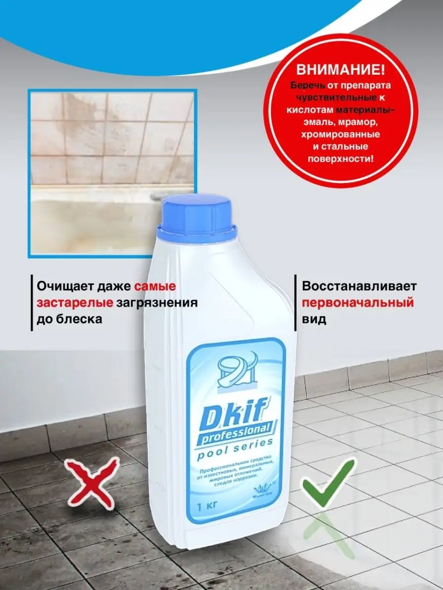 Описание: Чистящее средство для акриловых ванн предназначено для чистки и мытья акриловых ванн и другой сантехники. Антикальций легко справляется с известковым налетом и мыльными разводами на душевой кабине. Средство для ванны и унитаза справится с ржавчиной, солевыми отложениями и мочевым камнем. Чистящий спрей для сантехники легко справится с застарелыми загрязнениями. Антиналет для унитаза дизенфецирует, отбеливает и восстанавливает первоначальный вид. Используйте как средство от плесени в ванной. Бытовая химия бренда Dkif-professinal защищают поверхность сантехники до нескольких дней от появления каменных или мыльных отложений. Когда используете антикальций для раковины при чистке хромированных изделий необходимо быть очень осторожными и внимательными. При нанесении средства антиналет на кран или душевую лейку, не ждите, а сразу после нанесения смывайте тщательно водой. Чистящее средство для сантехники хорошо справляется с известковым и мыльным налетом на керамограните, плитке. Жидкость от налета в ванной эффективно чистит швы. Внимание: Беречь от препарата чувствительные к кислотам материалы, такие как мрамор, эмаль, хромированные и стальные поверхности! Если вы сомневаетесь в возможности очистки без нанесения вреда, сделаете сначала пробную очистку на небольшом участке поверхности.