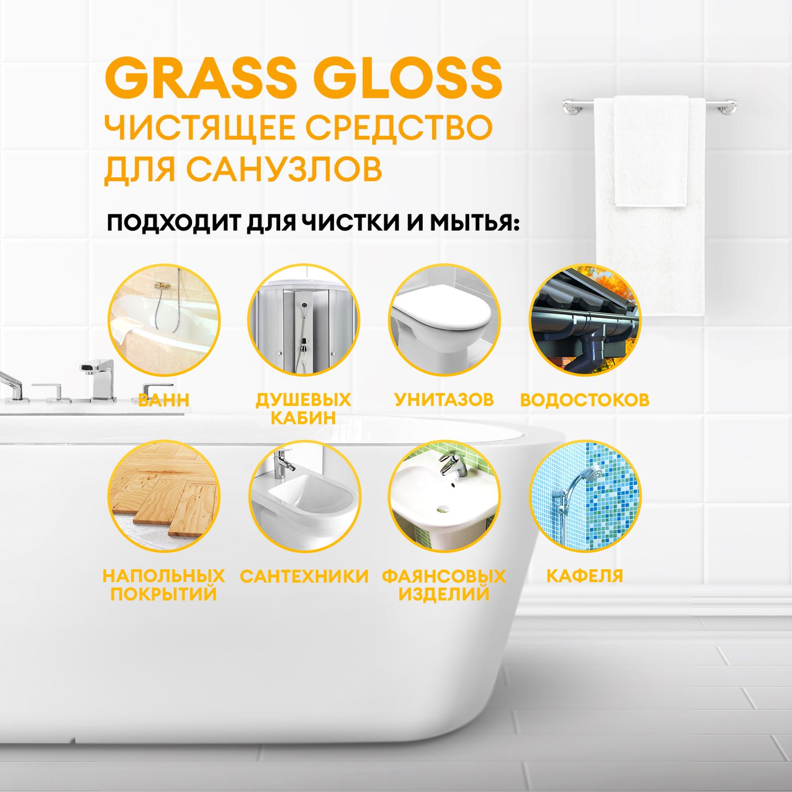 Описание: Текстовое описание изображенияGloss professionalЧистящее средство для ванной комнаты, сан узла, унитаза, раковины Gloss (Глосс) Professional Grass (Грасс) 600 мл универсальное используется для чистки очистки, отбеливания, устранения налета в душевых кабинах, кухне, полах, сантехники, фаянсовых изделий и кафеля от известкового средство налета мыльных разводов и солевых отложений. Эффективная формула универсального чистящего состава быстро удаляет застарелые загрязнения. Жидкость для уборки безопасно для акриловых ванн и поверхностей из цветных металлов. Универсальное моющее средство на основе лимонной кислоты. Специальные компоненты универсального моющего средства создают защитную пленку на поверхности создавая чистоту и блеск, сохраняя эффект на несколько дней. Равномерно нанести на очищаемую поверхность, оставить на несколько минут. Средство для уборки потереть губкой, смыть водой. На поверхностях, чувствительных к кислоте, держать не более 30 секунд. Наслаждайся уборкой вместе с GRASS.Текстовое описание изображения