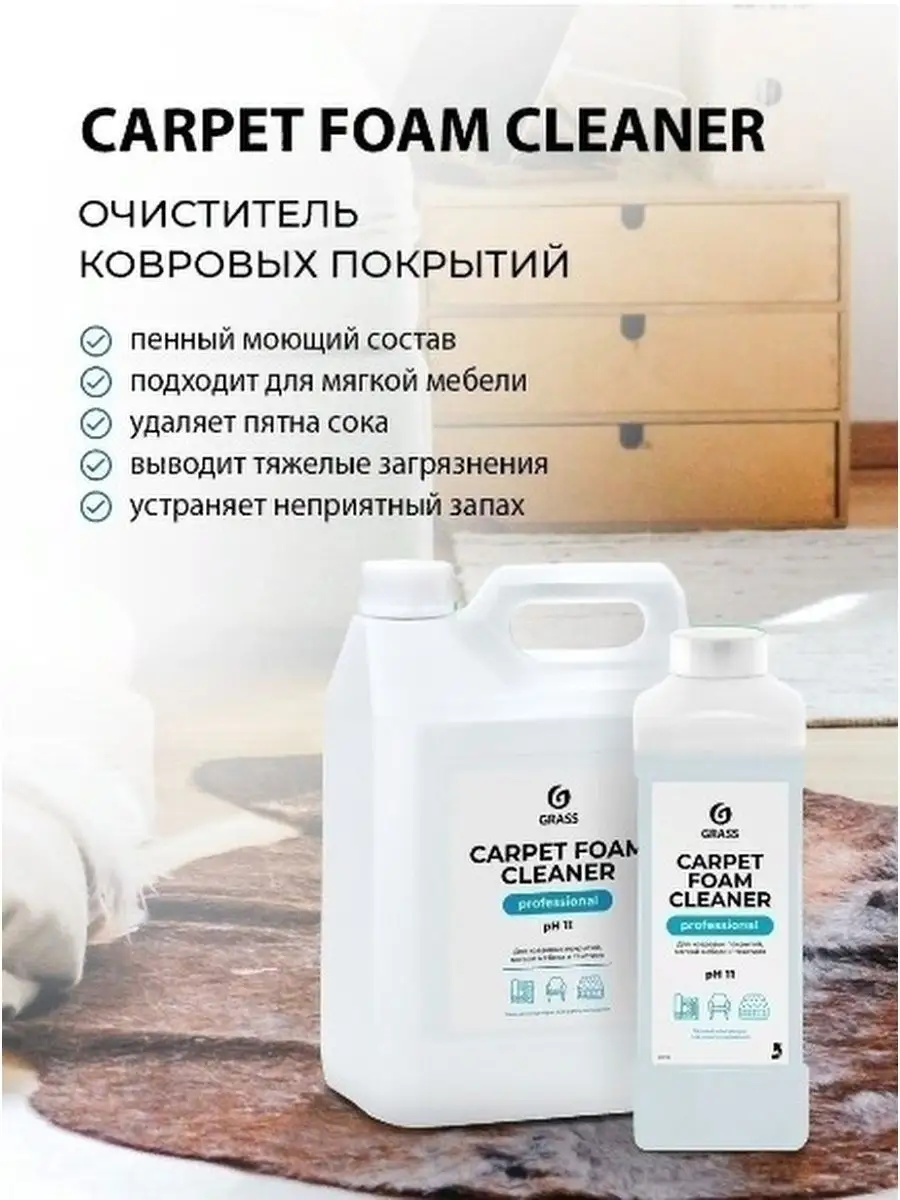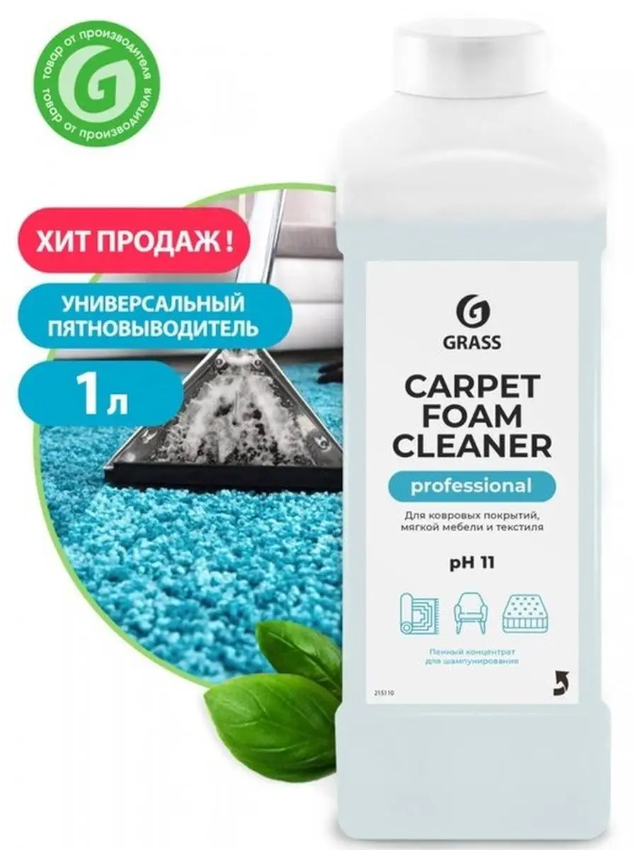 Описание: Универсальное чистящее средство Carpet Foam Cleaner grass грасс 1 литр для ковров мебели ковролина. Универсальный пенный моющий состав для чистки ковровых покрытий и мягкой мебели от любых загрязнений. Средство для чистки ковров и мягкой мебели подходит для чистки ткани велюра из искусственной кожи, пластика и стекол. Жидкость для очистки в концентрированном виде применяется как пятновыводитель удаляет пятна от вина сока крови жира и другихзагрязнений, устраняет неприятный запах. Перед началом химчистки пропылесосить поверхность, удалить пятна растворителем или данным концентратом, не разбавляя с водой. Для общей чистки жидкое средство концентрат следует разбавить 1:6-1:20,50-150мл/л. Средство для чистки мягкой мебели нанести распылителем или ковровым экстрактором. Загрязнения при необходимости потереть щеткой. Остатки раствора вместе с загрязнениями собрать пылесосом или вручную. При нанесении с помощью экстрактора, промыть поверхность водой. Очистить домашний ковер стало проще.