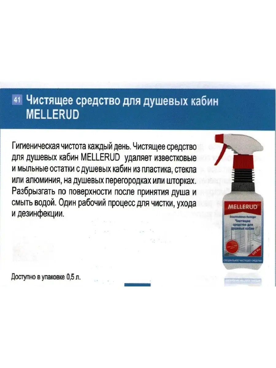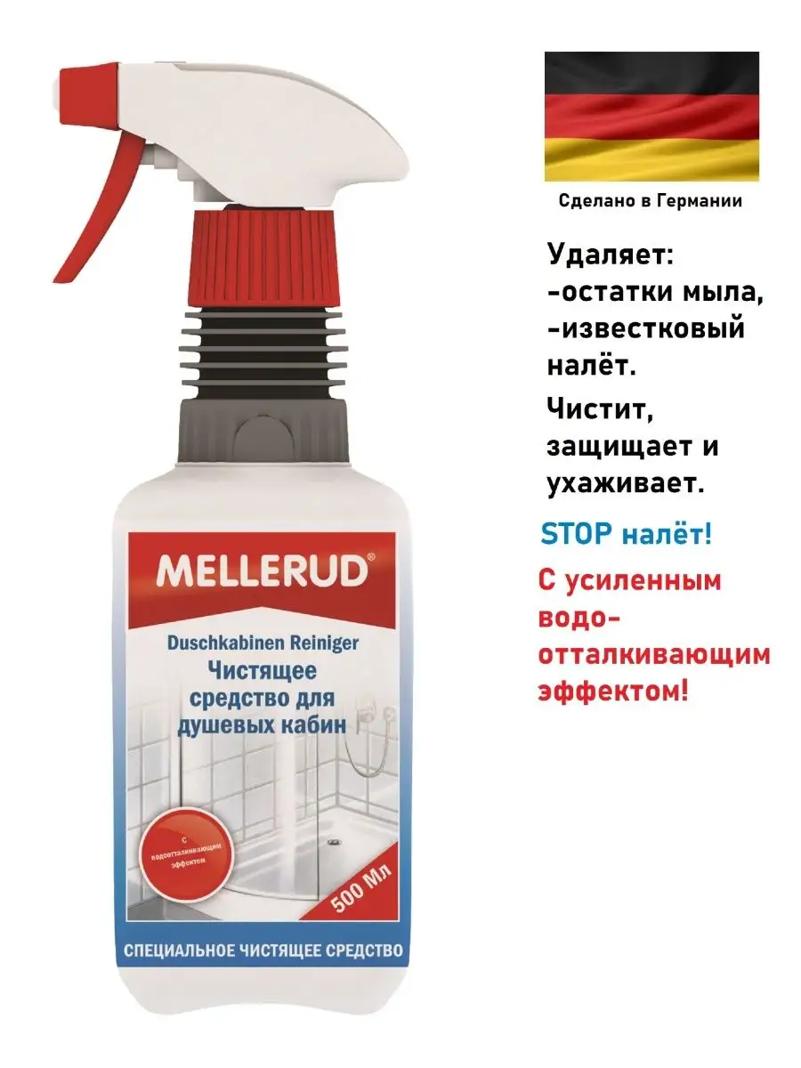 Описание: Средство для чистки душевых кабин "Mellerud" очищает от остатков мыла и отложений извести. Чистит и ухаживает одновременно. Предотвращает появление известкового налета. Защищает плитку и швы благодаря усиленному водоотталкивающему эффекту. Предназначено для выложенных плиткой душей, душевых кабин из стекла с покрытием и без, и пластика. Для душевых шторок, перегородок и дверей с алюминиевыми рамами. Подходит также для душей из акрила. Бережное очищение, гигиеническая чистота. Применение: просто разбрызгать по душевой кабине, оставить на короткое время, сполоснуть водой - и все чисто! При стойких загрязнениях почистить губкой, в случае необходимости процесс повторить. Внимание: Не подходит для плитки и поверхностей, чувствительных к кислоте, например, мрамор, натуральный камень, содержащий известь. Состав: водная смесь органических кислот и моющих активных веществ, усилитель эффекта, ароматизирующие добавки. Срок годности: 10 лет с даты производства