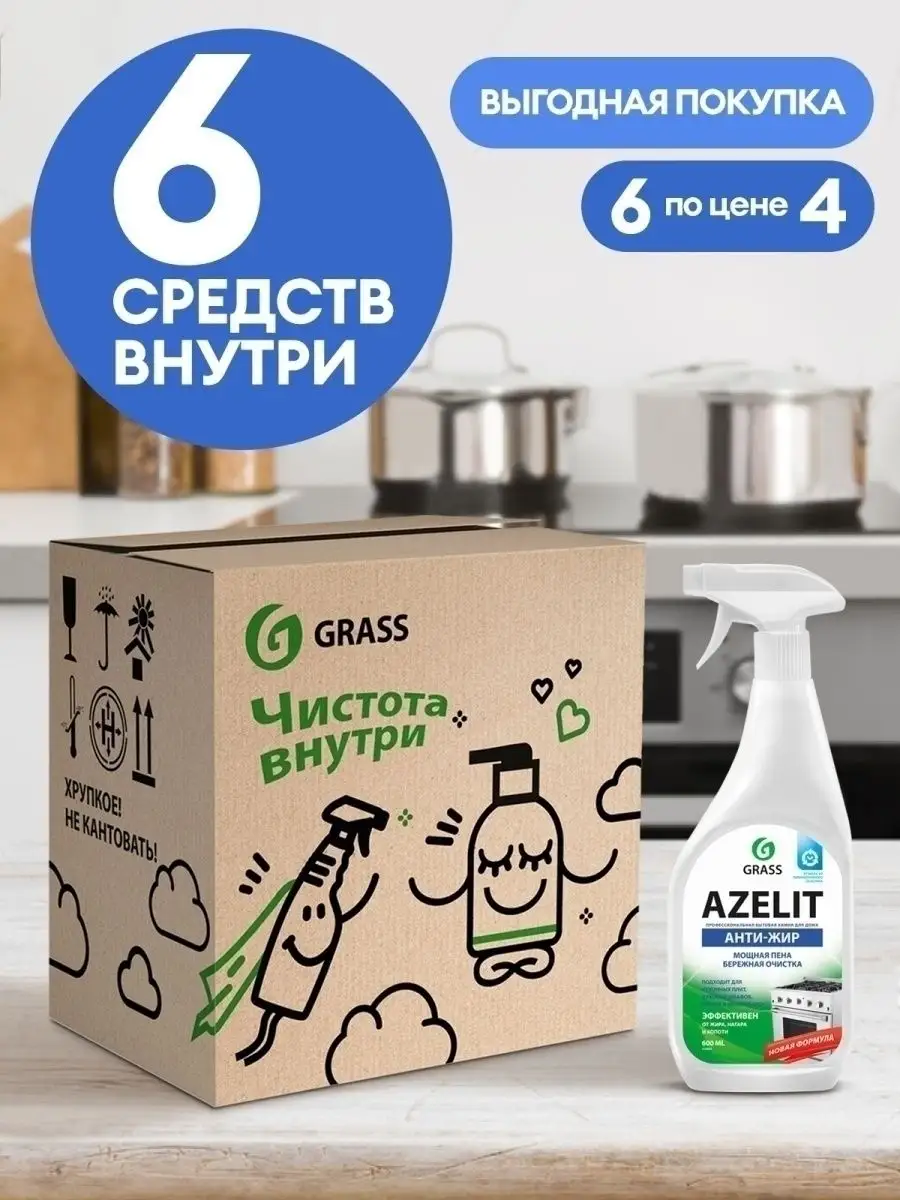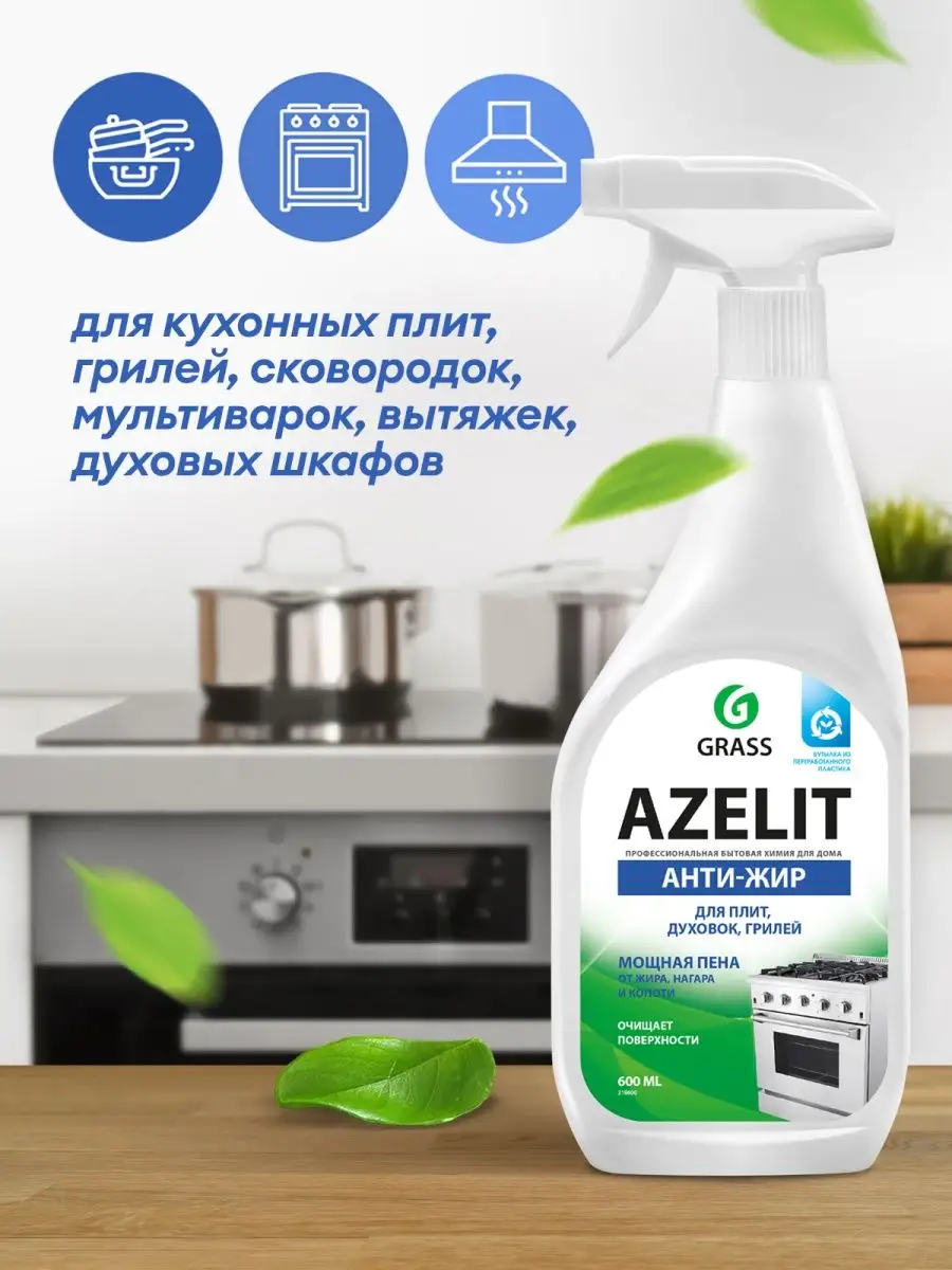 Описание: Вместе выгоднее! Чистящее средство Азелит-Антижир для кухни Azelit спрей 600 мл от Grass - современная бытовая химия, является отличным помощником для уборки дома. Обладает мощной пеной, бережно очищает поверхность и поддерживает ежедневную чистоту без лишних усилий. Удаляет жир, нагар, копоть и пригоревшую пищу с эмалированных, хромированных поверхностей, изделий из стекла, нержавеющей стали, фаянса, фарфора, кухонных плит, мультиварок, фритюрниц, грилей, духовых шкафов и микроволновых печей. Прекрасный стеклоочиститель. Жироудалитель Азелит содержит активные вещества, расщепляющие жир, действие которых гарантирует быстрый результат без особых усилий. Содержащие в составе активные вещества, которые позволяют очистить до блеска даже фритюрный прибор. Моющие средства сделает кухню максимально чистой и блестящей. Многофункциональное средство анти жир подойдет для мытья окон, стекол или зеркал от капель жира или других трудно удаляемых пятен. Достаточно нанести растворитель на поверхность, а через полминуты смыть водой или протереть тряпкой. Попробуйте всю линейку косметики и бытовой химии от официального магазина Грасс : средство для мытья окон, зеркал и стекла, средство для сантехники, средство для чистки ванной и унитаза, средство для кухни антижир , из которой можно собрать отличный набор для уборки дома