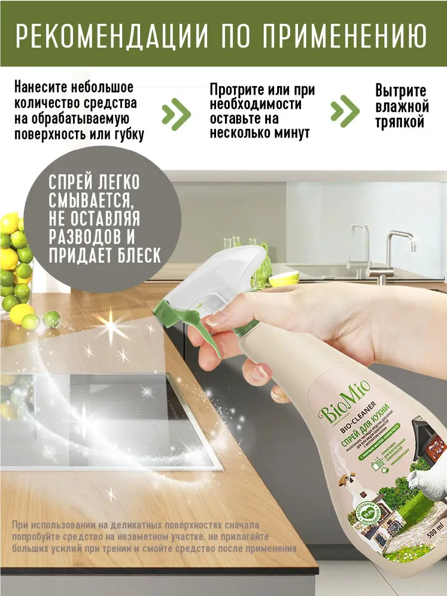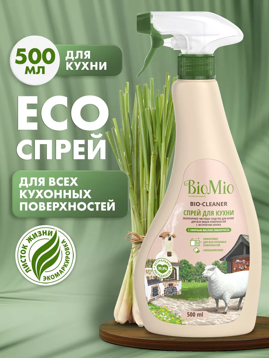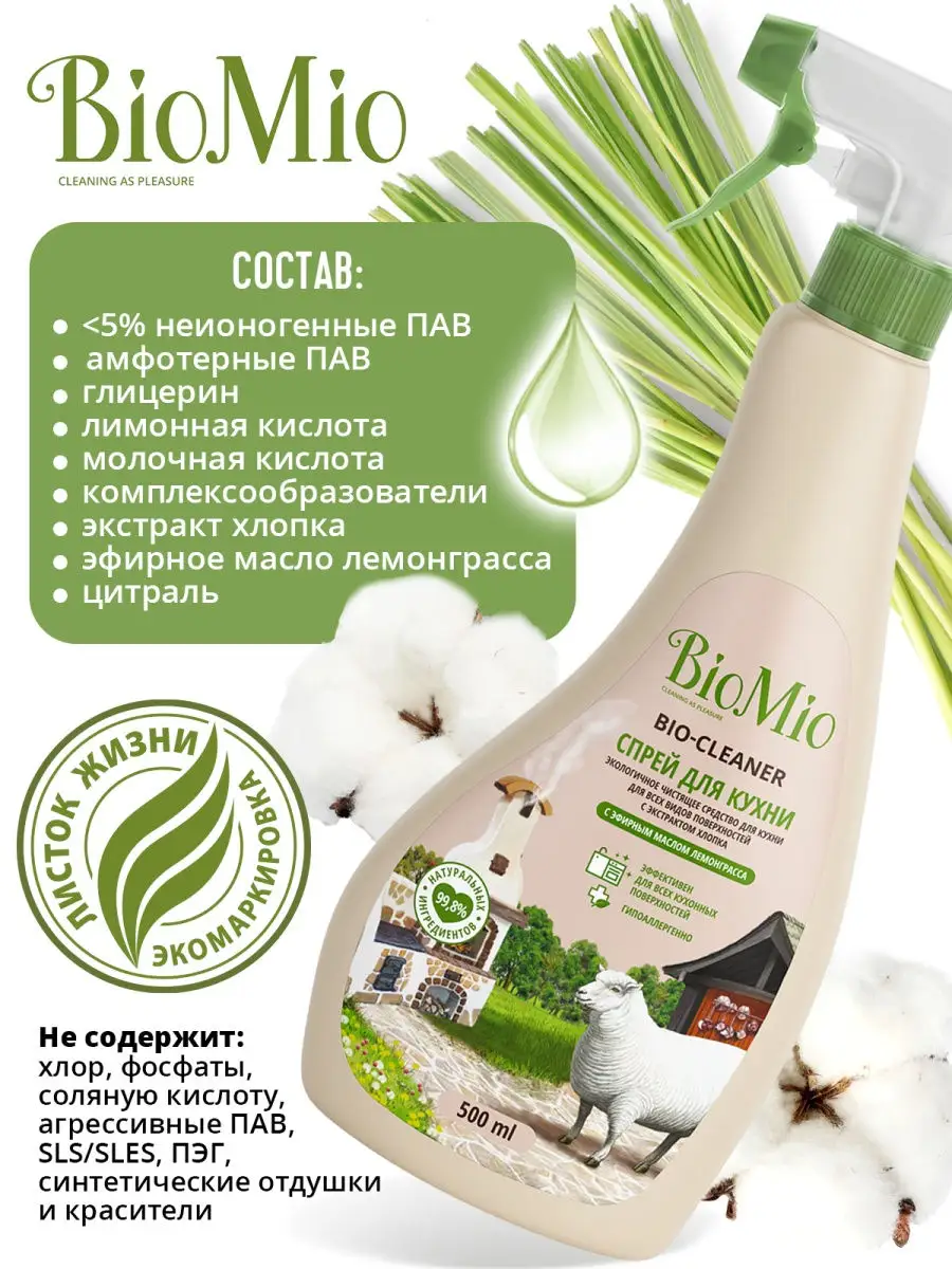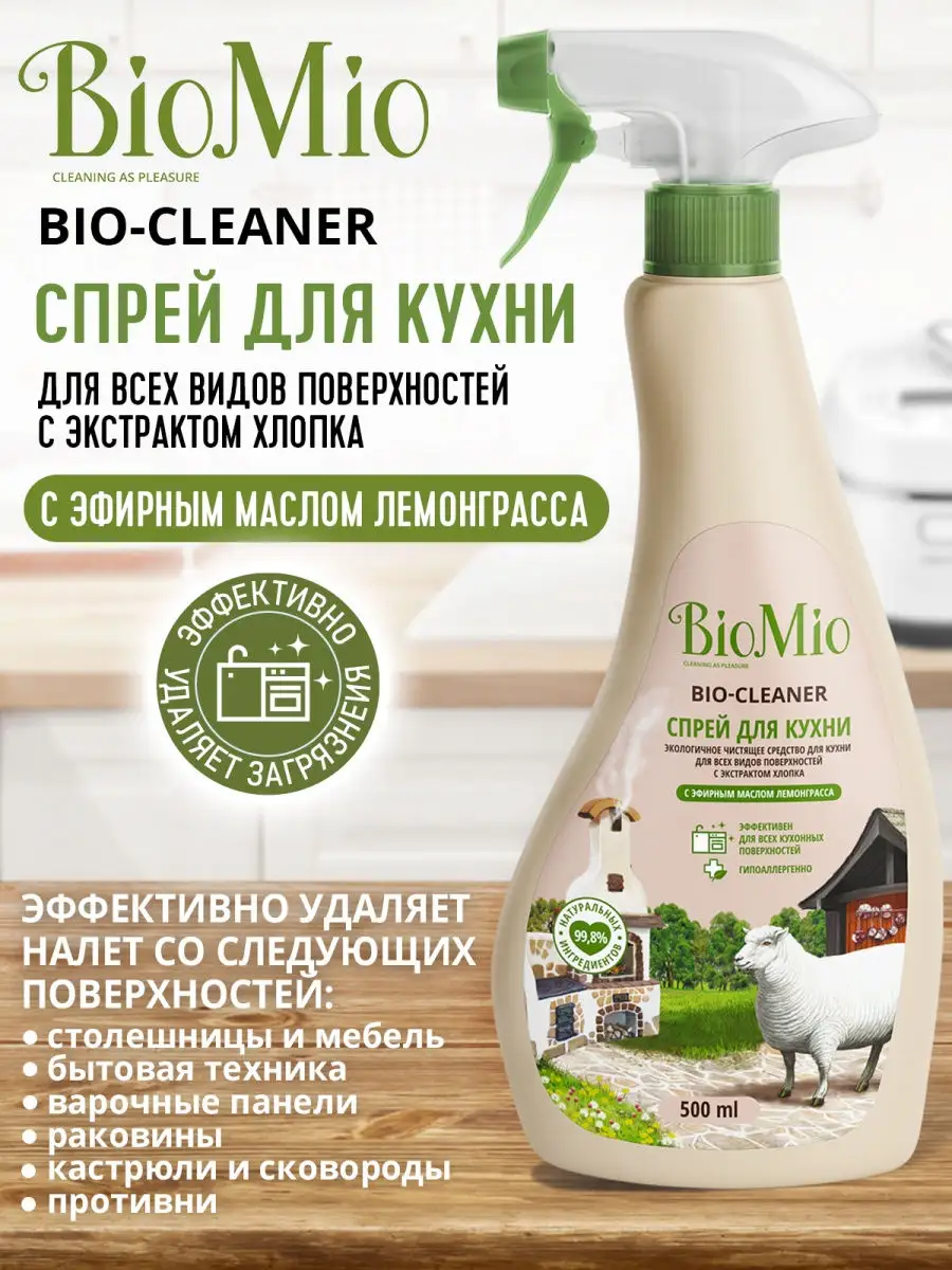 Описание: Чистящее средство для кухни BioMio – экологичная современная бытовая химия, незаменимый помощник для уборки дома. Спрей для кухни 500 мл с эфирным маслом лемонграсса эффективно удаляет жир и известковый налет со столешниц, бытовой техники, варочных панелей, раковин, кастрюль, сковород и противней. Подходит для очистки эмалированных и хромированных поверхностей, изделий из нержавеющей стали, кухонных плит, мультиварок, фритюрниц, грилей, духовых шкафов и микроволновых печей. Спрей антижир легко смывается, не оставляя разводов. Придает блеск и устраняет неприятные запахи. Моющее средство для кухни гипоаллергенно. Эфирное масло лемонграсса помогает восполнить дефицит эмоций и преодолеть апатию. Экстракт хлопка смягчает кожу рук. Средство не содержит хлор, фосфаты, агрессивные ПАВ, SLES, ПЭГ, синтетические отдушки и красители. Подходит для использования в домах с автономной канализацией, безопасно для септиков. Имеет экологический сертификат "Листок жизни". Способ применения: нанесите небольшое количество средства на обрабатываемую поверхность или губку, протрите или при необходимости оставьте на несколько минут. Вытрите влажной тряпкой. При использовании на деликатных поверхностях сначала попробуйте средство на незаметном участке, не прилагайте больших усилий при трении и смойте средство после применения.