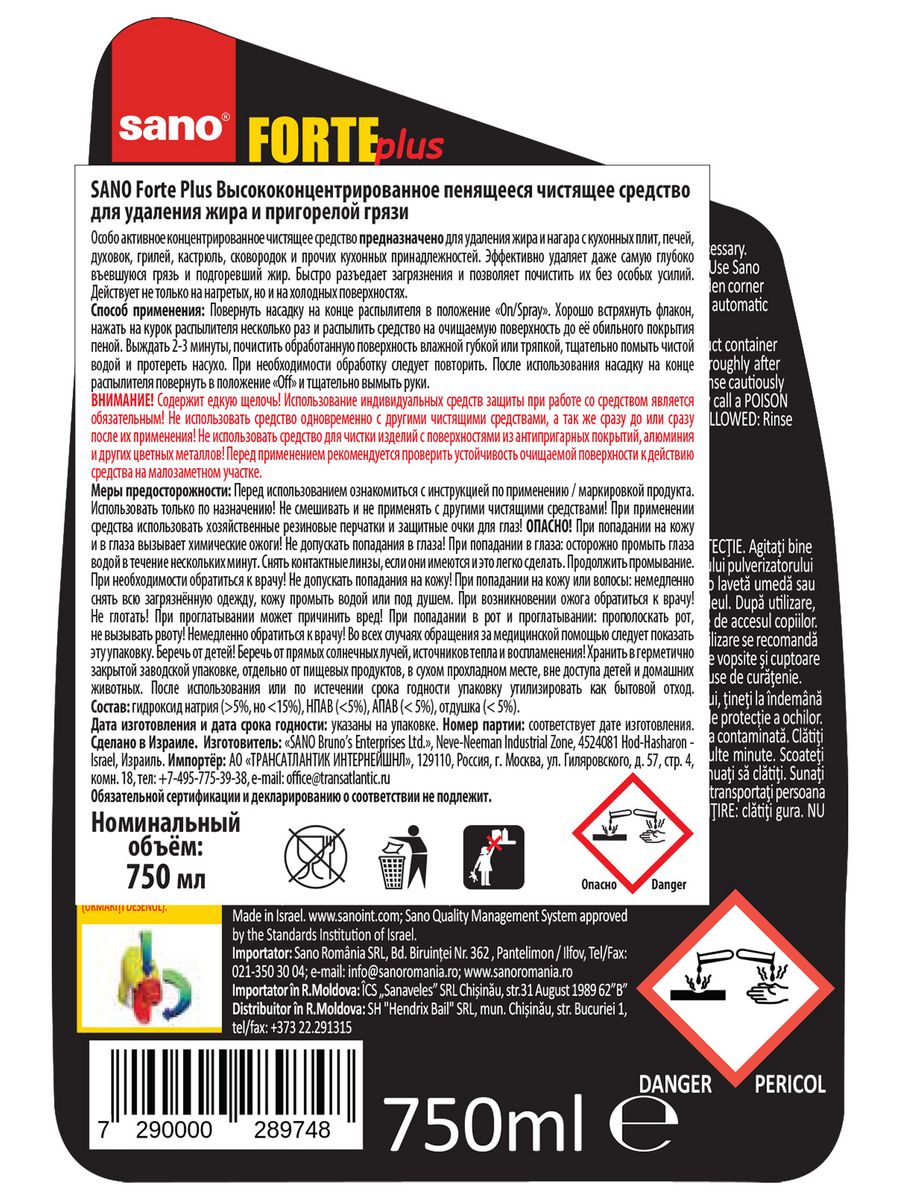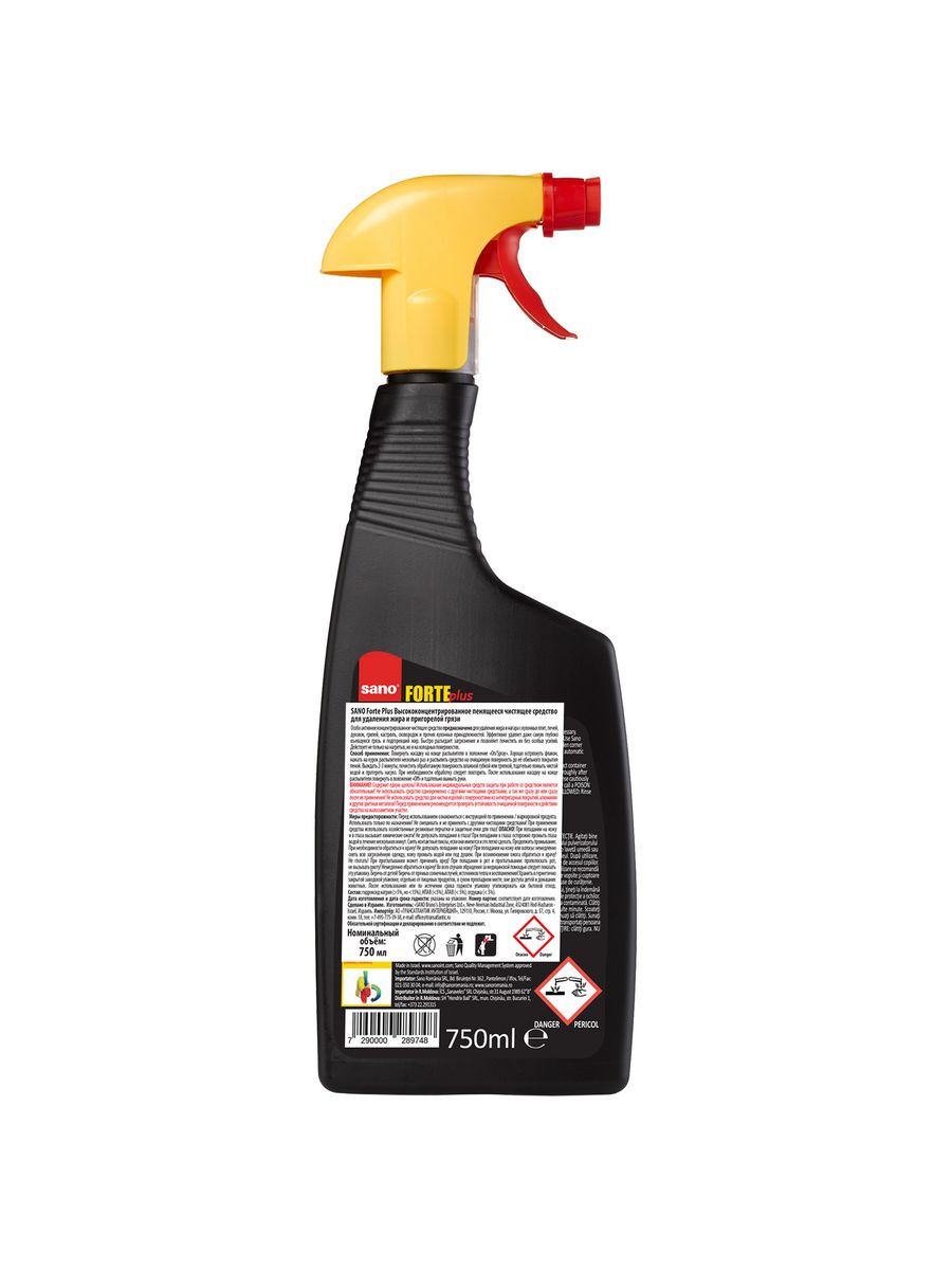 Описание: Универсальное чистящее средство для кухни SANO Forte Plus разработано специально для удаления жира и застывшей грязи. Действует мгновенно, выводит самые застарелые пятна, оснащено механизмом, препятствующим открытию средства детьми, не имеет острого запаха, благодаря пенящейся консистенции. С легкостью удаляет самую трудную, глубоковъевшуюся грязь ипригоревшийжир. Средство от налета и жира идеально подходит для сковородок, кастрюль и другой посуды, плиты, духовки и в целом для кухни. Моющее средство выпускается в удобном для нанесения формате - спрей от жира на кухне. Средство равномерно распределяется по опрыскиваемой поверхности в виде густой пены. Это помогает ему мгновенно проникнуть в слой грязи и удалить его. Работает даже с самыми застарелыми пятнами. SANO на латыни означает - чистота. SANO - это хозяйственные товары, которые помогут обеспечить кристальную чистоту вашего дома. "ТРАНСАТЛАНТИК ИНТЕРНЕЙШНЛ" - эксклюзивный дистрибьютор SANO в России. Нажмите на название продавца "ТРАНСАТЛАНТИК ИНТЕРНЕЙШНЛ", чтобы ознакомиться с другими хозяйственными товарами SANO.