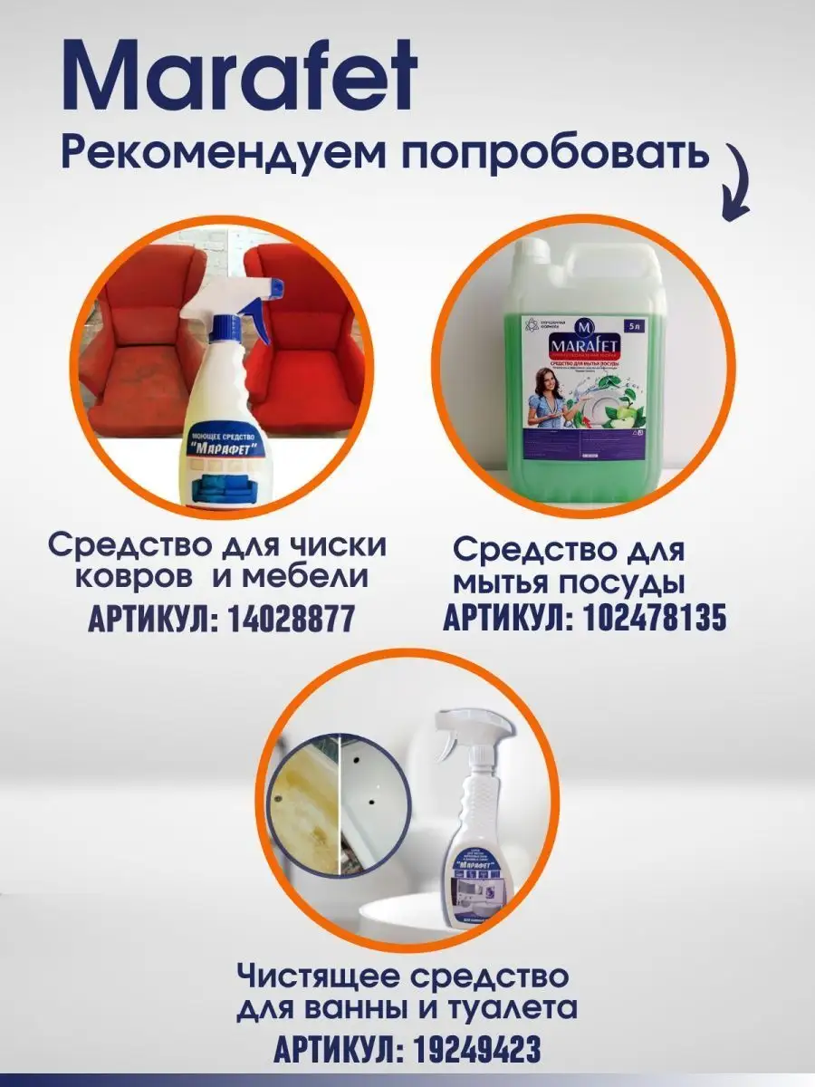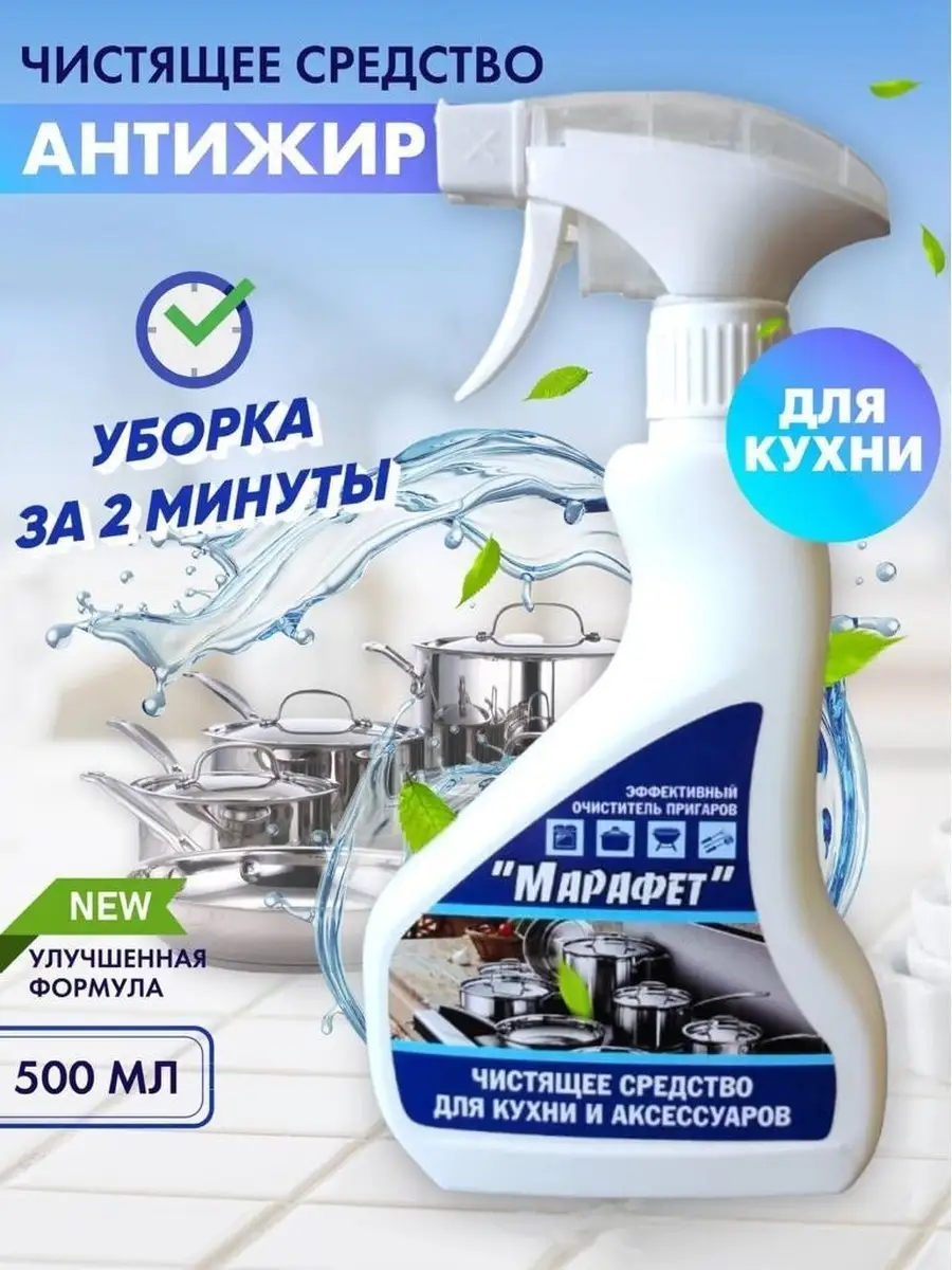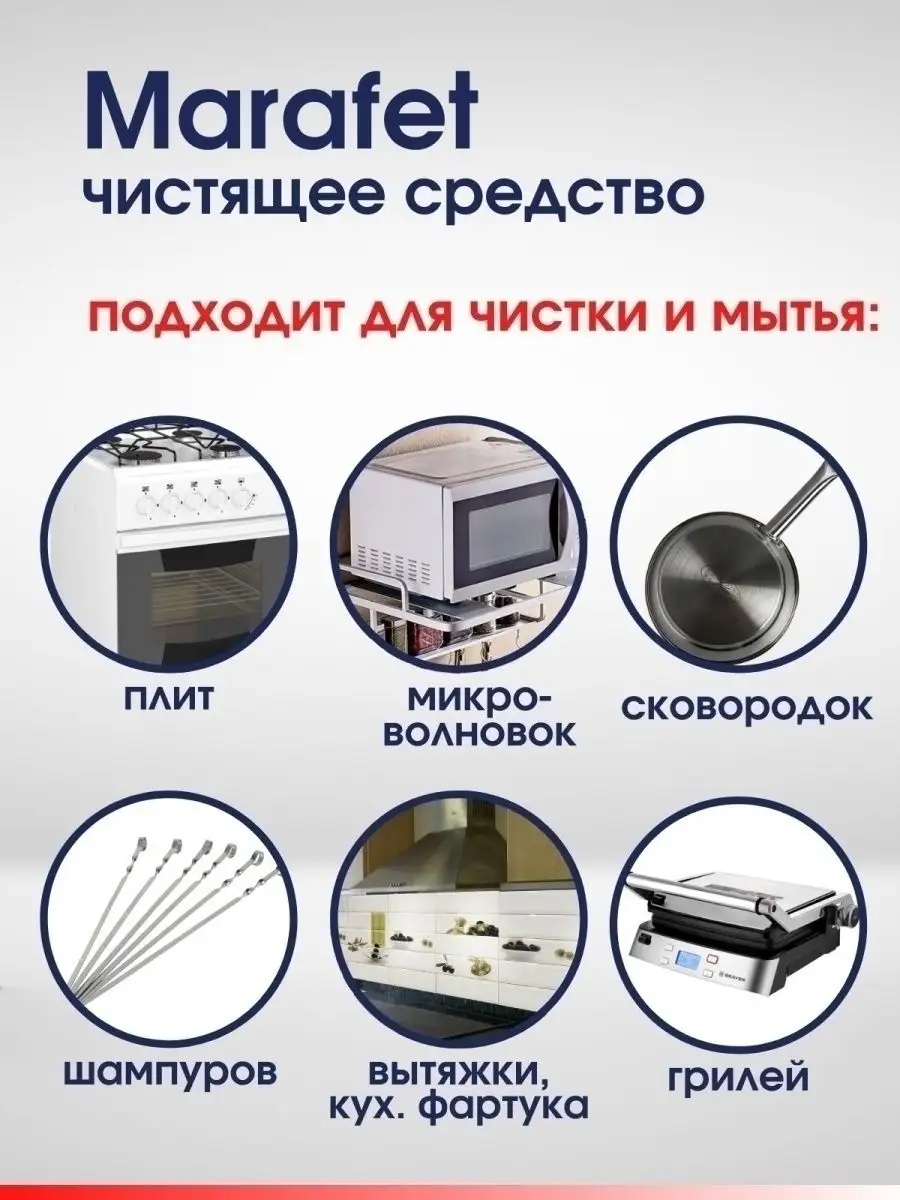 Описание: Домашняя химия - неотъемлемый помощник в борьбе с загрязнениями и пятнами в доме. Но как выбрать правильное средство для уборки? Мы рекомендуем обратить внимание на инновационное моющее средство для кухни от бренда Marafet. Это многофункциональное чудо - средство способно справиться с очисткой любых кухонных поверхностей. Очиститель быстро и эффективно удаляет даже застаревшие и въевшиеся жирные пятна. При этом средство действует бережно, не оставляет на поверхности царапин и других повреждений, а также мыльных разводов. Спрей не только очищает, но и придает блеск изделиям и поверхностям из стекла, стеклокерамики, нержавеющей стали и других материалов. Концентрированное хозяйственное средство подойдет даже для мытья эмалированных и хромированных вещей, а также чугунных сковородок и сковород с антипригарным покрытием, кастрюль, шампуров. Профессиональный концентрат изготовлен по современной эффективной формуле и включает активные компоненты, разрушающие жировые отложения и масло. Универсальное бытовое средство подойдет для мытья посуды, в том числе, стеклянной. Также это эффективный стеклоочиститель для оконных стекол и стеклокерамических поверхностей, зеркал, и даже мебели. И, конечно, очиститель идеально подходит для удаления жира и других загрязнений с поверхностей духовки (духового шкафа), газовой, электрической или индукционной варочной (жарочной) панели, плитки на стенах и микроволновой печи. Используя эту жидкость, вы сможете очистить микроволновку, решетку вытяжки, мультиварку, фритюрницу, противень, гриль или коптильный аппарат. Поэтому средство незаменимо не только дома, но и в дачном домике. Моющее средство для кухни поставляется в пластиковой бутылочке эргономичной формы. Насадка - распылитель позволяет за секунды распределить очищающую жидкость по поверхности. После этого вам будет нужно подождать несколько минут и удалить средство губкой или щеткой. У нас есть акции и распродажи, вы можете купить наши товары в подарок со скидкой!
