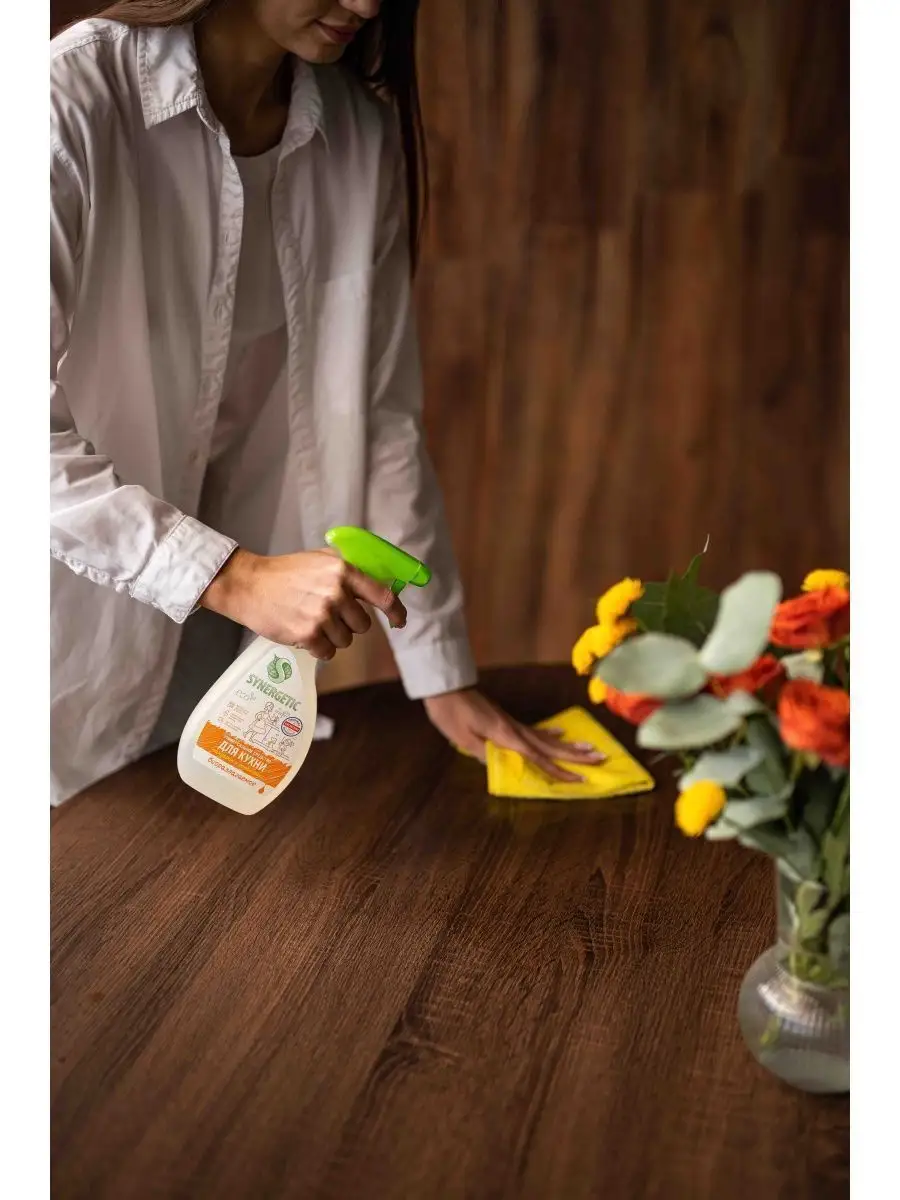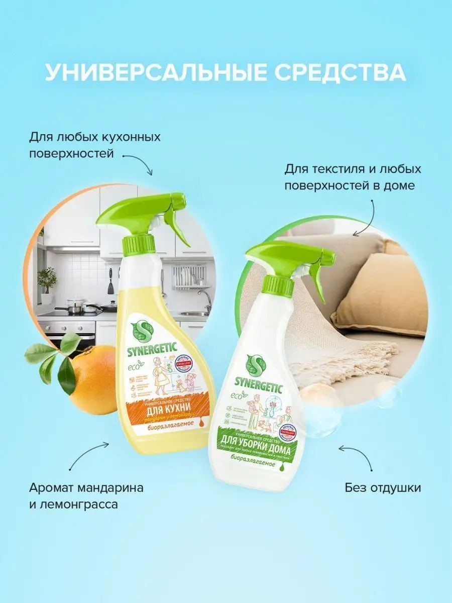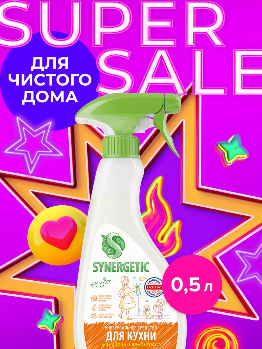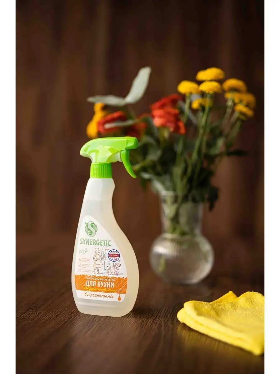 Описание: Универсальный чистящий спрей для уборки кухонных поверхностей SYNERGETIC с ароматом «Мандарин и лемонграсс» быстро и эффективно удаляет все виды кухонных загрязнений, жир и налет, устраняет неприятные запахи. Средство легко смывается водой и подходит для уборки любых кухонных поверхностей и техники: раковины, мойки, столешницы, кухонной плиты (включая стеклокерамическую), холодильника, микроволновой печи, фартука из керамической плитки, противней и других. Спрей является гипоаллергенным, и безопасен для использования на поверхностях, контактирующих с едой. Благодаря биоразлагаемым компонентам в составе средство не вредит микрофлоре септических установок. *** С этим спреем ваша кухня станет идеально чистой и безупречно блестящей! Наш продукт оснащен особой формулой, разработанной специально для удаления самых трудновыводимых загрязнений на кухне. Независимо от того, сталкиваетесь ли вы с жиром, пятнами от продуктов или остатками пищи, наше чистящее средство безупречно справится с любыми особенностями вашего готовительного пространства. Удобный спрей обеспечивает равномерное распределение средства, экономя ваше время и силы. Всего несколько нажатий, и наш чистящий спрей мгновенно покроет все поверхности вашей кухни. Результат превзойдет все ваши ожидания! Не только эффективен, но и безопасен! Наше универсальное чистящее средство не содержит агрессивных химических составляющих, поэтому вы можете быть уверены в безопасности использования вокруг пищевых продуктов и домашних животных. Оно также оставляет приятный аромат после каждого применения, создавая чувство свежести и комфорта. Забудьте о передозировках! Наша упаковка объемом 0,5 литра хватит на длительное время использования. Высокая концентрация средства делает его экономичным и выгодным выбором для вашей кухни. У нас есть акции и распродажи, вы можете купить наши товары в подарок со скидкой!