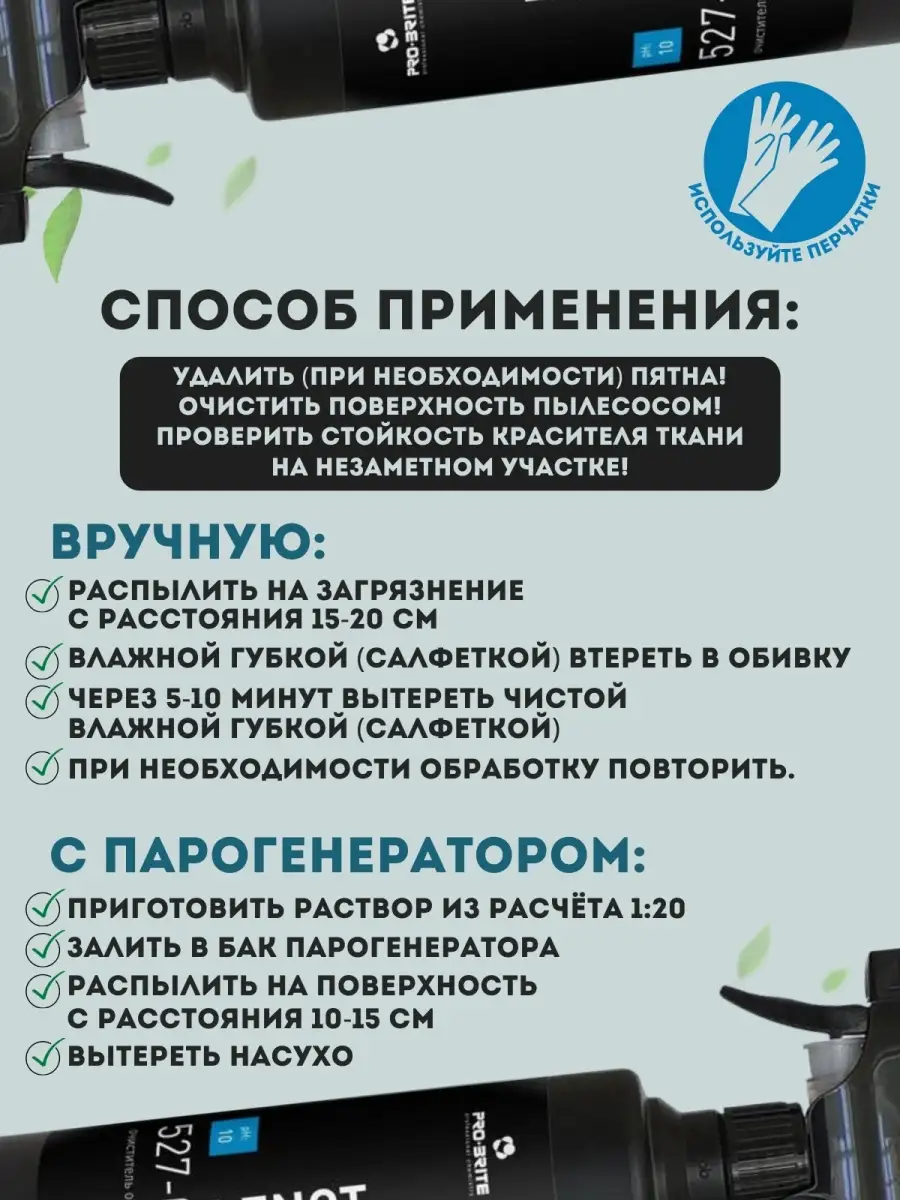 Описание: Наше универсальное чистящее средство для мягкой мебели и ковров от пятен Ленот – это спрей, который быстро и эффективно удаляет грязь и жирные пятна с поверхности любого материала. Он обладает специальной формулой, которая не повреждает качество тканей и сохраняет их свойства. Средство может использоваться для очистки диванов, кресел, ковров, матрасов, подушек и других изделий из текстиля, кожи и замши. Оно применимо в домашней области, в гостиницах, общественных учреждениях, организациях, образовательных центрах, спортивно-оздоровительных комплексах и транспорте. Спрей наносится на поверхность и через несколько минут удаляется тряпкой. Он обладает антипыльным и антижирным эффектом, удаляет неприятные запахи и дым, а также обеспечивает защиту от загрязнений. Оно не замерзает и не взрывоопасно. Мы гарантируем, что с нашим очистителем вы справитесь с любыми задачами по очистке мягкой мебели и ковров