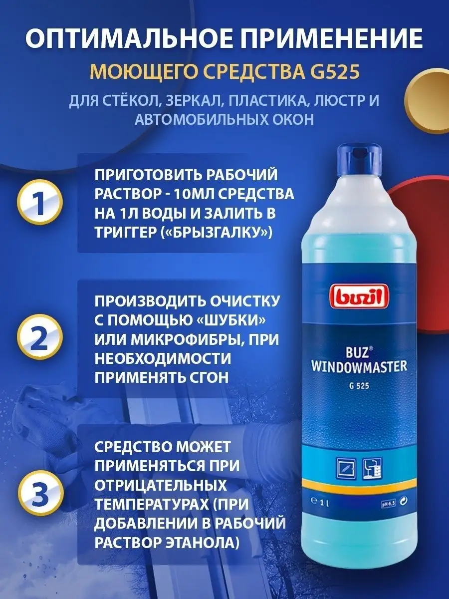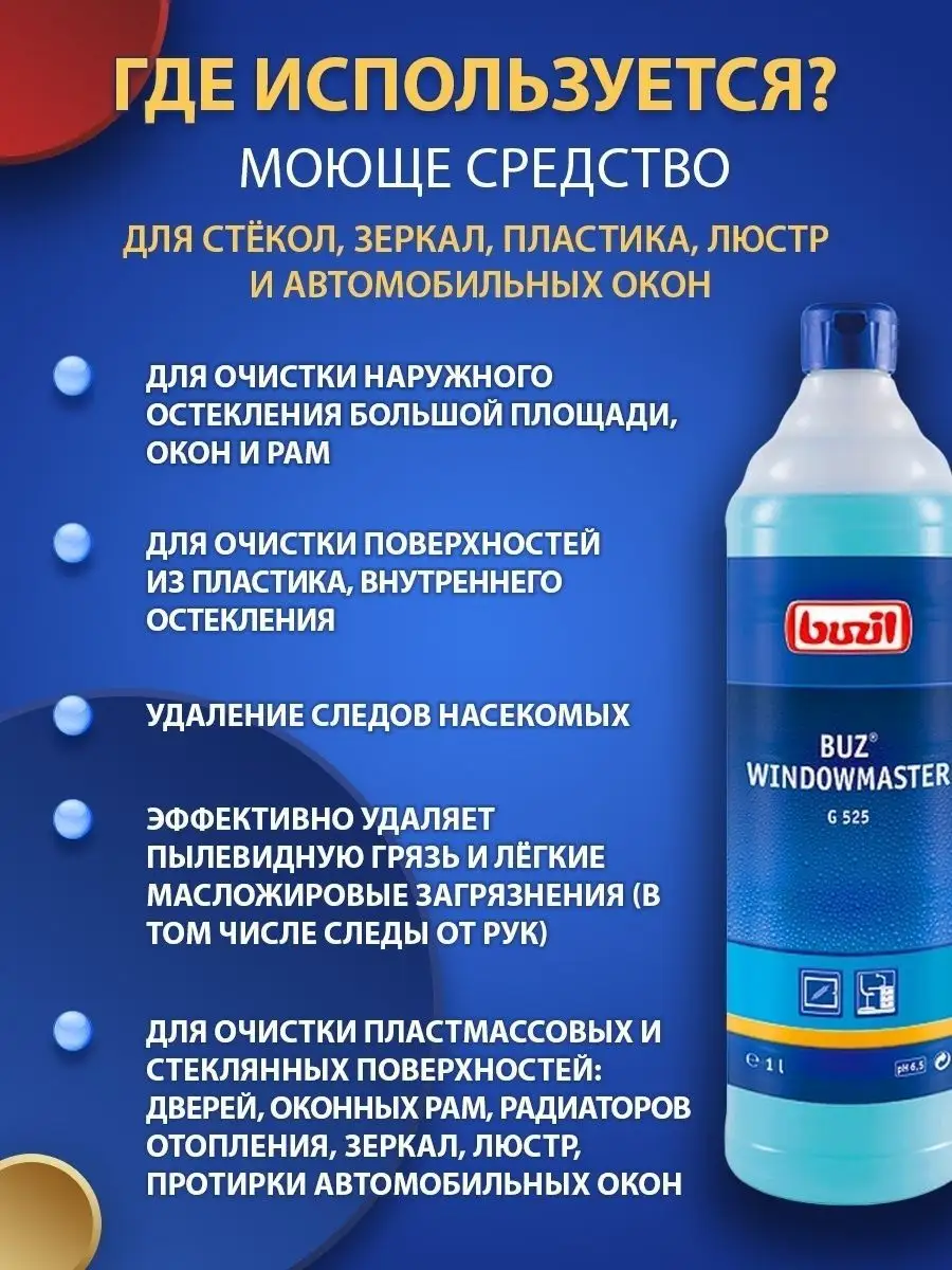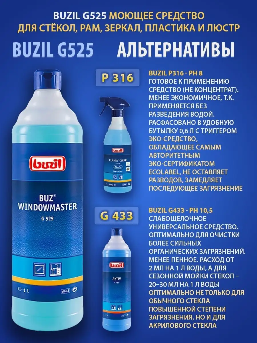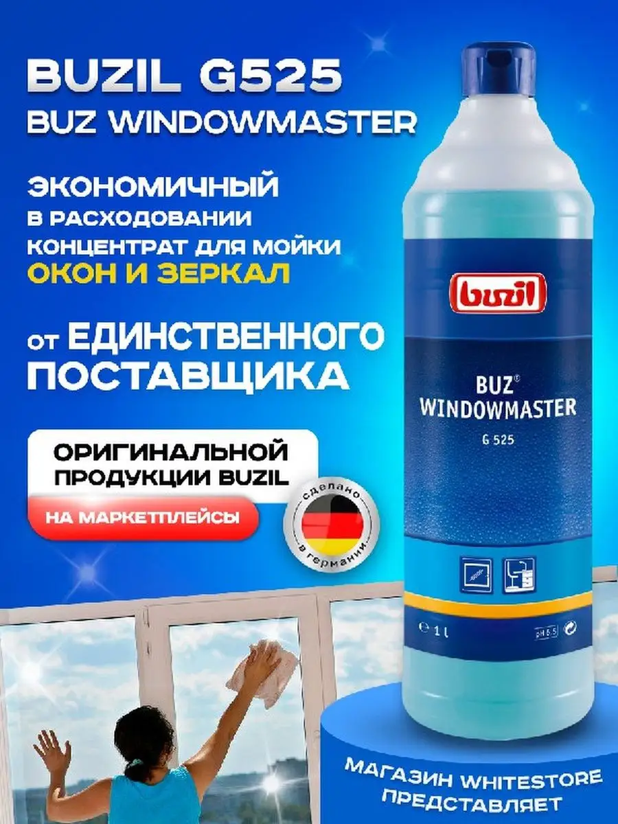 Описание: Устали от разводов на окнах и отпечатков пальцев на зеркалах? Чистящее средство для очистки стекол и зеркал BUZIL (бузиль) Buz Windowmaster G525 поможет вам решить эти задачи. Благодаря высокой эффективности очистки моющее средство удаляет загрязнения, от следов насекомых. Быстро высыхает, не оставляет разводов и замедляет повторное загрязнение за счет эффекта easy to clean. Универсальный очиститель для пластика стекол применяется для очистки стёкол, окон, рам, поверхностей из пластика, стеклянных покрытий, поливиниловых модулей, в т.ч. стекол автомобиля, душевой, зеркал в машине, стеклянных дверей после ремонта.Концентрат - низкая стоимость готового раствора. Чистка стекол - 50-100 мл/ 10 л воды. Не применять на акриловом стекле. Немецкая профессиональная бытовая химия для дома, для профессиональной уборки BUZIL - абсолютная чистота, с заботой о поверхности!
