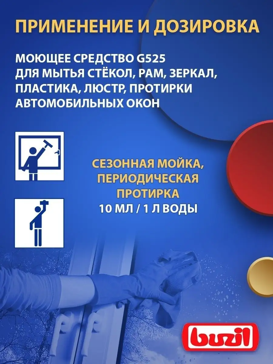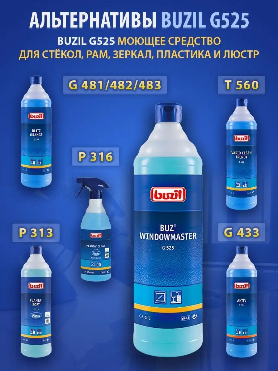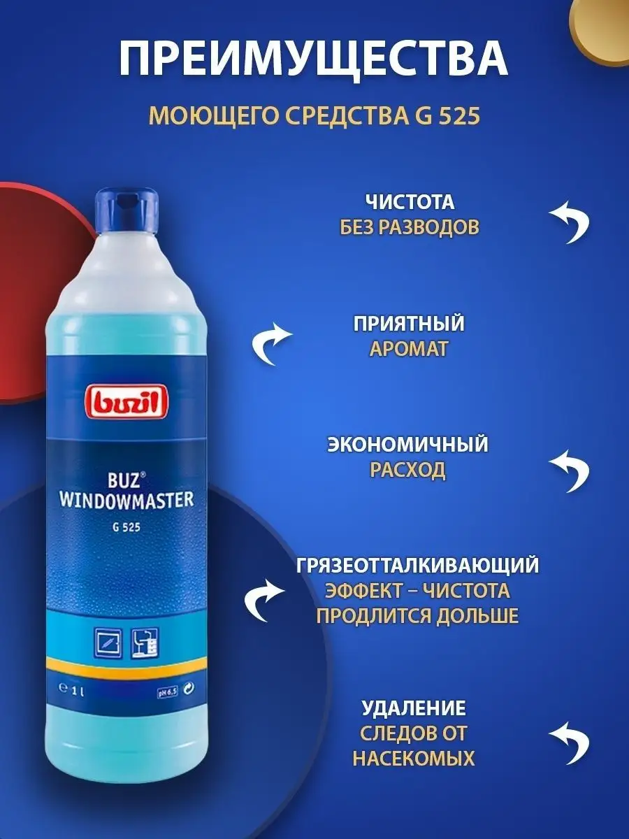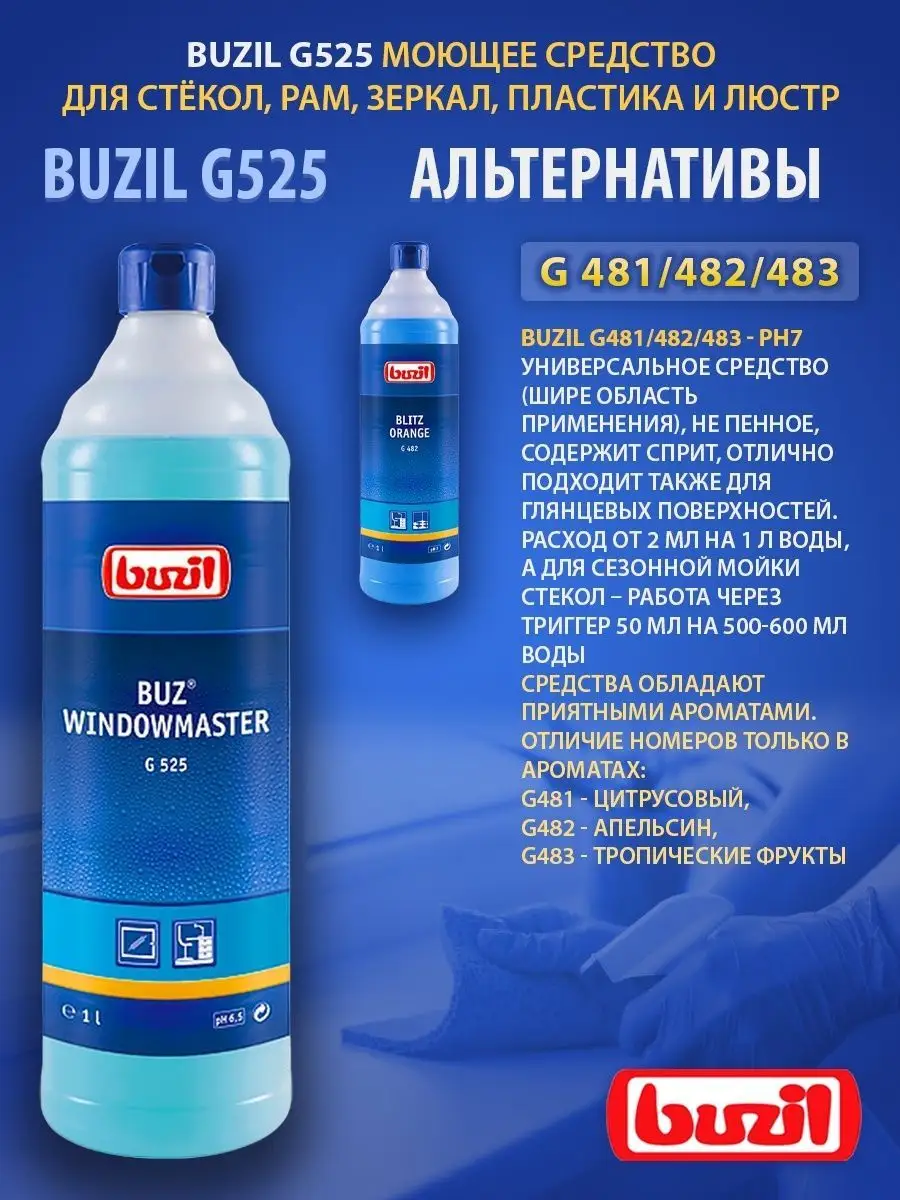 Описание: Устали от разводов на окнах и отпечатков пальцев на зеркалах? Чистящее средство для очистки стекол и зеркал BUZIL (бузиль) Buz Windowmaster G525 поможет вам решить эти задачи. Благодаря высокой эффективности очистки моющее средство удаляет загрязнения, от следов насекомых. Быстро высыхает, не оставляет разводов и замедляет повторное загрязнение за счет эффекта easy to clean. Универсальный очиститель для пластика стекол применяется для очистки стёкол, окон, рам, поверхностей из пластика, стеклянных покрытий, поливиниловых модулей, в т.ч. стекол автомобиля, душевой, зеркал в машине, стеклянных дверей после ремонта.Концентрат - низкая стоимость готового раствора. Чистка стекол - 50-100 мл/ 10 л воды. Не применять на акриловом стекле. Немецкая профессиональная бытовая химия для дома, для профессиональной уборки BUZIL - абсолютная чистота, с заботой о поверхности!