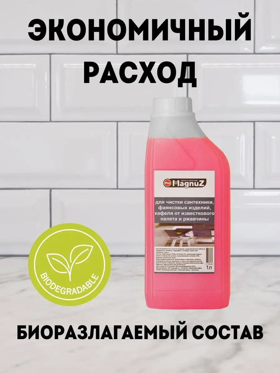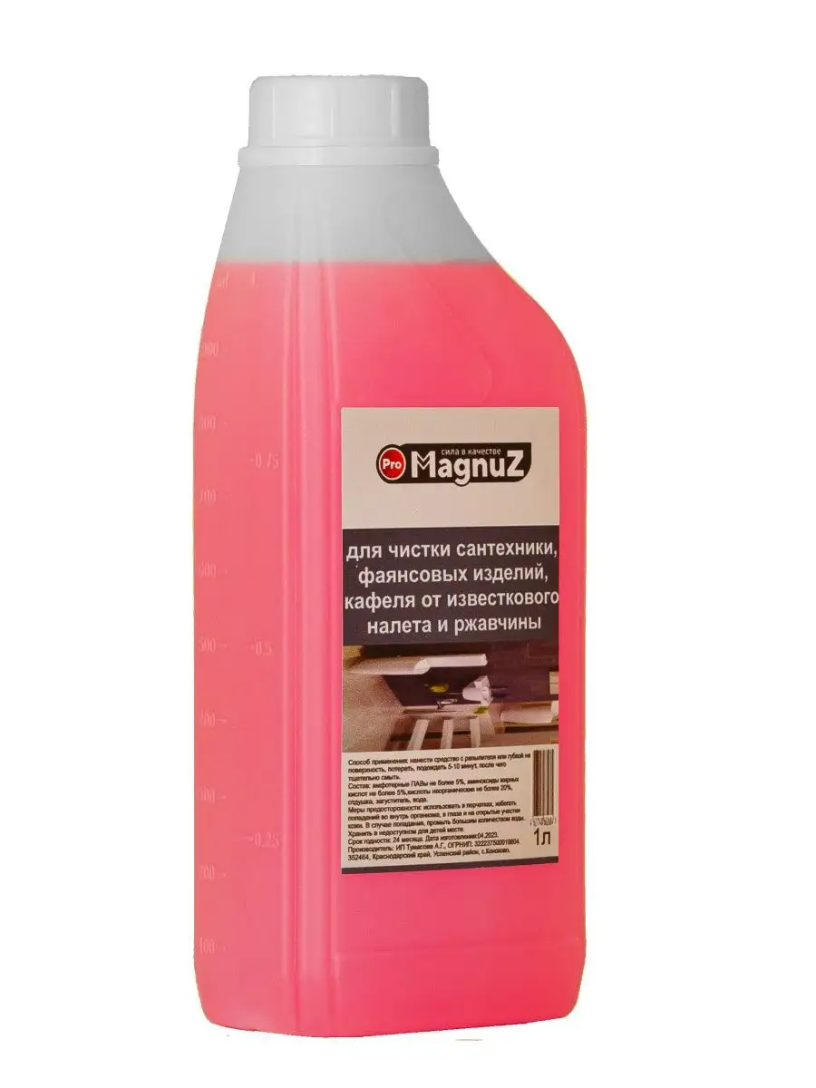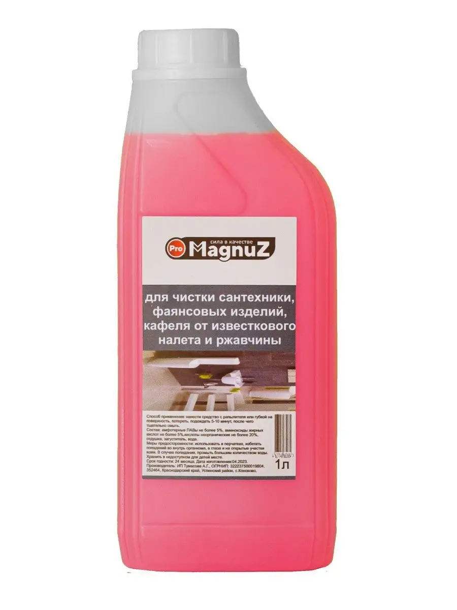 Описание: Средство для чистки сантехники для ванной и туалета 1 литр - эффективное чистящее средство разработано для уборки ванны и туалета, а также можно использовать для очистки поверхности кафеля, бассейна, фаянса, унитаза, раковины, плитки и прочей сантехники и поверхностей. Средство для сантехники настолько эффективно и действенно, что способно удалить ржавчину, жировые, органические, соловые и известковые налеты, удаляет водяной и мочевой камни и известковые образования. Чистящий средство для сантехники не имеет резкого неприятного запаха и подходит для ежедневного использования. Средство от ржавчины хватает надолго,но для более экономного расхода рекомендуем использовать распылитель для нанесения на поверхность. Способ применения: Нанести или распылить жидкость на поверхность и обработать ее с помощью тряпки для уборки, губки, затем смыть водой. В случае очень сильных загрязнений повторить обработку. С помощью бытовой химии MAGNUZ даже генеральная уборка в доме проходит легко и быстро. Добавляйте бренд MAGNUZ-PRO в любимые бренды и будьте в курсе наших новинок и акций.