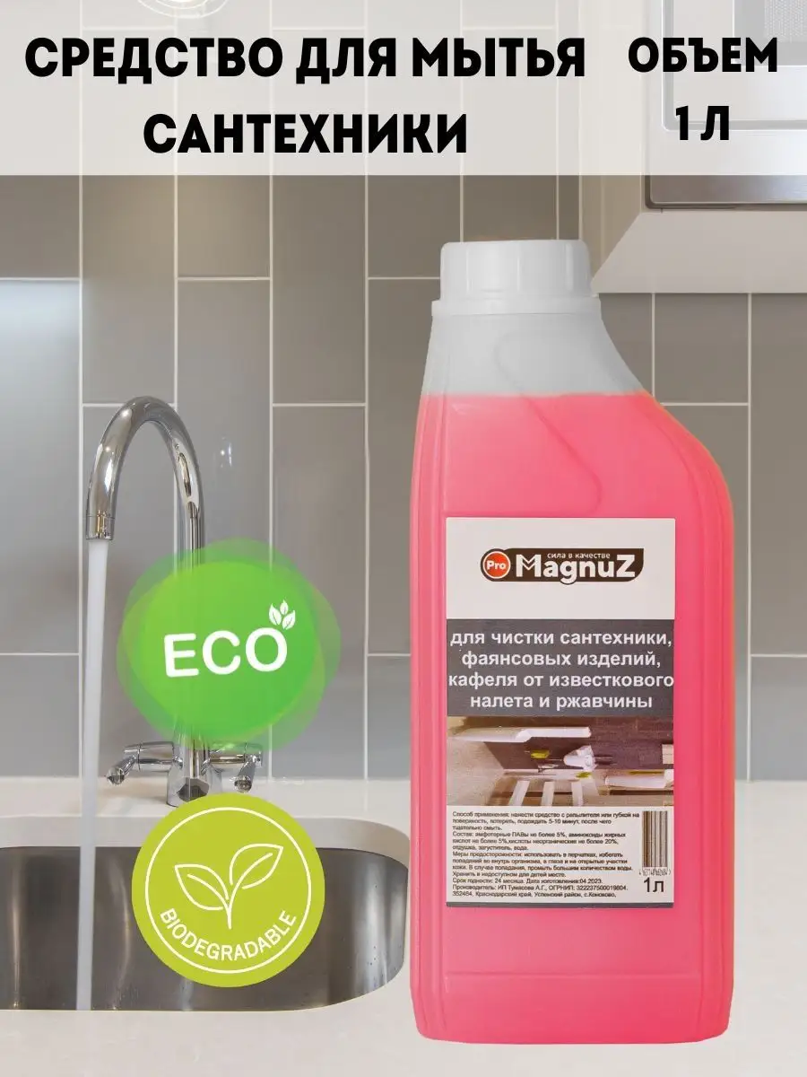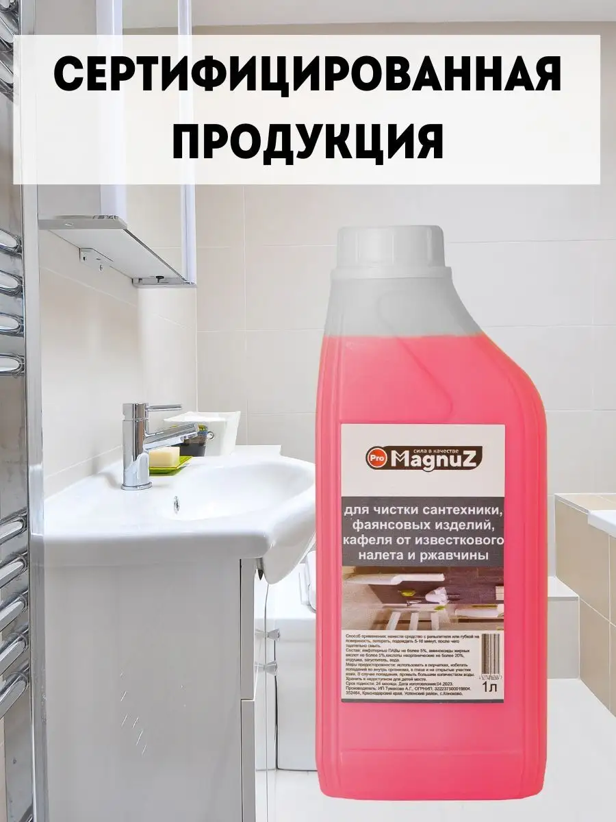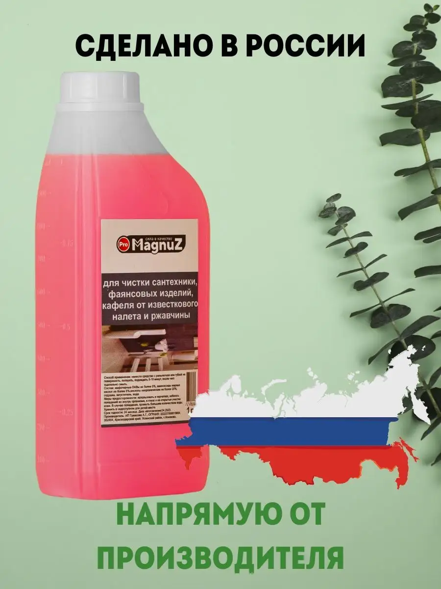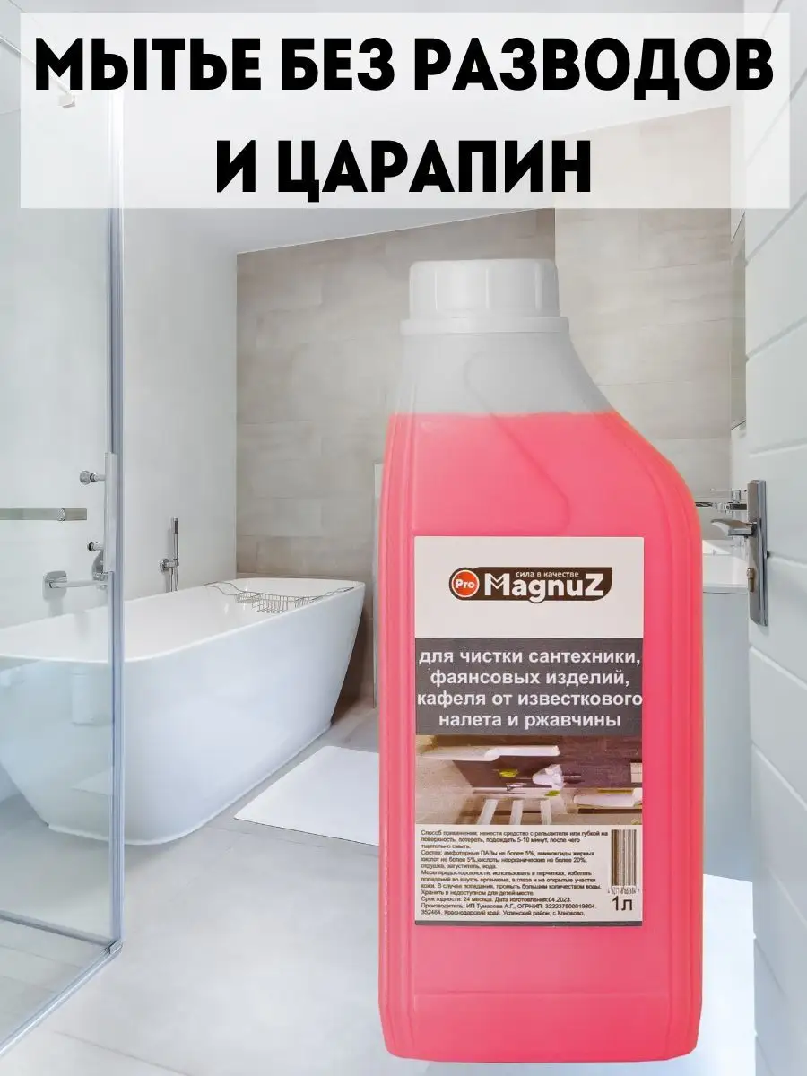 Описание: Средство для чистки сантехники для ванной и туалета 1 литр - эффективное чистящее средство разработано для уборки ванны и туалета, а также можно использовать для очистки поверхности кафеля, бассейна, фаянса, унитаза, раковины, плитки и прочей сантехники и поверхностей. Средство для сантехники настолько эффективно и действенно, что способно удалить ржавчину, жировые, органические, соловые и известковые налеты, удаляет водяной и мочевой камни и известковые образования. Чистящий средство для сантехники не имеет резкого неприятного запаха и подходит для ежедневного использования. Средство от ржавчины хватает надолго,но для более экономного расхода рекомендуем использовать распылитель для нанесения на поверхность. Способ применения: Нанести или распылить жидкость на поверхность и обработать ее с помощью тряпки для уборки, губки, затем смыть водой. В случае очень сильных загрязнений повторить обработку. С помощью бытовой химии MAGNUZ даже генеральная уборка в доме проходит легко и быстро. Добавляйте бренд MAGNUZ-PRO в любимые бренды и будьте в курсе наших новинок и акций.