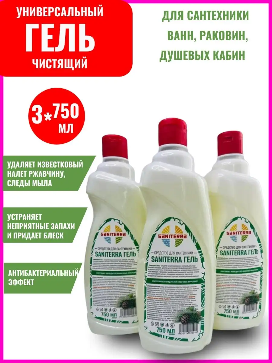 Описание: Чистящие средства Saniterra в наборе 3 штуки рекомендуется использовать для очищения загрязнений - эмалированной сантехники, душевых кабин, хромированных кранов, унитаза, раковин, ванн, кафельных покрытий и пластиковых панелей. Гель удаляет известковый налет, следы мыла, очиститель ржавчины и другие хозяйственные загрязнения. Придает блеск и белизну. Устраняет неприятные запахи, уничтожитель микробов. Универсальное жидкое гелеобразное средство для чистки SANITERRA со свежим ароматом шишек незаменим для чистки, мытья и уборки дома, туалета, кухни, полов в комнатах, дачи, кафе. Уничтожает возбудителей кишечных инфекций. Содержит антибактериальный компонент. Способ применения: перед использованием взболтать, небольшое количество средства нанести на загрязненную поверхность, оставить на 10-15 минут, почистить с помощью щетки или губки, обильно промыть обработанную поверхность водой. Обязательно использовать резиновые перчатки. Перед применением проверить средство на незаметном участке обрабатываемой поверхности. Срок годности 24 месяца. Состав: вода подготовленная, 5% неионогенные ПАВ, лимонная кислота, ароматизатор, краситель, 5-15% анионные ПАВ, щавелевая кислота. Каждая хозяйка оценит нашу новинку в бытовой химии еще и как антиржавчину, жидкость универсал, моющее средство. У нас есть акции и распродажи, вы можете купить наши товары в подарок со скидкой!