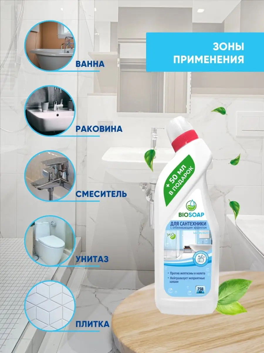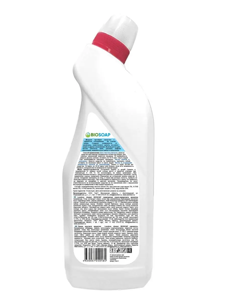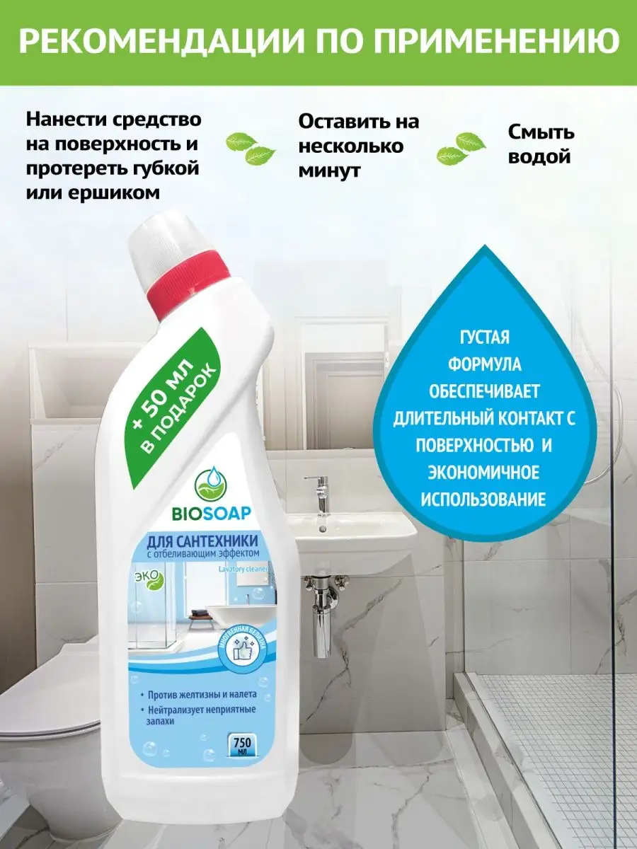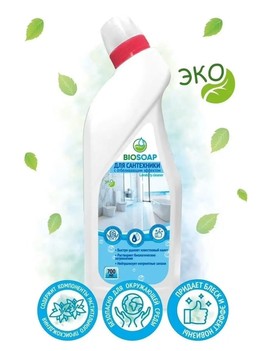 Описание: Экологичное мощное чистящее средство для унитаза и сантехники с эффектом отбеливания на основе хлора. Успейте купить хозяйственные товары и бытовую химию для дома по низкой цене до конца недели! Эффективная гелевая формула с густой консистенцией обеспечивает экономичное использование и эффективно очищает керамические и кафельные поверхности от желтизны, известкового налета, мочевого камня и других загрязнений. Отлично подходит для уборки кухни, туалета и ванной комнаты. Используется для чистки унитазов и биде; ванн и раковин; писсуаров; душевых кабинок, кафеля, сантехники, межплиточных швов и герметиков. Нейтрализует неприятные запахи и придает аромат чистоты и свежести. Подходит для устранения неприятных запахов из канализации. Безопасно для окружающей среды. Способ применения: нанести средство Biosoap на обрабатываемую поверхность, оставить на 10-15 мин. и смыть водой. Можно использовать щетку или ершик для унитаза. Внимание: Не подходит для применения в домах с автономной системой очищения (септики) ! У нас всегда можно купить Premium товары для уборки и по уходу за домом в подарок по акции, со скидкой или на распродаже! очиститель, товары для кухни и дома, туалетный утенок, утенок для унитаза, химия для уборки