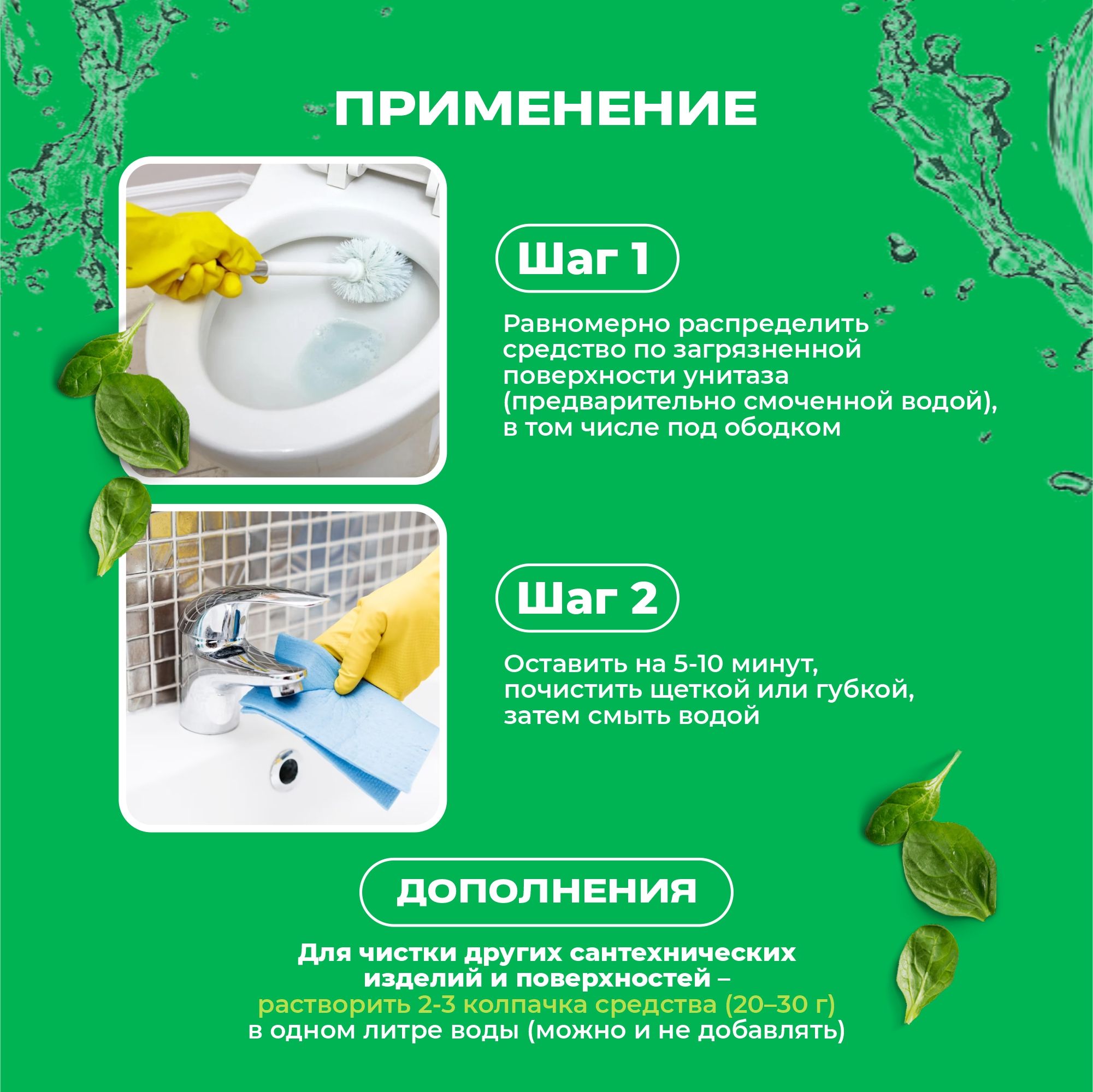 • ПРИМЕНЕНИЕРавномерно распределить средство по загрязненной поверхности унитаза (предварительно смоченной водой), в том числе под ободком, оставить на 5–10 минут, почистить щеткой, затем смыть водой. Для чистки других сантехнических изделий и поверхностей — растворить 2–3 колпачка средства (20–30 грамм) в одном литре воды.