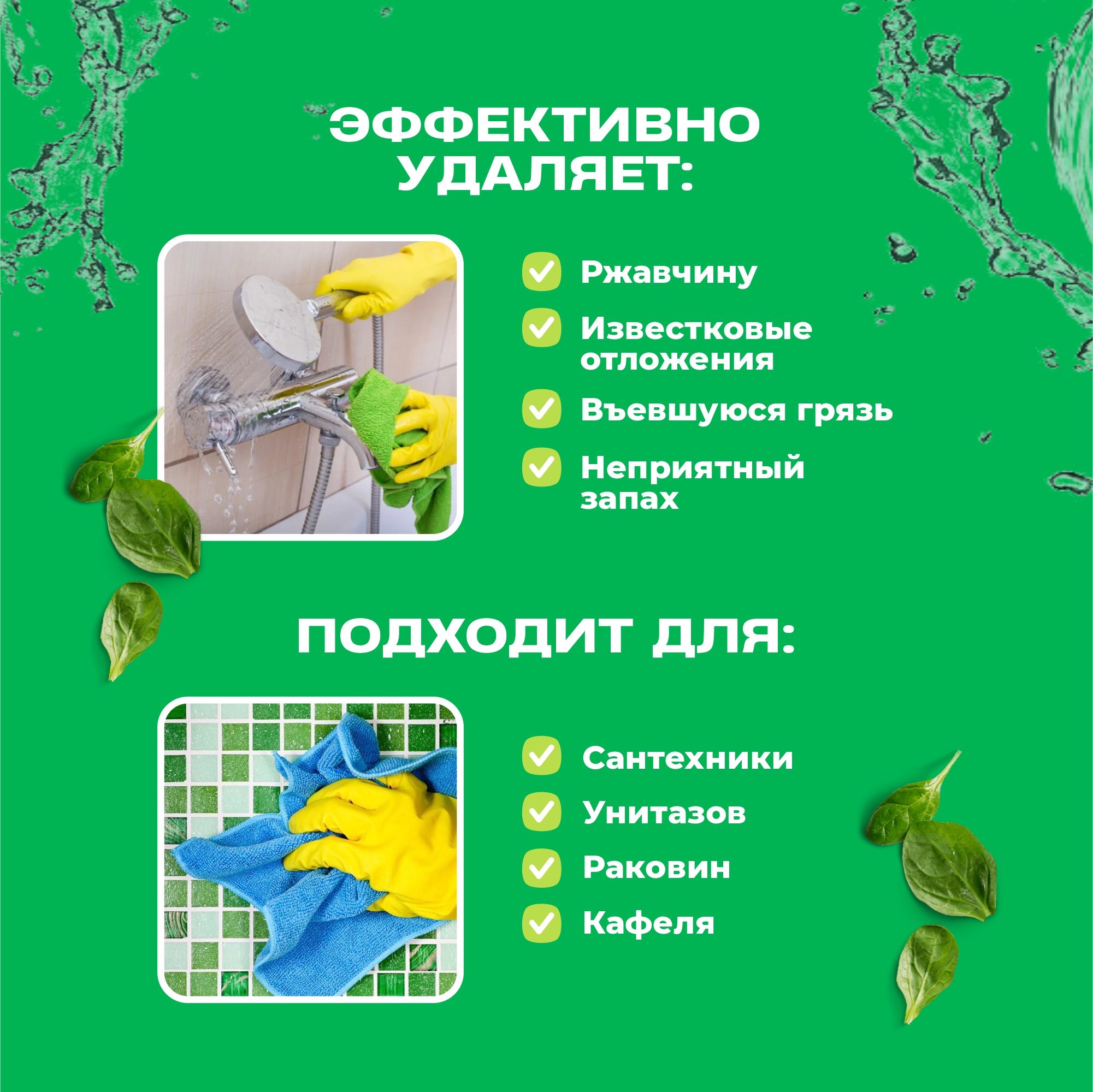 Придает чистоту и блеск сантехнике, а также устраняет сам налет, источники неприятного запаха и не оставляет после себя никаких следов, только свежесть-полный комплект и дезинфекция для микробов и бактерий, возбудителей любых кишечных инфекций, убивает вирусы.