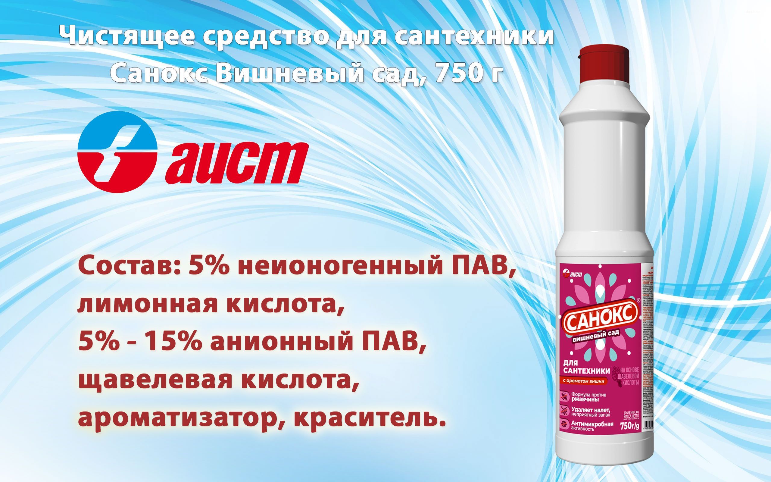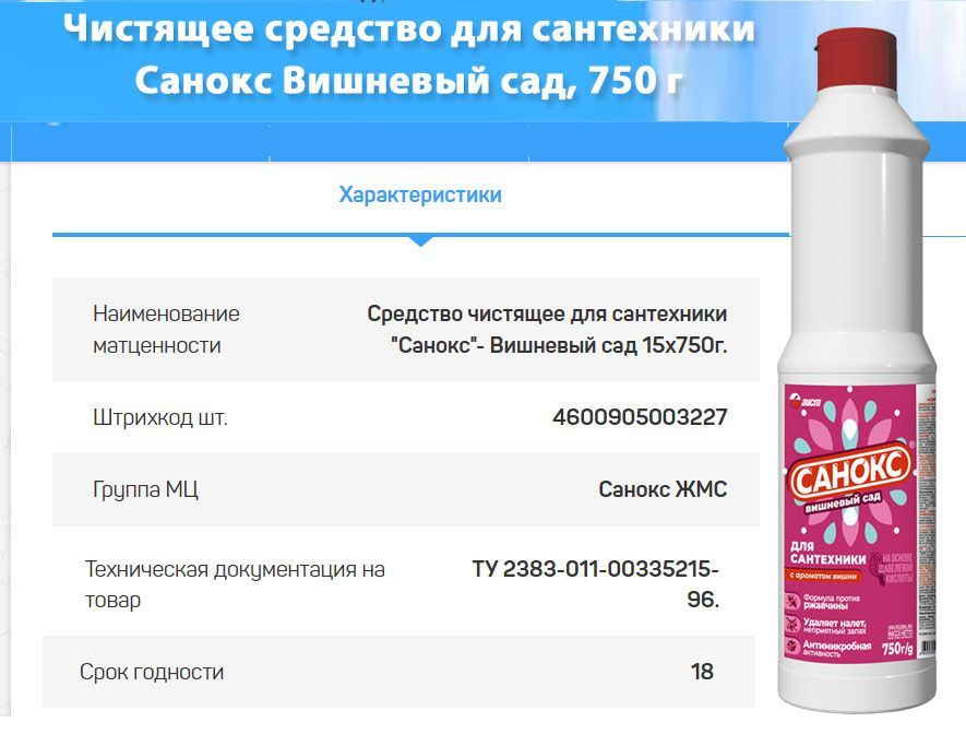 Описание: Чистящее средство для сантехники Санокс Вишневый сад, 750 гСредство на основе щавелевой кислоты.