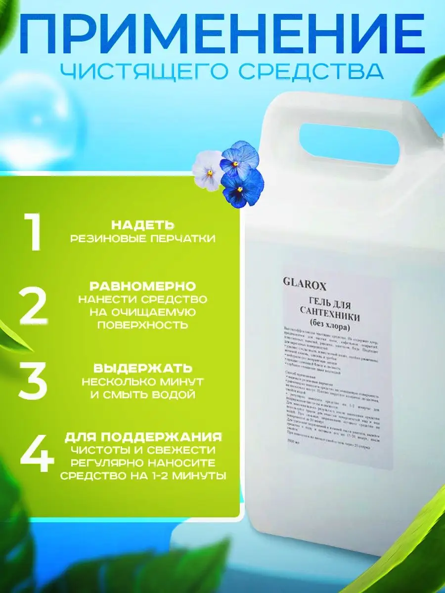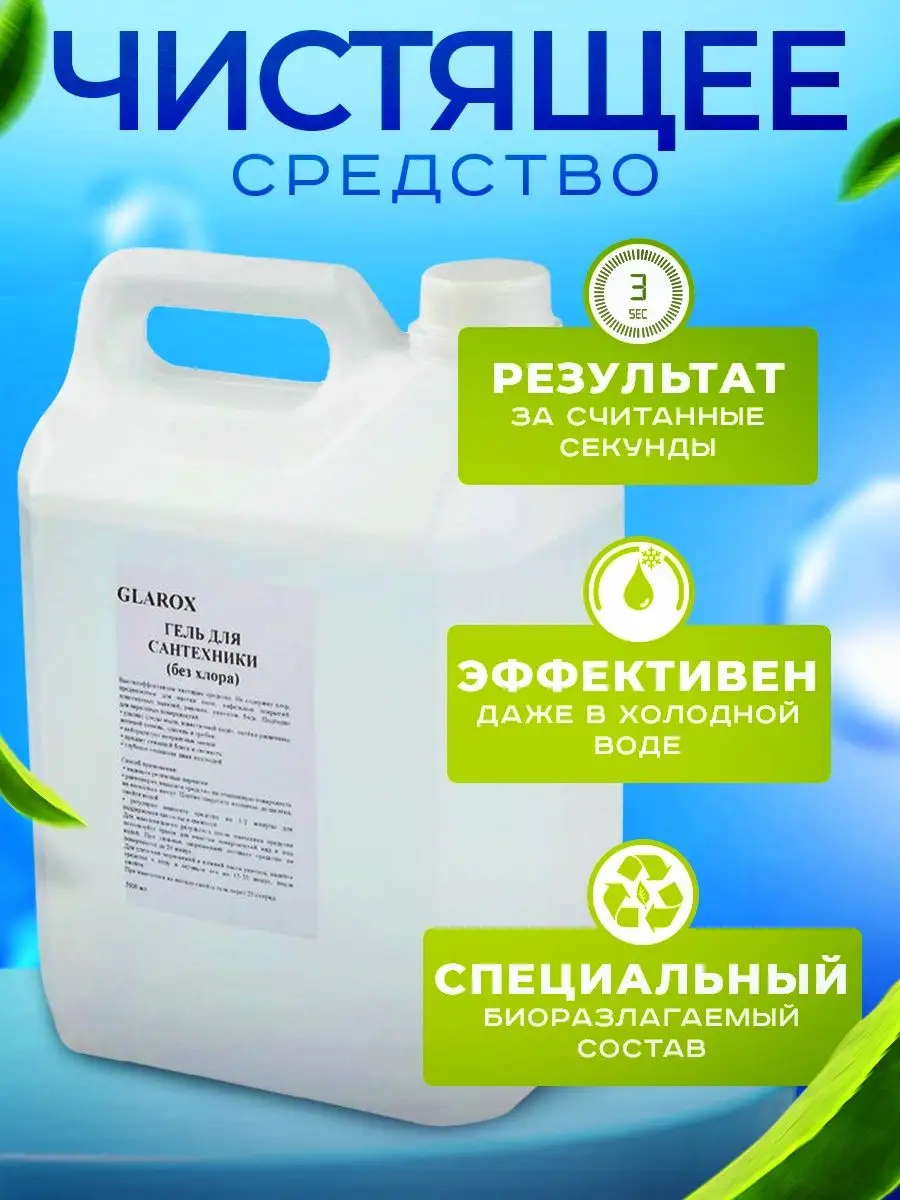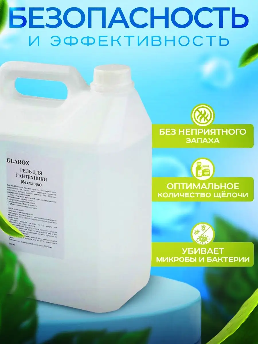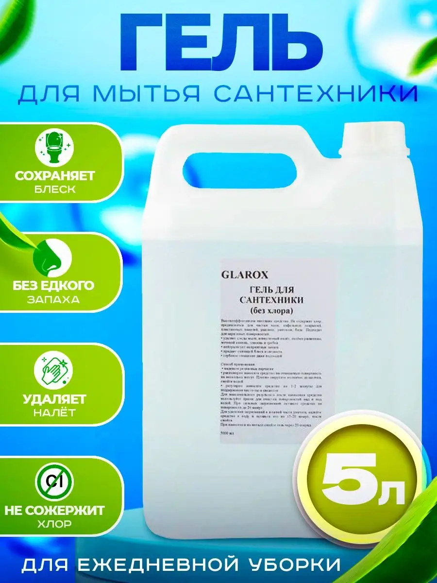 Описание: Очищающий гель для уборки GLAROX, объемом 5 л станет прекрасным помощником в уборке душевых кабин, сантехники, унитаза и кафеля. Эффективно устраняет известковый налет, потеки ржавчины, камень и минеральные отложения. Мягкий гель для наведения порядка полностью смывается водой, безопасен для септических установок. Чистящее средство GLAROX разработано с учетом всех потребностей и требований наших клиентов. Отсутствие хлора, делает его безопасным для использования на всех поверхностях. Экологический сертификат подтверждает биоразлагаемость, безопасность и эффективность средства. Гелеобразный состав качественно обволакивает поверхности при нанесении. Инструкция по применению: нанести на обрабатываемую область, оставить на несколько минут, почистить и смыть. Бытовая химия GLAROX это современные эко товары для дома, квартиры и дачи, имеющие уникальную формулу синергетического действия, позволяющую быстро бороться с загрязнениями даже в холодной и жесткой воде. Защищает покрытия от бактерий и гарантирует максимальную гигиену в вашем доме. У нас есть акции и распродажи, можете купить наши товары в подарок со скидкой!