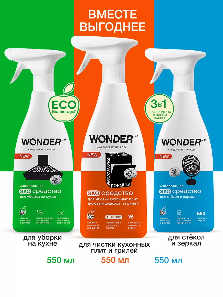 Описание: Средства для уборки на кухне и в ванной WONDER LAB. Наборы для уборки WONDER LAB - это набор с экологичными средствами для ежедневной уборки, состоящий из трёх чистящих средств. В состав эко наборов входят: - Средство Антижир - супермощное средство, разработанное специально для чистки кухонных плит, духовых шкафов и грилей. Эффективно удаляет застарелый жир и нагар всего за 30 секунд! Отлично устраняет неприятные запахи. - Чистящее средство для уборки на кухне Вандер Лаб - подходит для очистки любых кухонных поверхностей плиты, духовые шкафы, фартуки и фасады мебели, вытяжки, микроволновые печи, смесители и раковины. Очистит поверхность от жирных пятен и других типичных загрязнений, устраняет неприятные запахи. - Чистящее средство для мытья стекол и зеркал - разработано для ежедневного ухода за окнами, зеркалами, мониторами, глянцевыми поверхностями и люстрами. Покупая бокс, вы экономите до четверти стоимости каждого флакона. Средства WONDERLAB сделаны на основе уникальной и инновационной формулы BIOMICROGEL. Компонент не нарушает экосистему водоемов, разлагается в природе на 98% за 1 день. Мы называем наши продукты экологичными, потому что основа биомикрогели, который разлагается на 98 процентов за 24 часа. Средства мы делаем из овощей и фруктов. Наши средства не содержат синтетические АПАВ, SLS, SLES, фосфаты, фосфонаты, компоненты, содержащие активный хлор и прочее без потери моющей способности. Каталог бытовой химии WONDER LAB разнообразен. Вы можете ознакомиться со всем ассортиментом Вандер Лаб - нажав на логотип бренда справа.