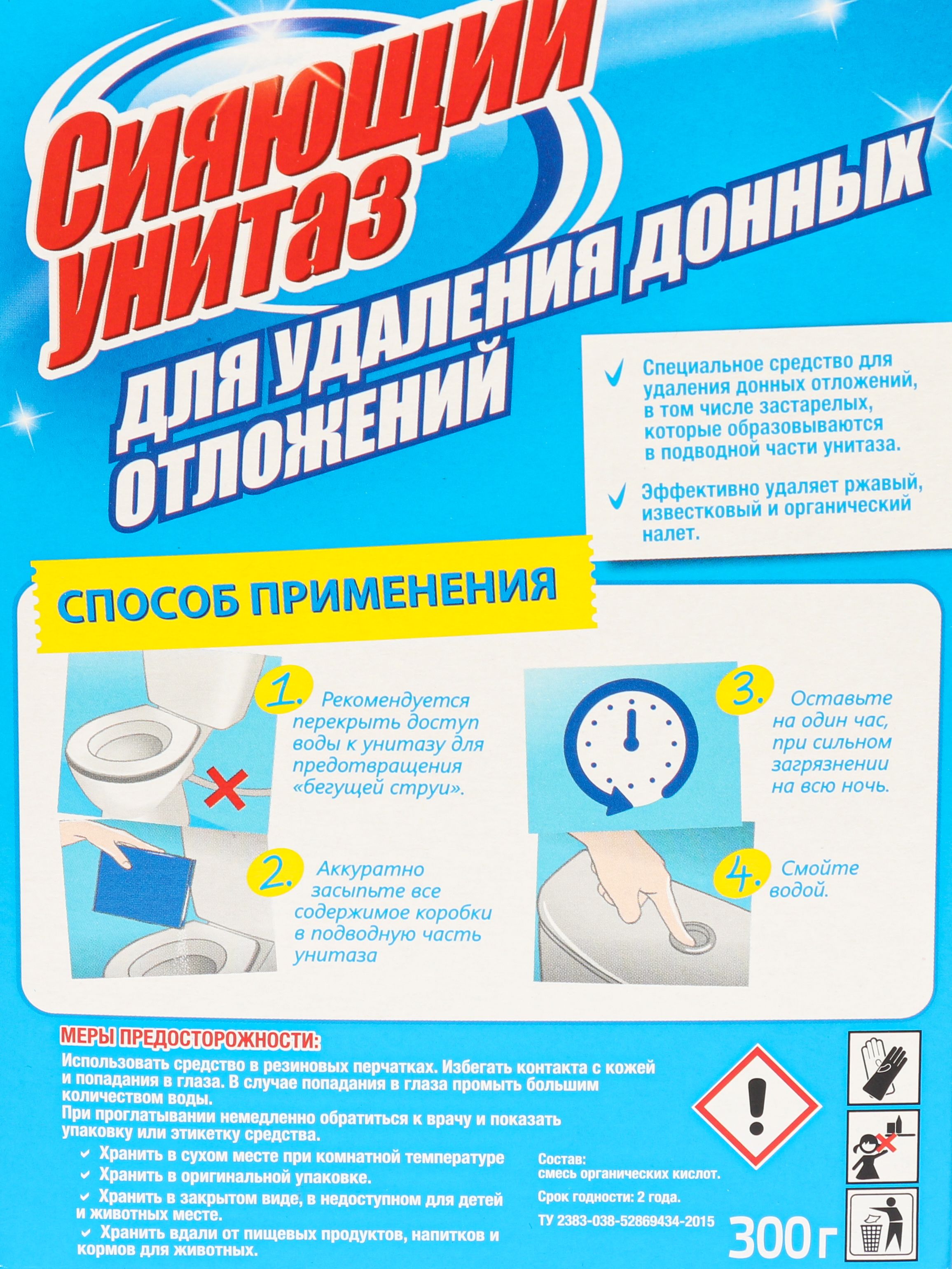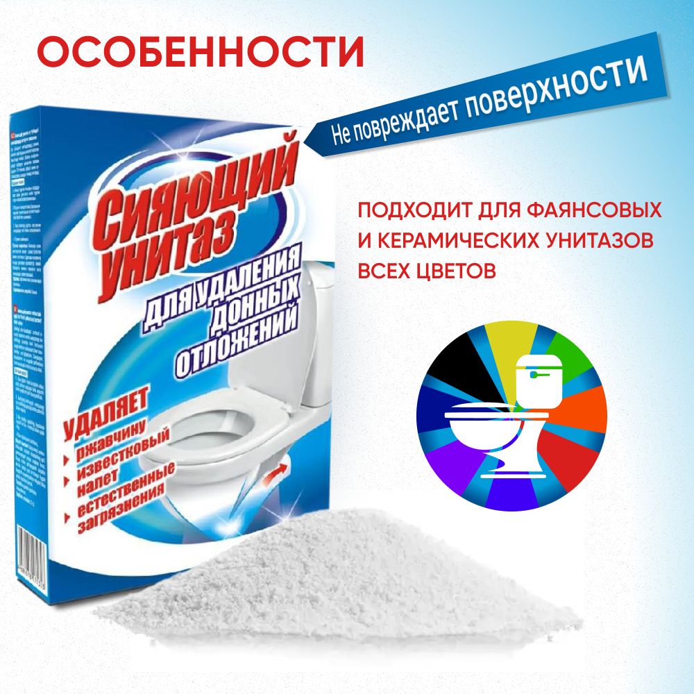 Описание: Средство для туалета Сияющий унитаз для удаления донных отложений эффективно очищает загрязнения в подводной части унитаза. Прост в применении.