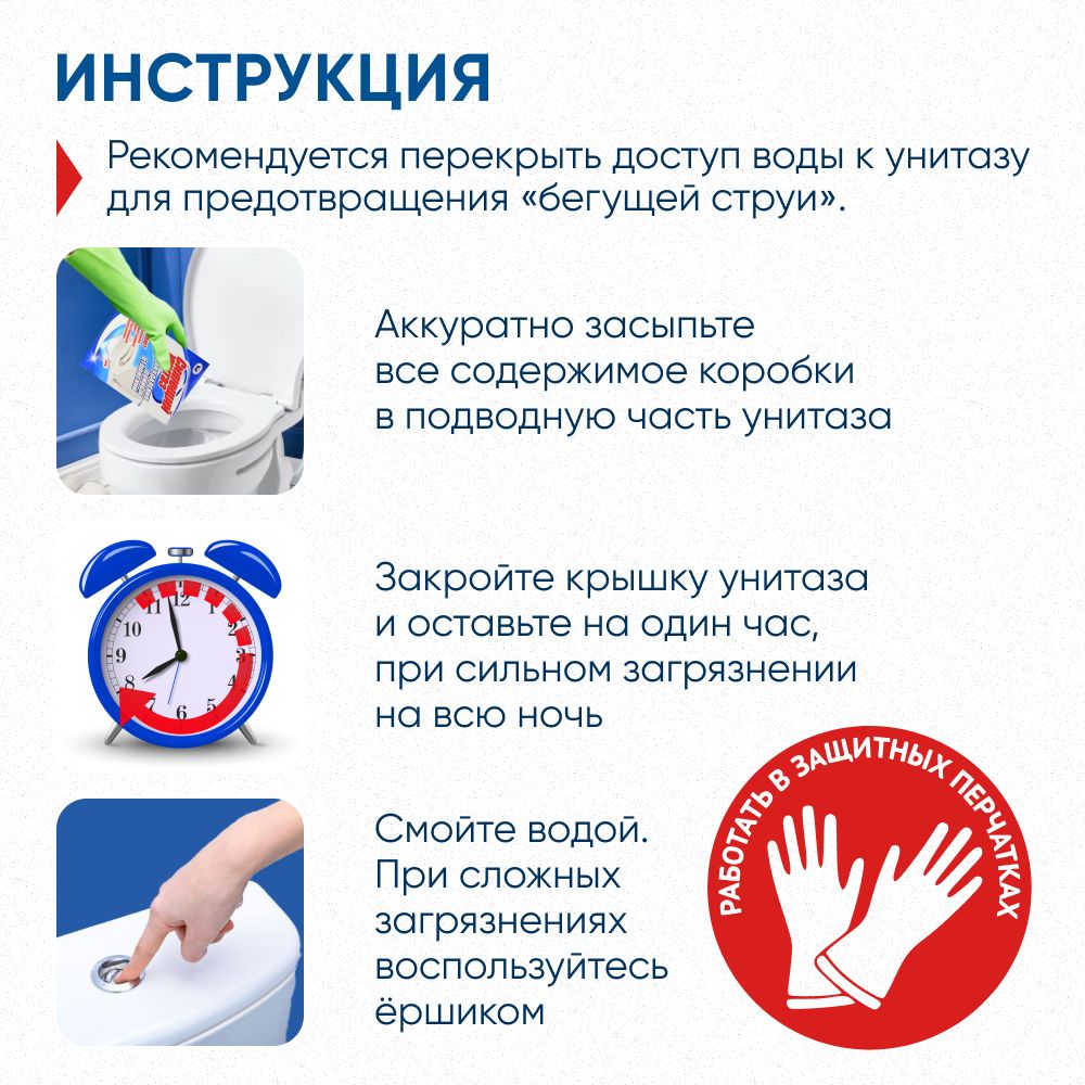 -засыпать средство для туалета в объеме одной коробки в подводную часть унитаза