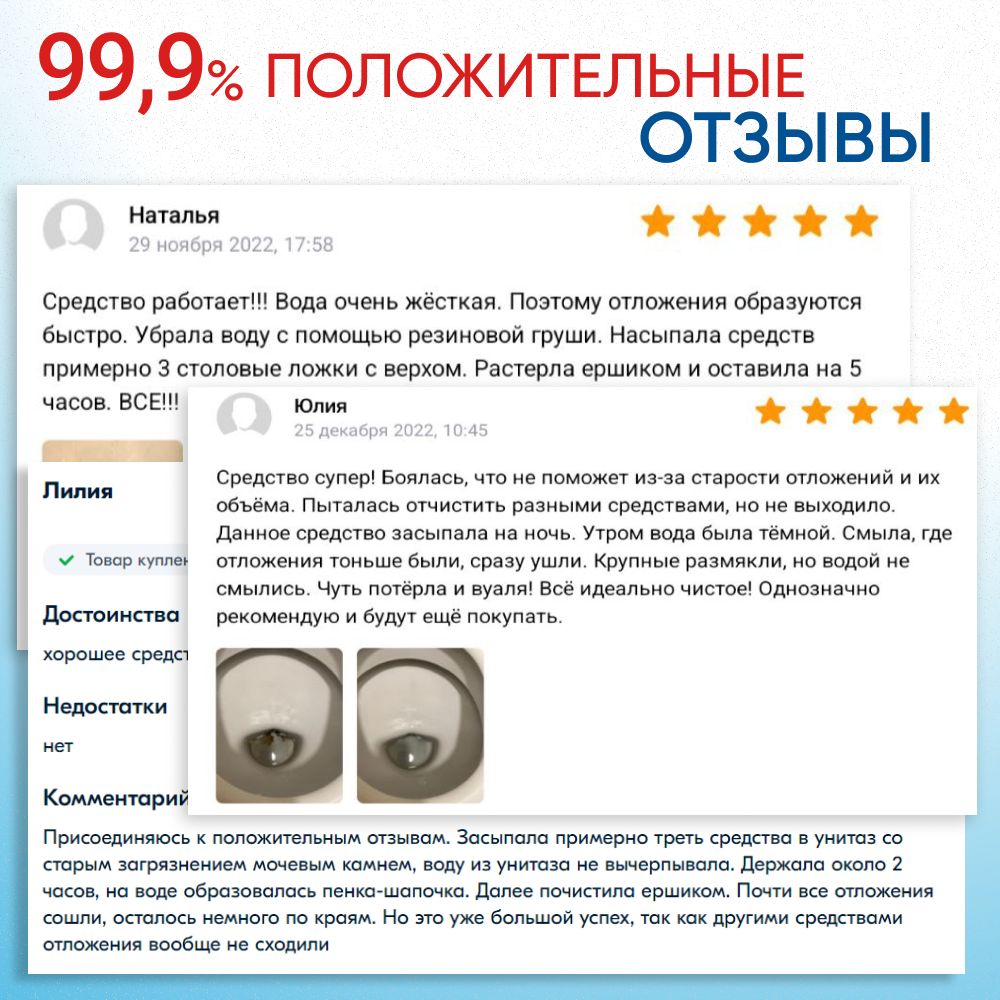 Устраняет неприятный запах и продлевает срок эксплуатации сантехники. Не повреждает поверхность унитаза, в отличие от скребков и пемзы.