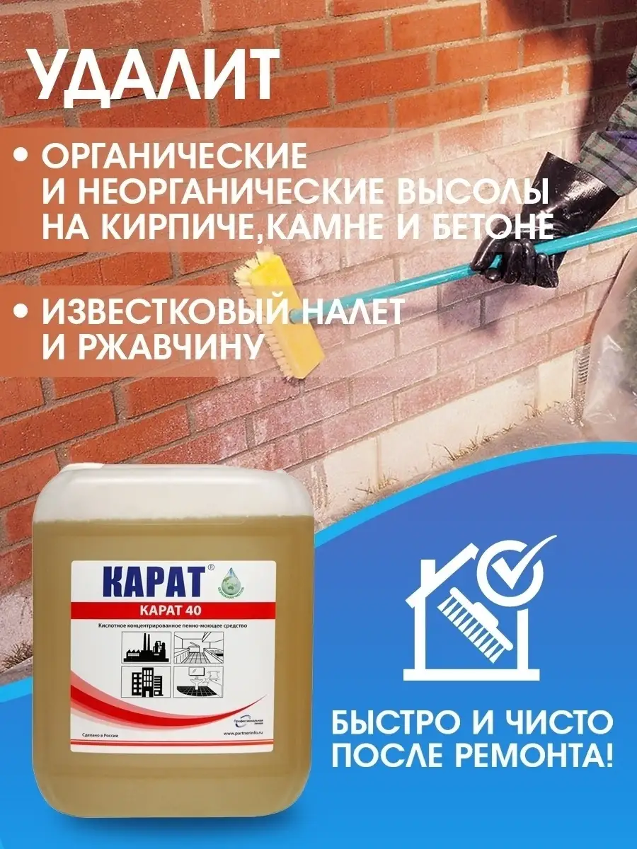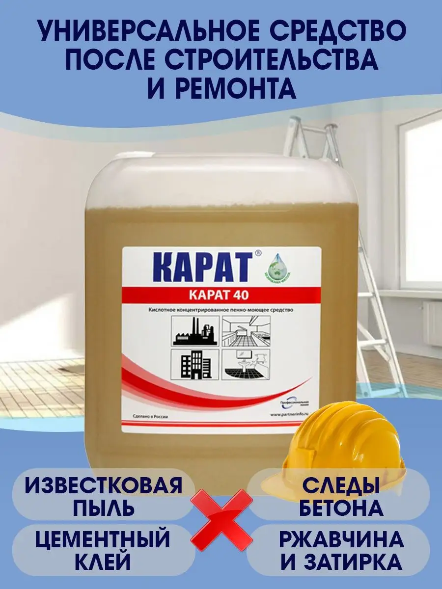 Описание: Универсальное чистящее средство (концентрат) после ремонта и строительства Карат 40. Объем 5л. Очиститель от производителя! Мощный концентрат, который без труда поможет справиться со сложнейшими загрязнениями. Средство для уборки - это концентрированное кислотное пенное средство КАРАТ 40 для удаления следов бетона, цемента и цементного клея, разводов от побелки, ржавчины, высолов на кирпичной кладке и гранитных плитах, кафеле, керамике и пластике, от бетонных брызг. Очиститель стен, окон, пола и потолка и других поверхностей. жидкость для уборки предназначена как для внутренней, так и для наружной уборки ( улица, сад и огород, внешние стены дома, отмостка и уличная плитка, дорожки, забор). Поможет справится с удалением строительных смесей и других загрязнений, оставшихся после строительства или ремонта. Моющее средство удалит загрязнения на кухне, в ванной и туалете, душевой. Устранит ржавчину и налеты, плесень и грибок. Обеспечивает очистку полов, дверных косяков и подоконников. Карат 40 – это отличное средство для удаления известкового налета, водного камня, ржавчины. Строительный очиститель после ремонта - это экономный расход и удобное использование. Надежная упаковка. Устранит неприятные запахи. Инструкция по разведению находится на этикетке! Распылять запрещено!!! Очищает от остатков кладочного раствора, извести. Удалитель пятен и цемента. Рекомендован для удаления плиточного клея и затирки для швов в помещении, подходит против известкового налета и для удаления ржавчины с металла. очиститель плиточных швов. Подходит для чистки оборудования для приготовления и транспортировки бетона. Для мытья форм при производстве и изготовлении тротуарной плитки и не только. для удаления копоти с фасадов зданий. Надежно упакован. Экономичный расход. Чистящее средство 5 литров.
