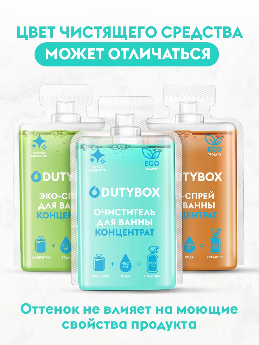 Уборка в ванной станет проще и быстрее. Средство Дьютибокс подходит для чистки акриловых и других типов ванн, душевых кабин, пластиковых панелей, унитаза, фаянсовых изделий, кафеля, сантехники от известкового налета, подтеков ржавчины, мыльных разводов и солевых отложений. Способ применения: отрежьте ножницами горлышко одной капсулы и смешайте её содержимое с 450 мл воды, накрутите распылитель и перемешайте. Готовое средство нанесите на загрязненную поверхность, немного подождите, потрите губкой и смойте водой. При необходимости повторите процедуру. Не вдыхайте! При работе с концентратом, используйте резиновые перчатки.