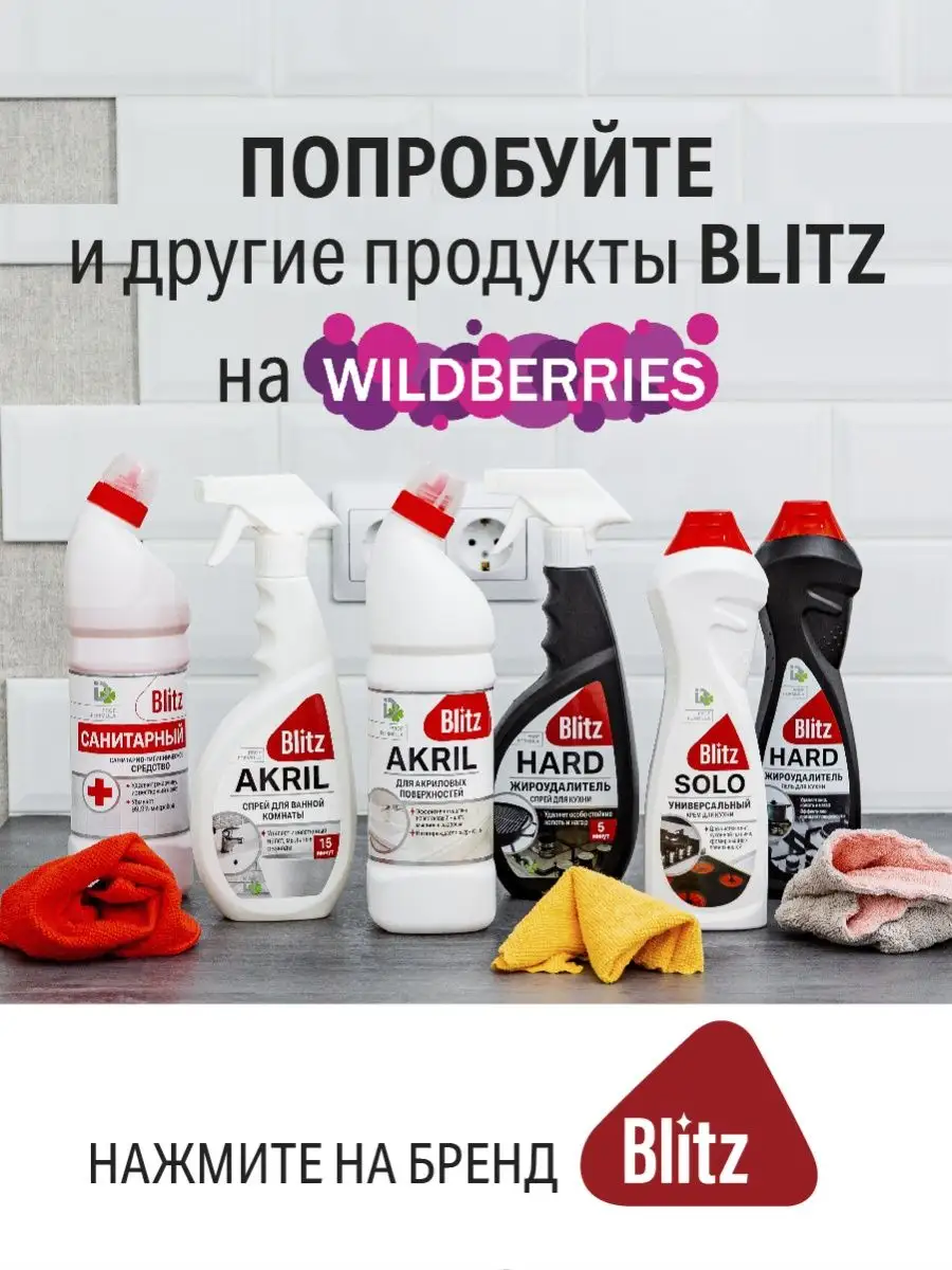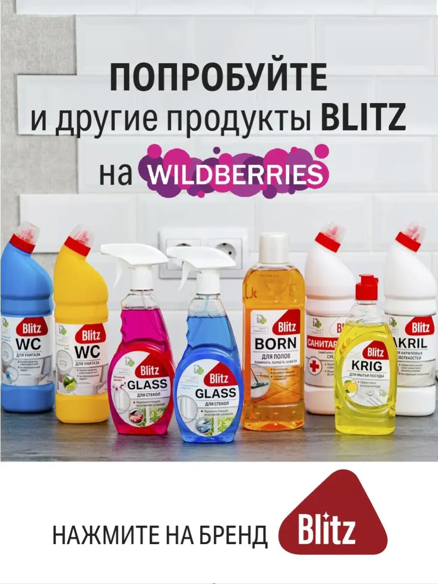 Описание: Чистящее средство для унитаза, ванны и раковин BLITZ Интенсивный Лайм 750 мл – универсальный гель для уборки от ржавчины и удаления известкового налета, от плесени и грибка, от мочевого камня. Густой гель концентрат для чистки сантехники удерживается на вертикальных стенках, удобная форма "утенок" позволяет легко наносить гель даже в труднодоступные места, эффективен для профилактики чистки труб от засоров. Удалитель против ржавчины с антибактериальными свойствами может применяться для дезинфекции поверхностей на кухне как очиститель для мытья плитки и кафеля, уборки за животными кошачьего туалета, нейтрализует неприятные запахи в санузлах. В разбавленном виде жидкость для мытья полов и моющее средство для натяжного потолка. Антиржавчина для любых покрытий, в том числе акрила и пластика, акриловых ванн и душевых кабин, стеклокерамики, нержавеющей поверхности, пола. Способ применения: средство нанести щеткой или губкой на очищаемую поверхность, оставить на 3-5 минуты, смыть водой. На страничке бренда BLITZ представлена бытовая химия для уборки дома и хозяйственные товары для профессиональной обработки.