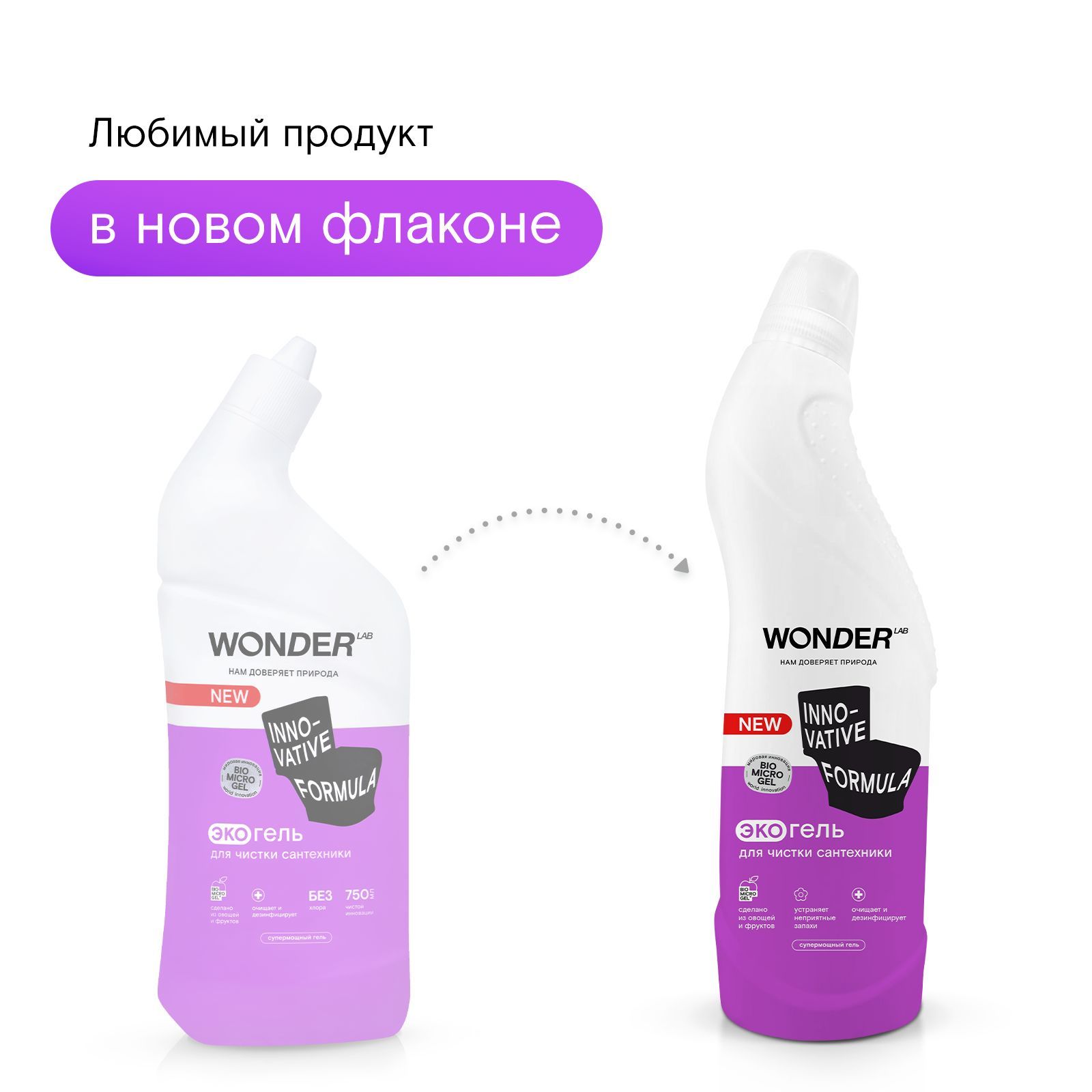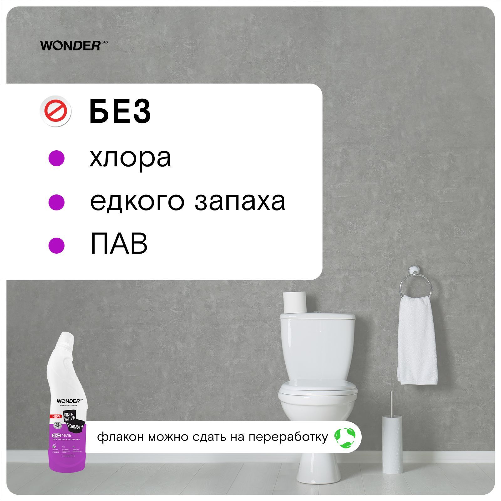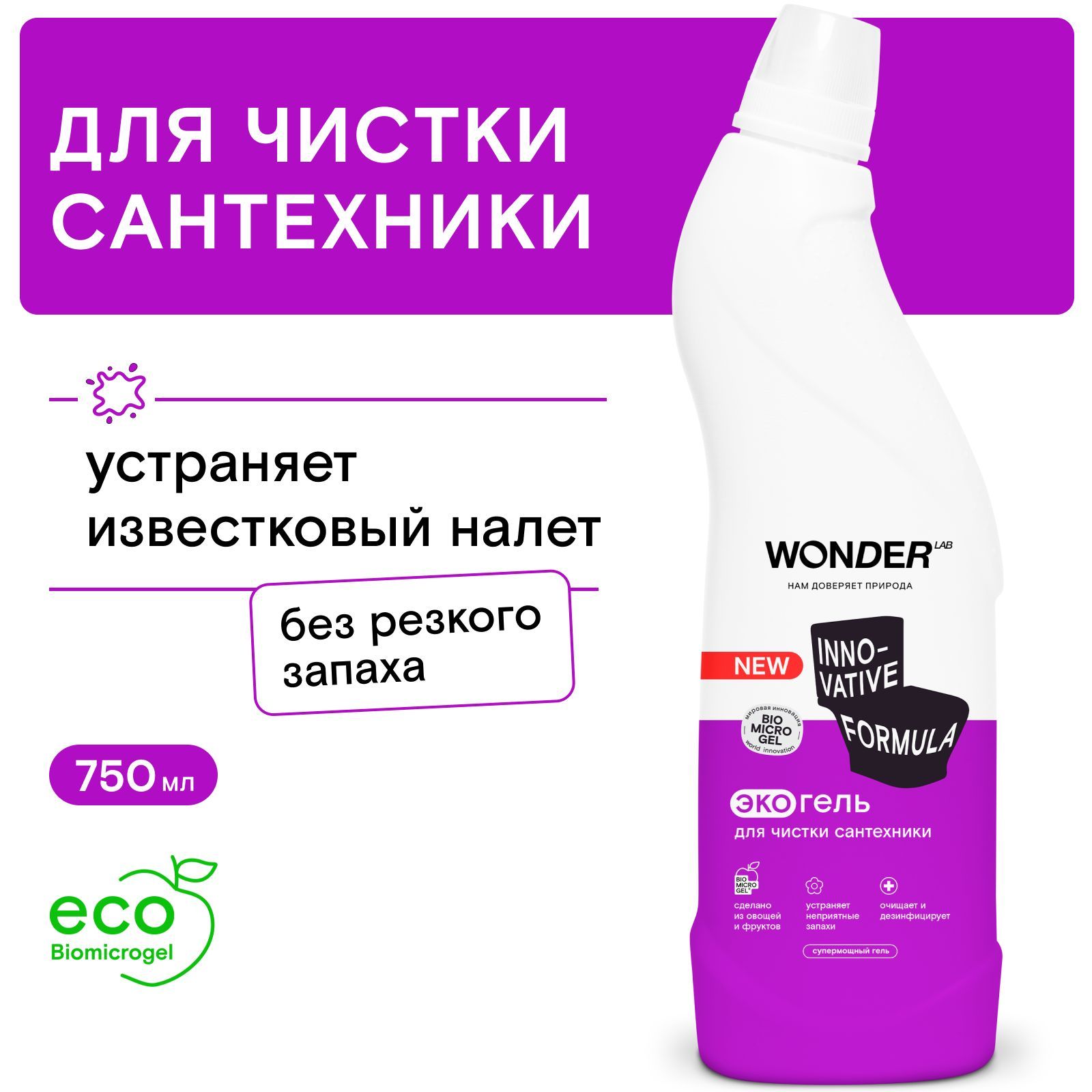 Чистящее средство для унитаза экологичный гель для мытья сантехники, гель для унитаза WONDER LAB, без хлора и запаха, 750 мл