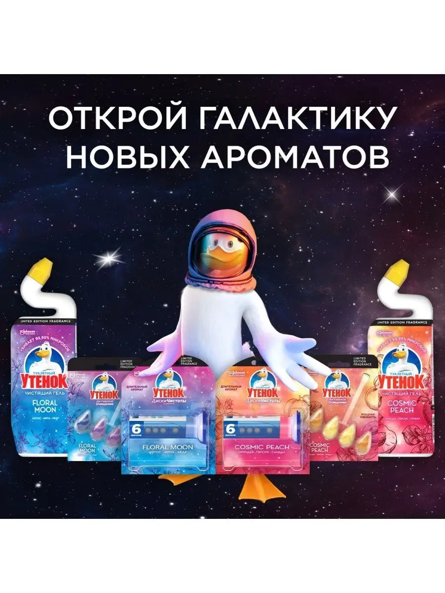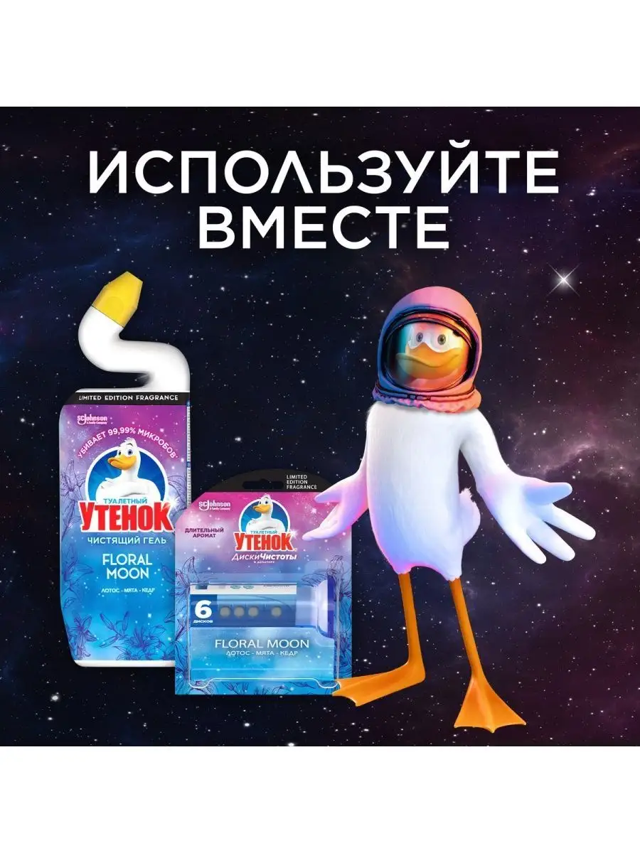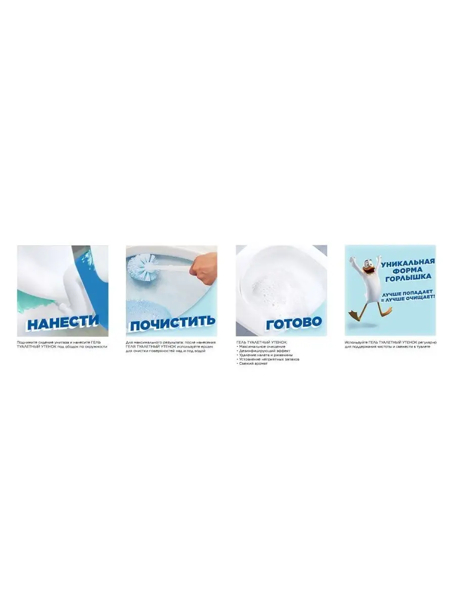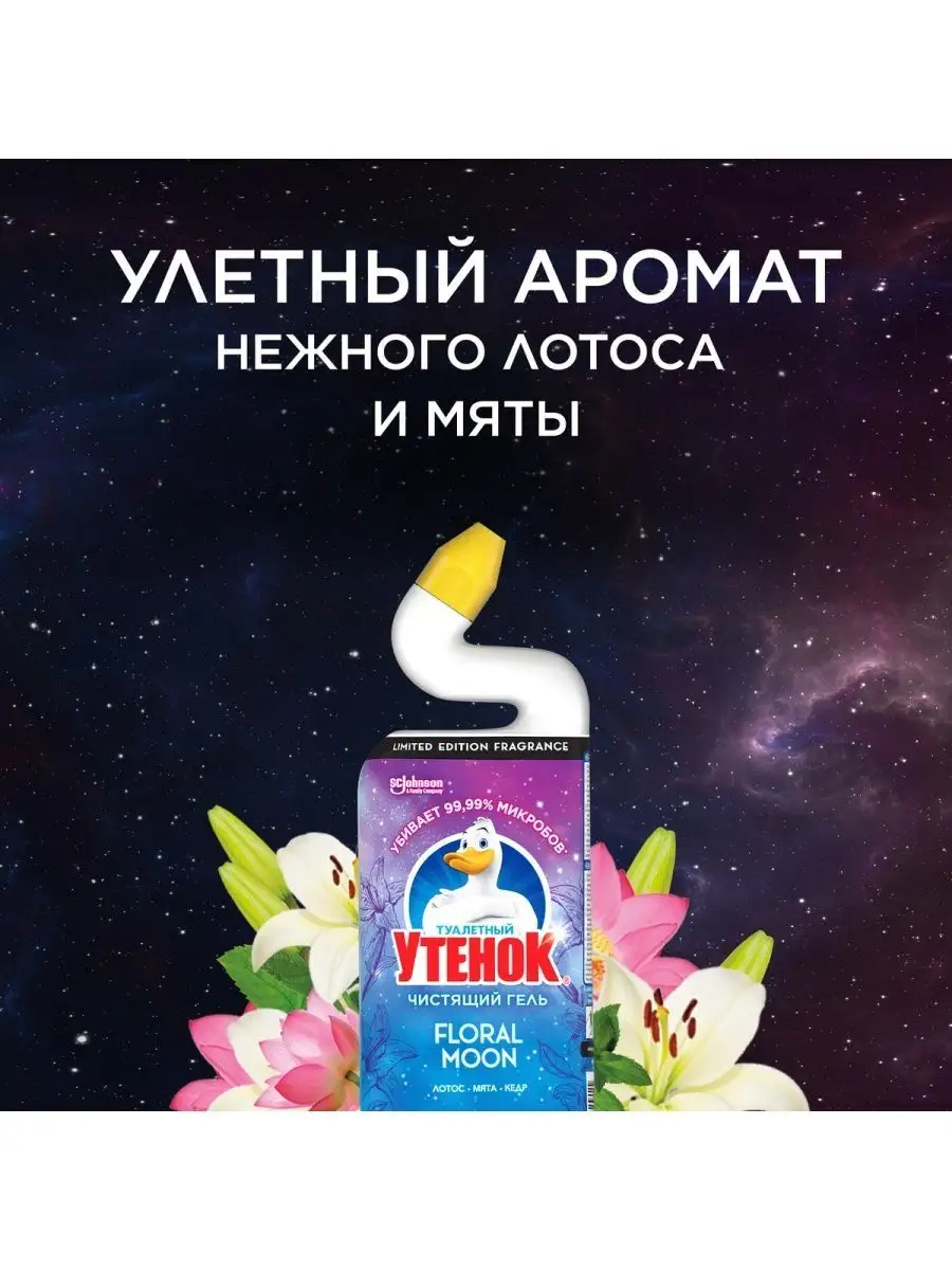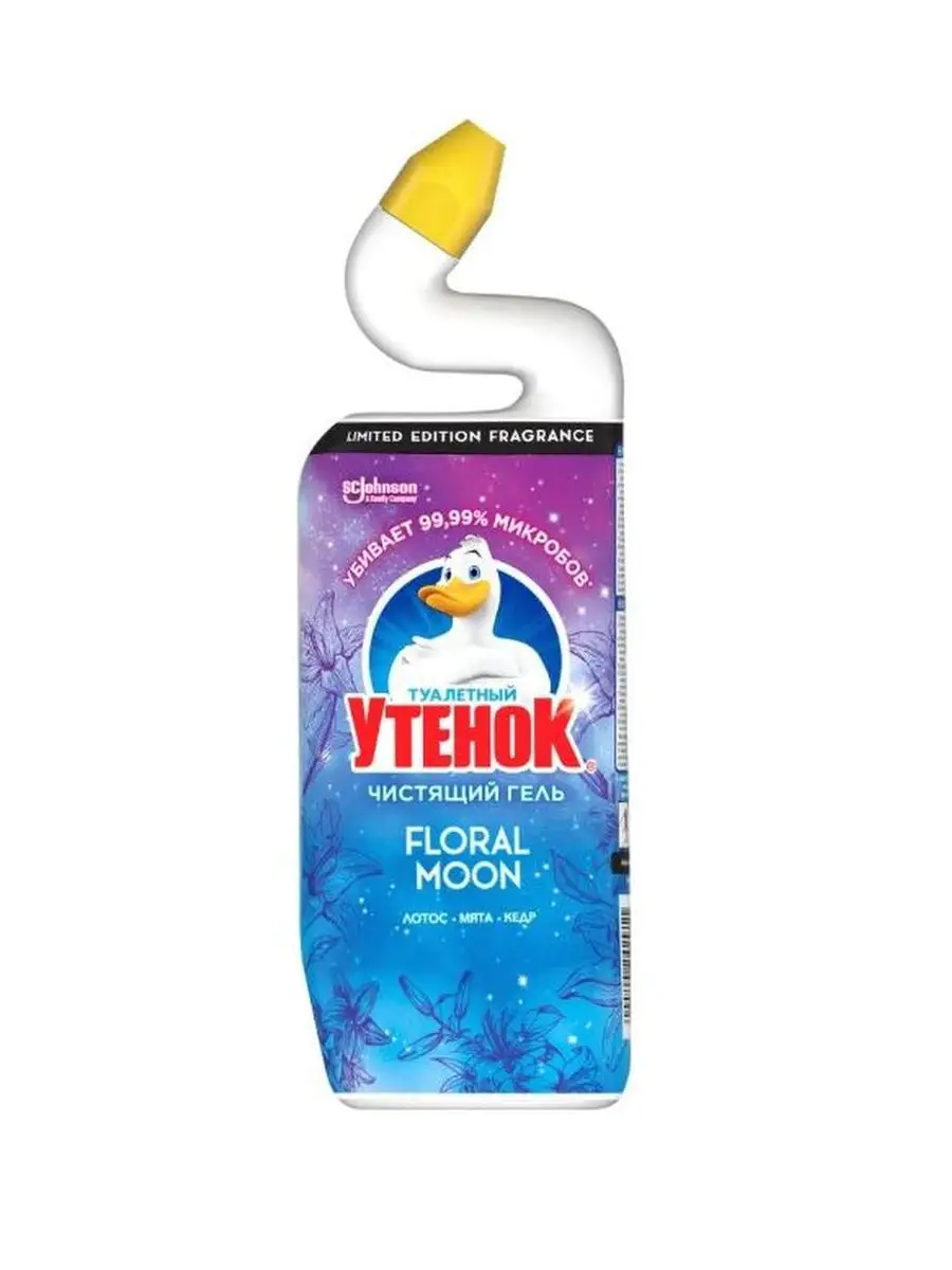 Описание: Туалетный утенок Чистящее средство для унитаза Floral Moon, 750 мл | Туалетный утенок | Супер эффективная формула чистящего средства для унитаза Туалетный Утенок справляется с самыми сложными проблемами: удаляет стойкие пятна, включая ржавчину и до 100% известкового налета, УБИВАЕТ 99,9% МИКРОБОВ и эффективен даже под водой. Благодаря уникальной форме горлышка бутылки лучше попадает в труднодоступные места скопления бактерий под ободком унитаза.