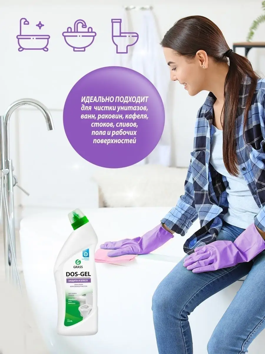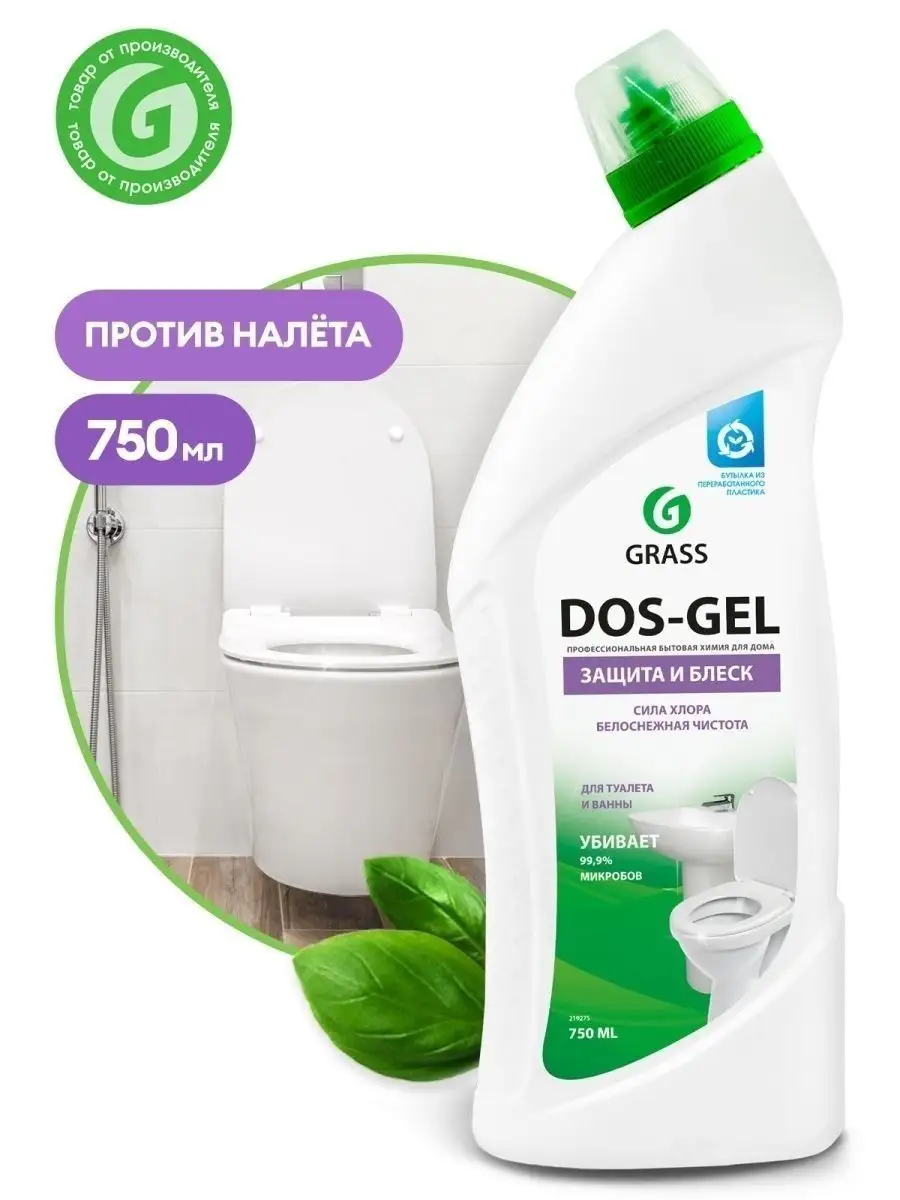 Описание: Чистящее средство для ванной и туалета Dos-gel Grass 750 мл - универсальное средство для уборки, подходящее для ежедневной уборки всех видов поверхностей в ванных комнатах и санузлах (гель для уборки, очиститель для унитаза). Моющее средство ДОС гель идеально подходит для чистки фаянсовых изделий на кухне и ванной комнаты, туалетов, акриловых ванн, раковин, кафеля, стоков, сливов, пола и рабочих поверхностей. Обладает дезинфицирующими свойствами, удаляет плесень и грибок. Пары защищают от микробов. Подходит для профилактики засоров и устранения неприятных запахов из сточных труб. Густая формула, заключенная в удобную бутылку, позволяет средству дольше оставаться на стенках, продолжая работать и обеспечивает его экономичный расход. Бытовая химия от Грасс - это эффективные средства для уборки вашего дома. Способ применения: для унитаза: нанести под ободок и оставить на несколько минут, потереть ершиком, смыть водой. Для ванной и раковины: нанести на поверхность, потереть щеткой или губкой, оставить на несколько минут, смыть водой. Для мытья пола и рабочих поверхностей: разбавить из расчета 60 мл на 5 л воды. Отбеливание белья, белизна: развести из расчета 15 мл на 5 л теплой воды, замочить белье в растворе и оставить на 45 минут, после чего тщательно прополоскать.