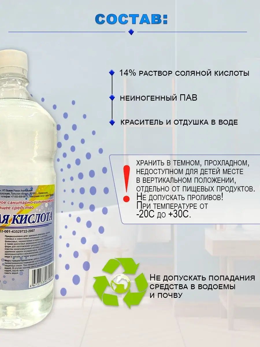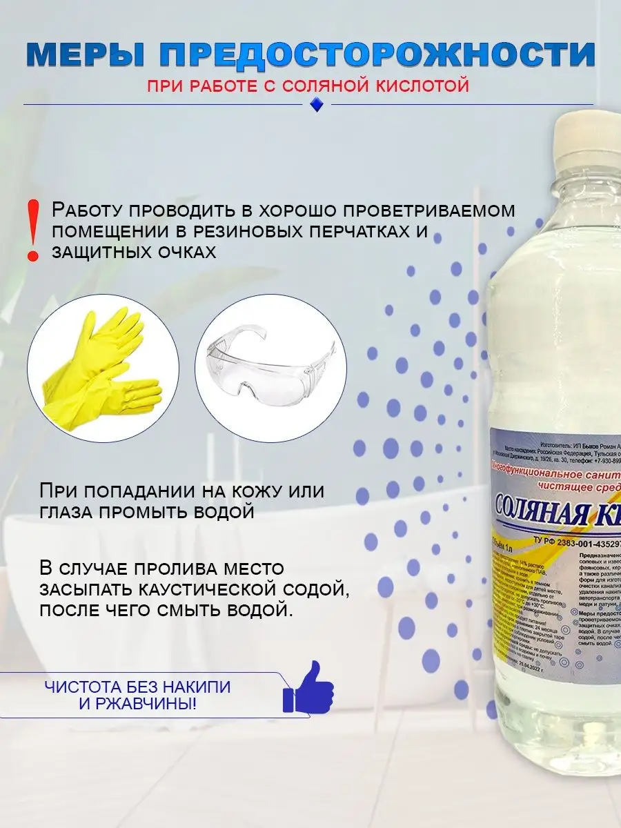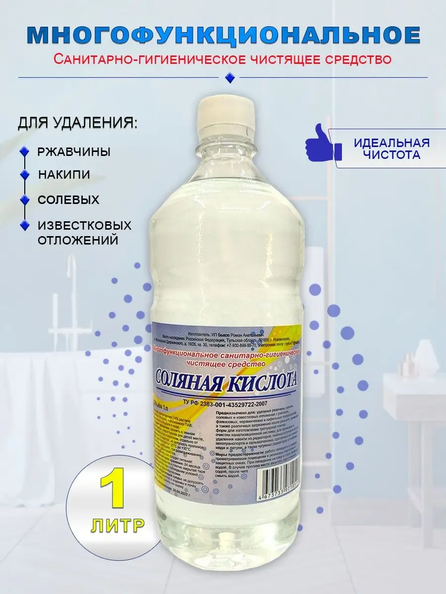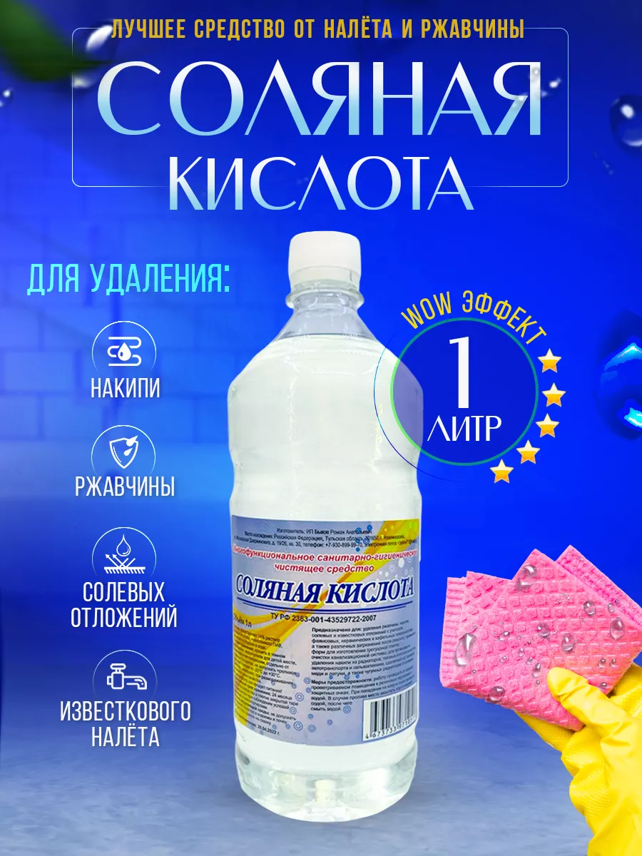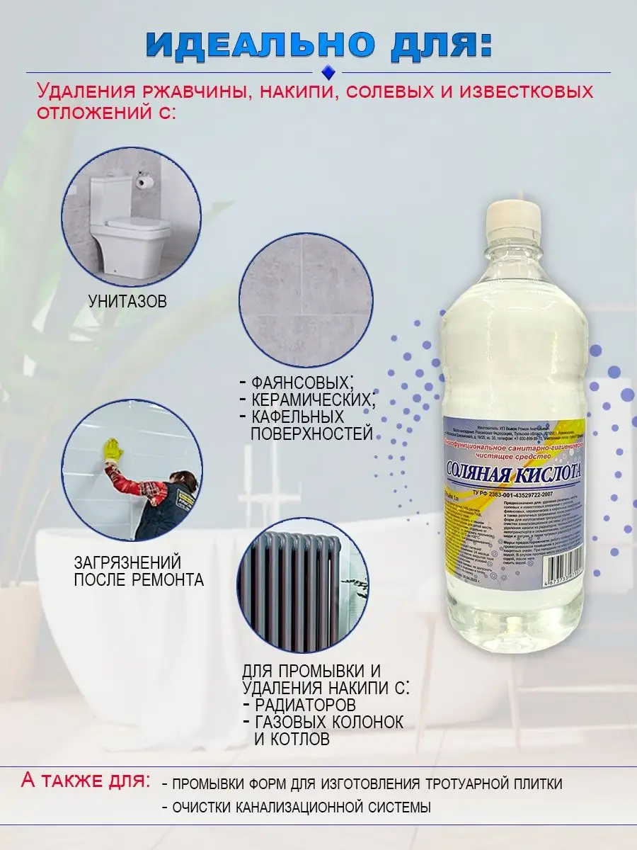 Описание: ВНИМАНИЕ! Может приходить в двух цветах (прозрачном или желтом) Средство для удаления известкового налета и ржавчины - является функциональным санитарно-гигиеническим чистящим средством. Кислота соляная незаменимое средство для чистки унитаза, кафеля, очистки канализации, ржавчины и удаления накипи. Хорошо подойдёт как чистящее средство для ванной и туалета от мочевого камня. Может использоваться для очистки фаянсовых, керамических и кафельных поверхностей, а также различных загрязнений после ремонта, в качестве средства для прочистки труб, для промывки и удаления накипи из радиаторов, газовых колонок и котлов, автотранспорта и сельхозтехники, сделанных из меди и латуни, а также чугунных радиаторов. При работе необходимо соблюдать меры предосторожности и правила безопасности. СПОСОБ ПРИМЕНЕНИЯ: Можно использовать в неразведенном водой виде. Распределить средство на загрязненную поверхность и оставить на 15 минут. Для очистки унитаза и труб можно заливать средство и выдерживать 1-2 часа. Отслоившиеся загрязнения убрать губкой или щеткой. Обильно смыть водой. При сильных загрязнениях процедуру можно повторить. МЕРЫ ПРЕДОСТОРОЖНОСТИ: Не употреблять как продукт питания! Работу проводить в хорошо проветриваемом помещении в резиновых перчатках и защитных очках. При попадании на кожу и глаза промыть водой. УСЛОВИЯ ХРАНЕНИЯ: Хранить в темном прохладном, недоступном для детей месте, в вертикальном положении, отдельно от пищевых продуктов, не допускать проливов. При температуре от -20С до +30С. Средство замерзает, при размораживании сохраняет свои свойства.
